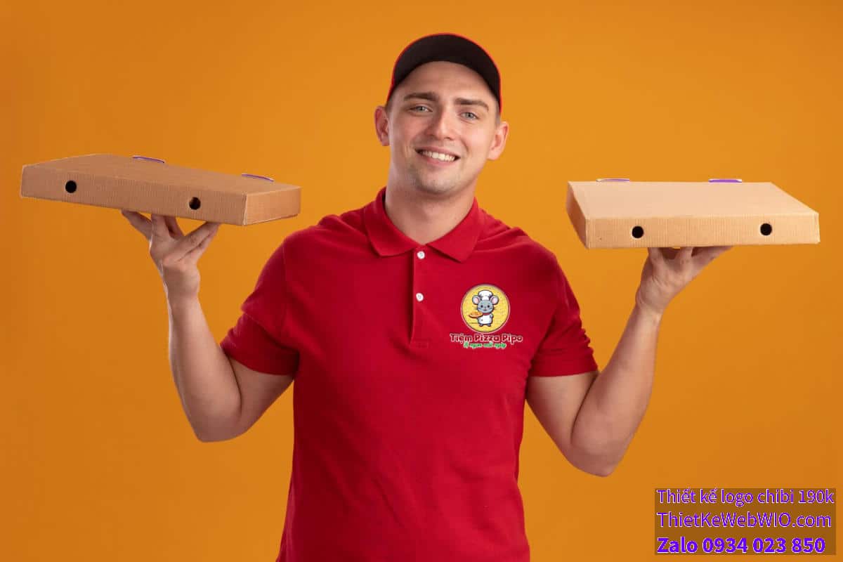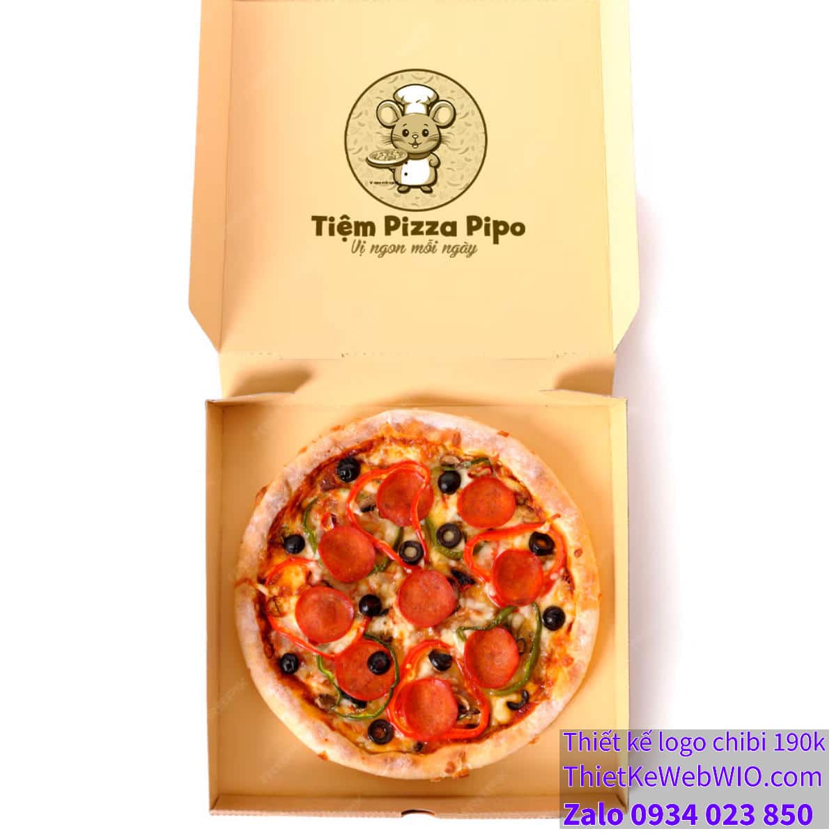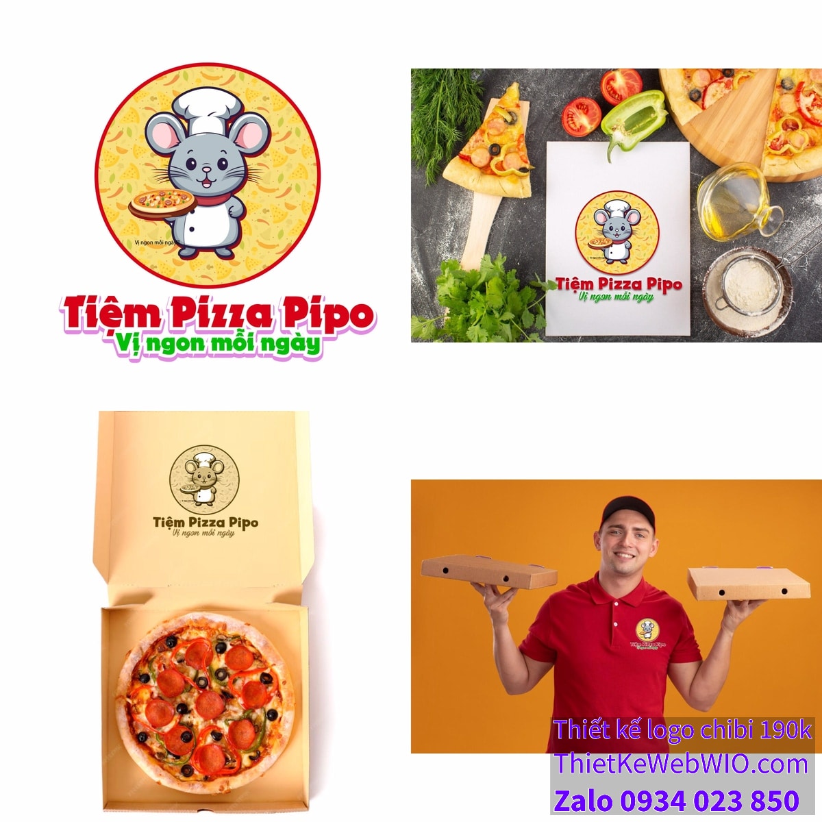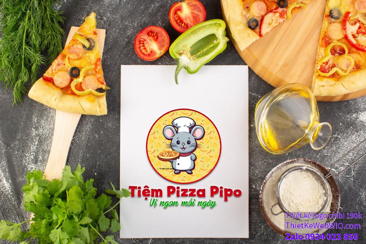 Tấm ảnh chibi chú chuột đầu bếp cầm bánh pizza này là hình vẽ đáng yêu của một chú chuột làm bếp với tên gọi “Tiệm Pizza Pipo”. Hình ảnh được thiết kế với phong cách hoạt hình, dễ thương và bắt mắt. Chú chuột mặc đồ bếp, đội mũ bếp và tay cầm một chiếc pizza nóng hổi. Bối cảnh của hình là nền họa tiết pizza với nhiều màu sắc rực rỡ, tạo cảm giác vui tươi và ngon miệng. Dưới hình là dòng chữ “Tiệm Pizza Pipo” với slogan “Vị ngon mỗi ngày” được thiết kế nổi bật và hài hòa.