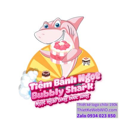 Tấm ảnh chibi chú cá mập hồng đang cầm bánh ngọt mô tả một hình...