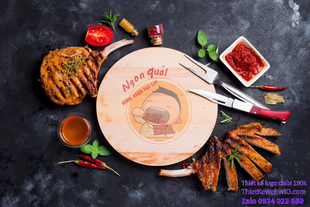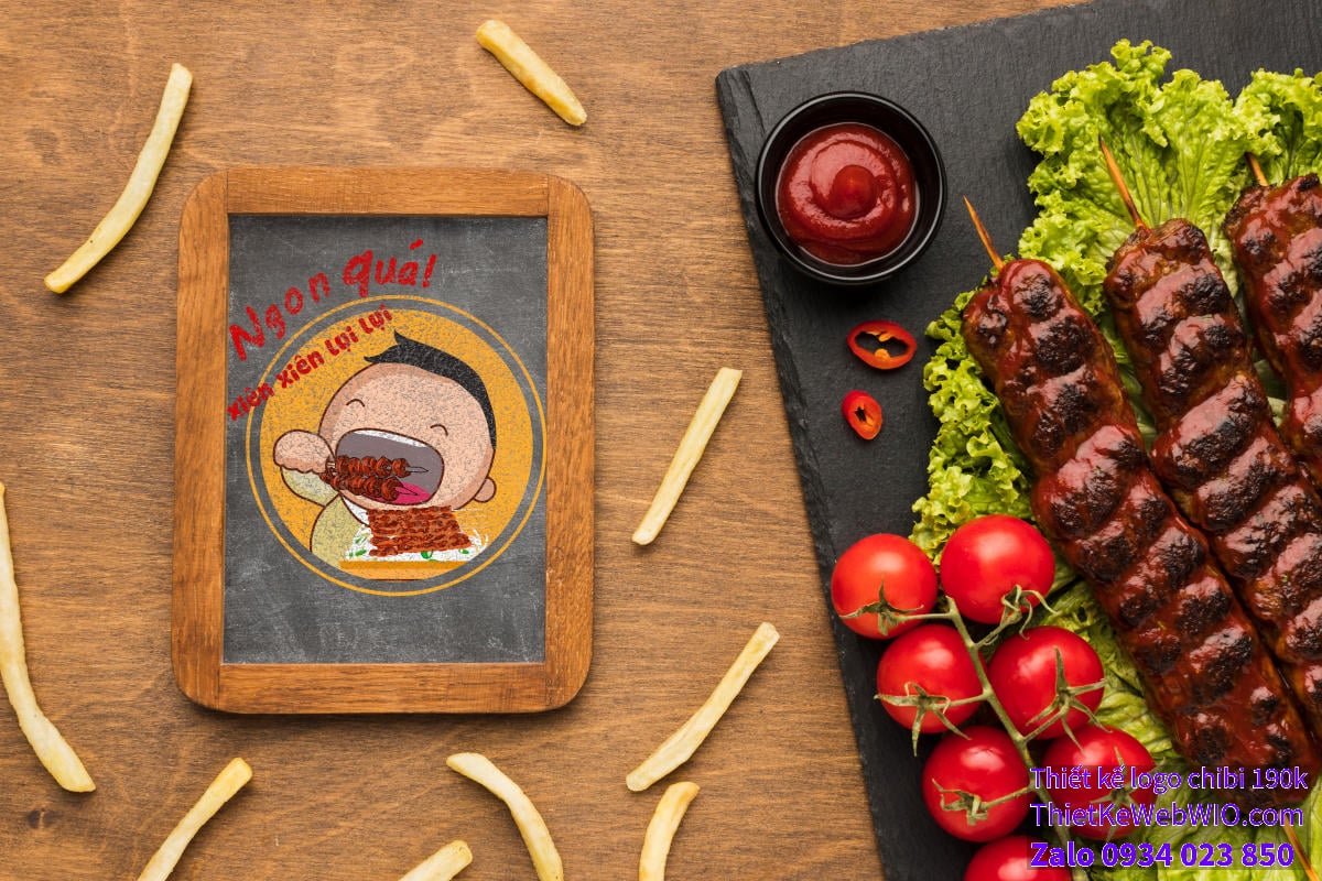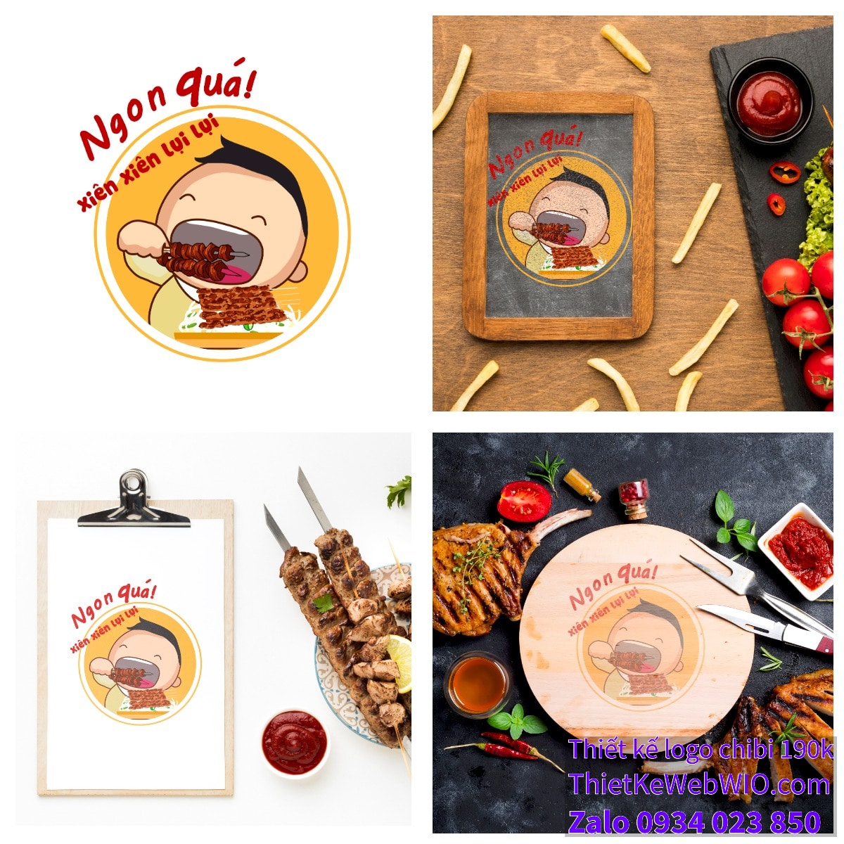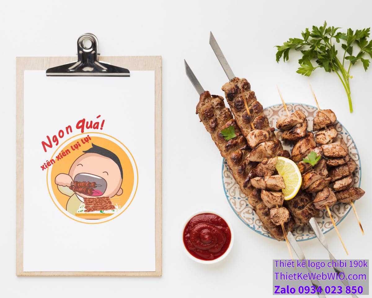 - Phía trên bức ảnh chibi cậu bé đang ăn xiên thịt ngon miệng có dòng chữ “Ngon quá!” viết bằng màu đỏ đậm, tạo điểm nhấn mạnh mẽ. Phía dưới là dòng chữ “xiên xiên lụi lụi” cũng được viết bằng màu đỏ, tạo sự đồng bộ và hài hòa cho tổng thể bức ảnh.