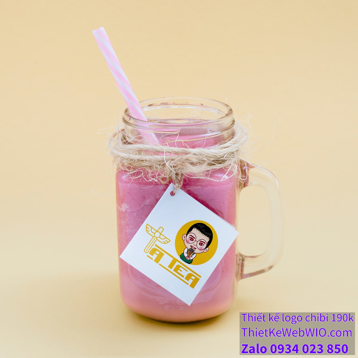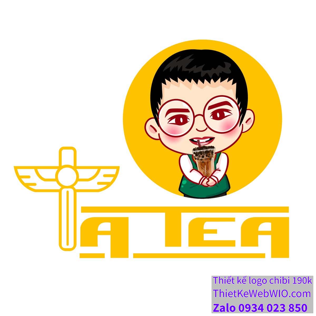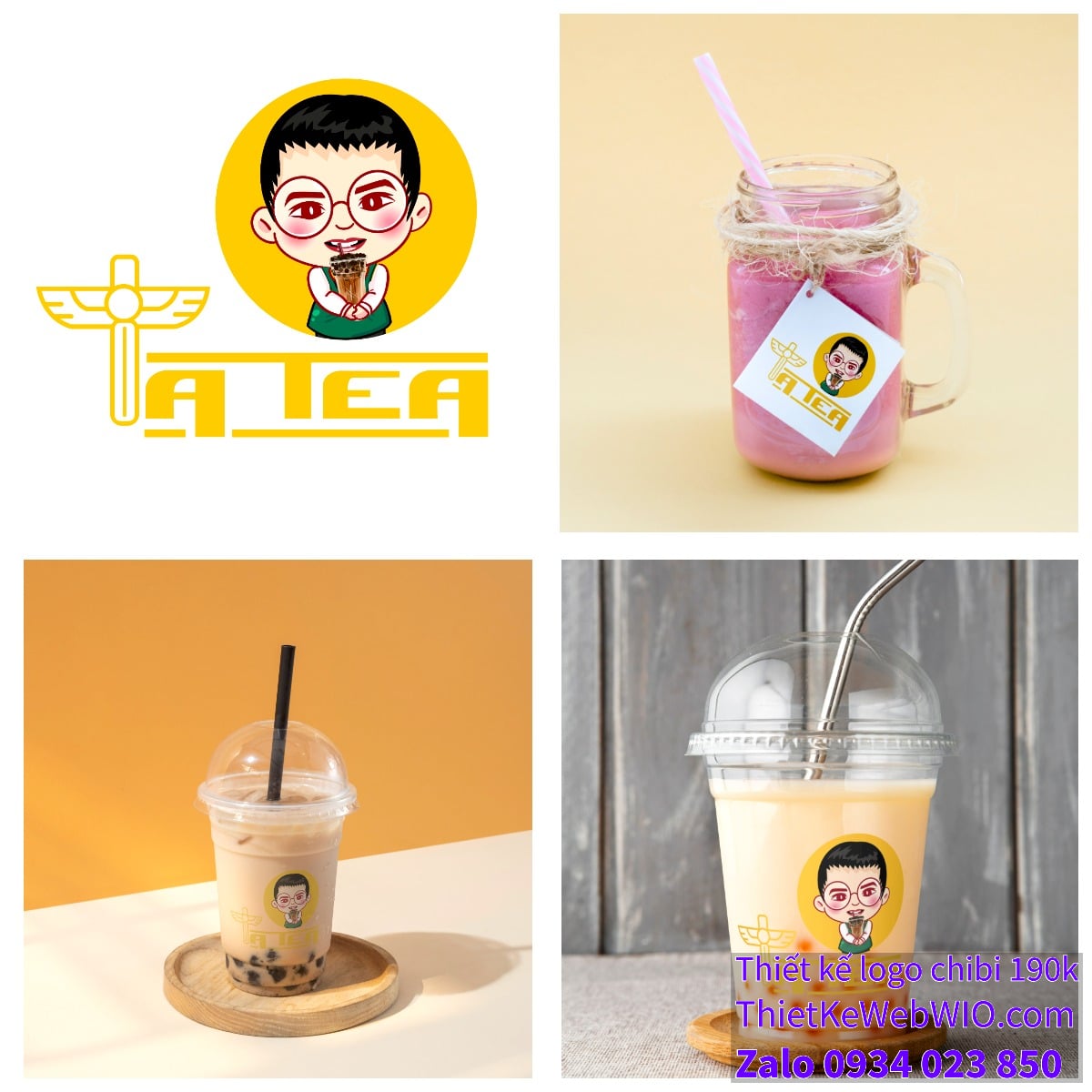 - Bên cạnh hình ảnh chibi cậu bé đeo mắt kính uống trà sữa là một biểu tượng cách điệu và dòng chữ “A Tea” được viết theo phong cách hiện đại, gọn gàng. Màu vàng của chữ viết và biểu tượng hòa quyện với phông nền, tạo nên sự đồng nhất và hài hòa.