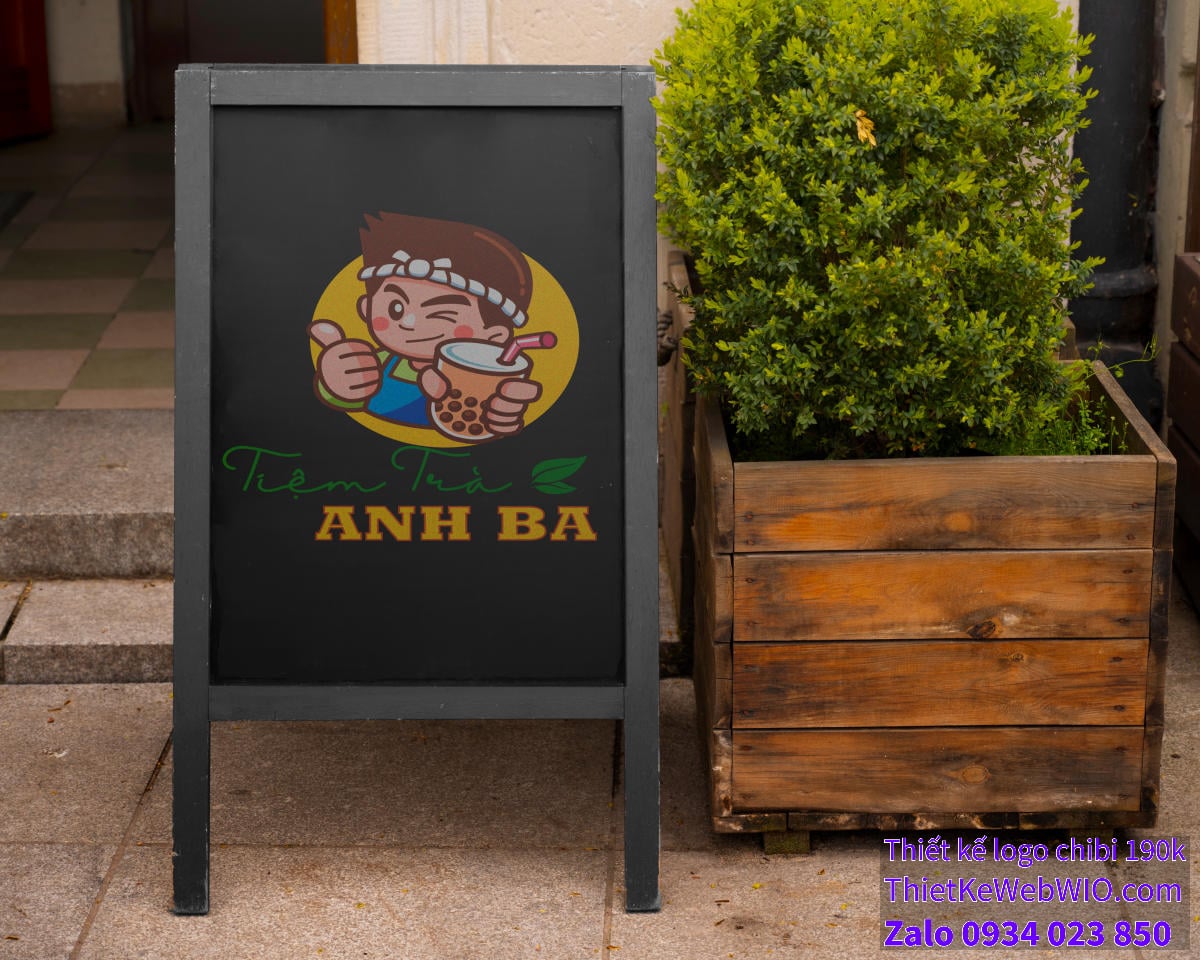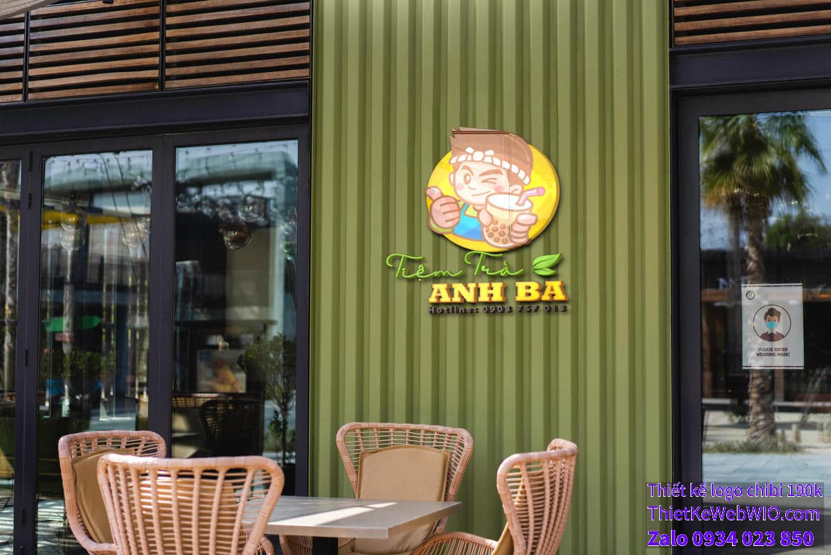 - Tên tiệm và số điện thoại: Bên dưới hình ảnh chibi là tên cửa hàng “Tiệm Trà Anh Ba” được viết với font chữ sáng tạo và nổi bật. Số điện thoại hotline (0903 757 013) được ghi rõ ràng, giúp khách hàng dễ dàng liên lạc khi có nhu cầu.