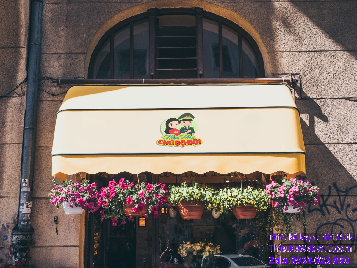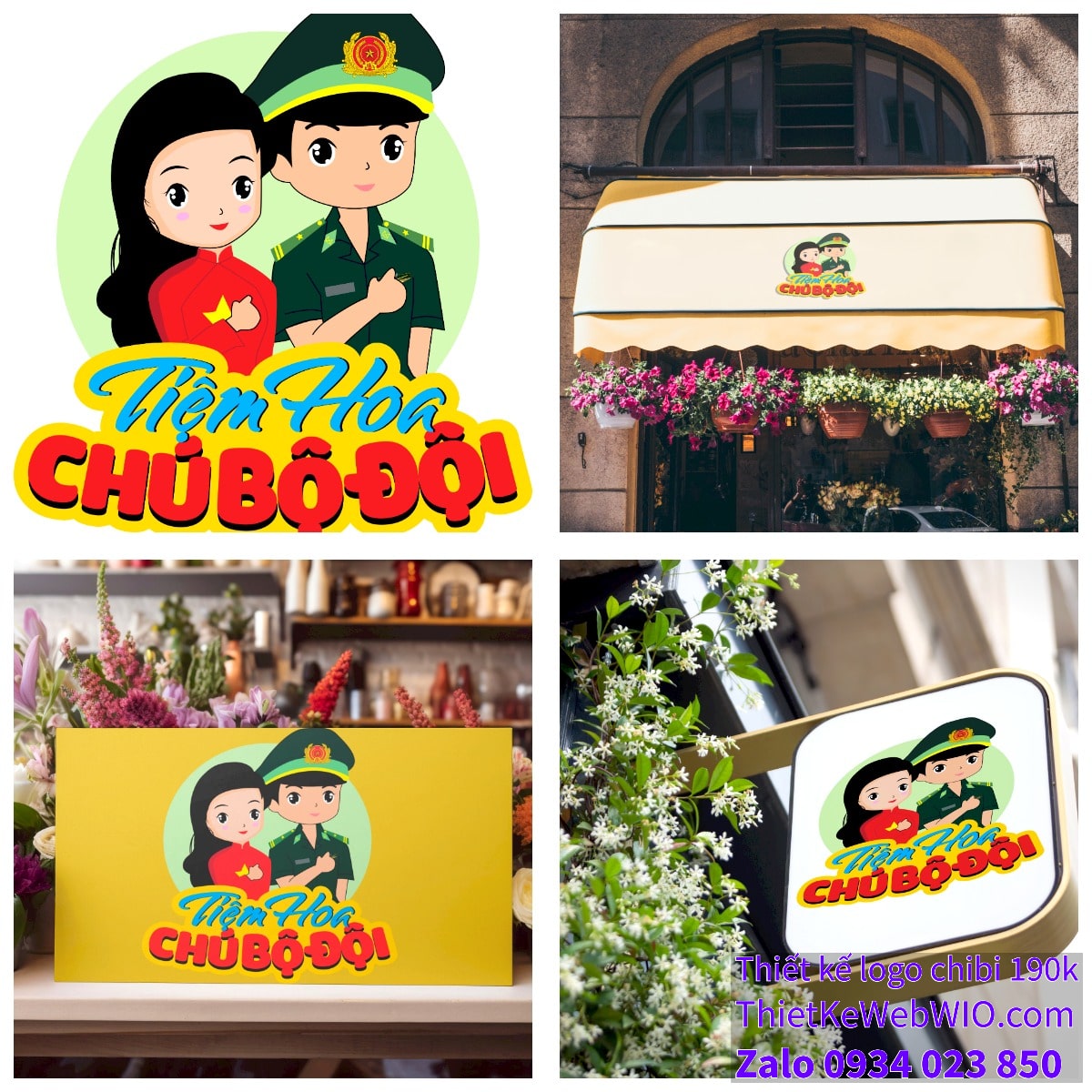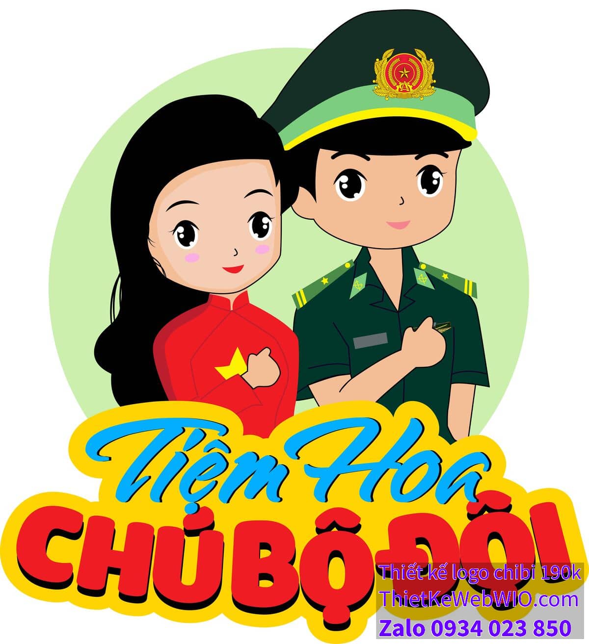 - Chữ viết: Dưới hai nhân vật là dòng chữ “Tiệm Hoa Chú Bộ Đội” được viết bằng font chữ vui nhộn, với màu sắc sặc sỡ, tạo cảm giác sinh động và bắt mắt.