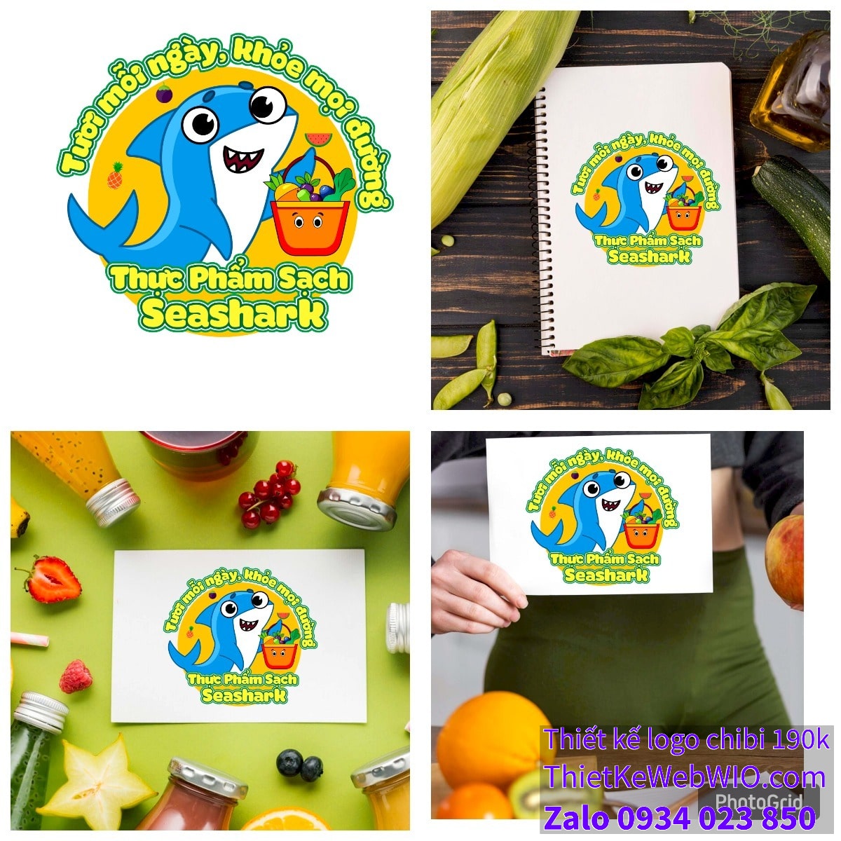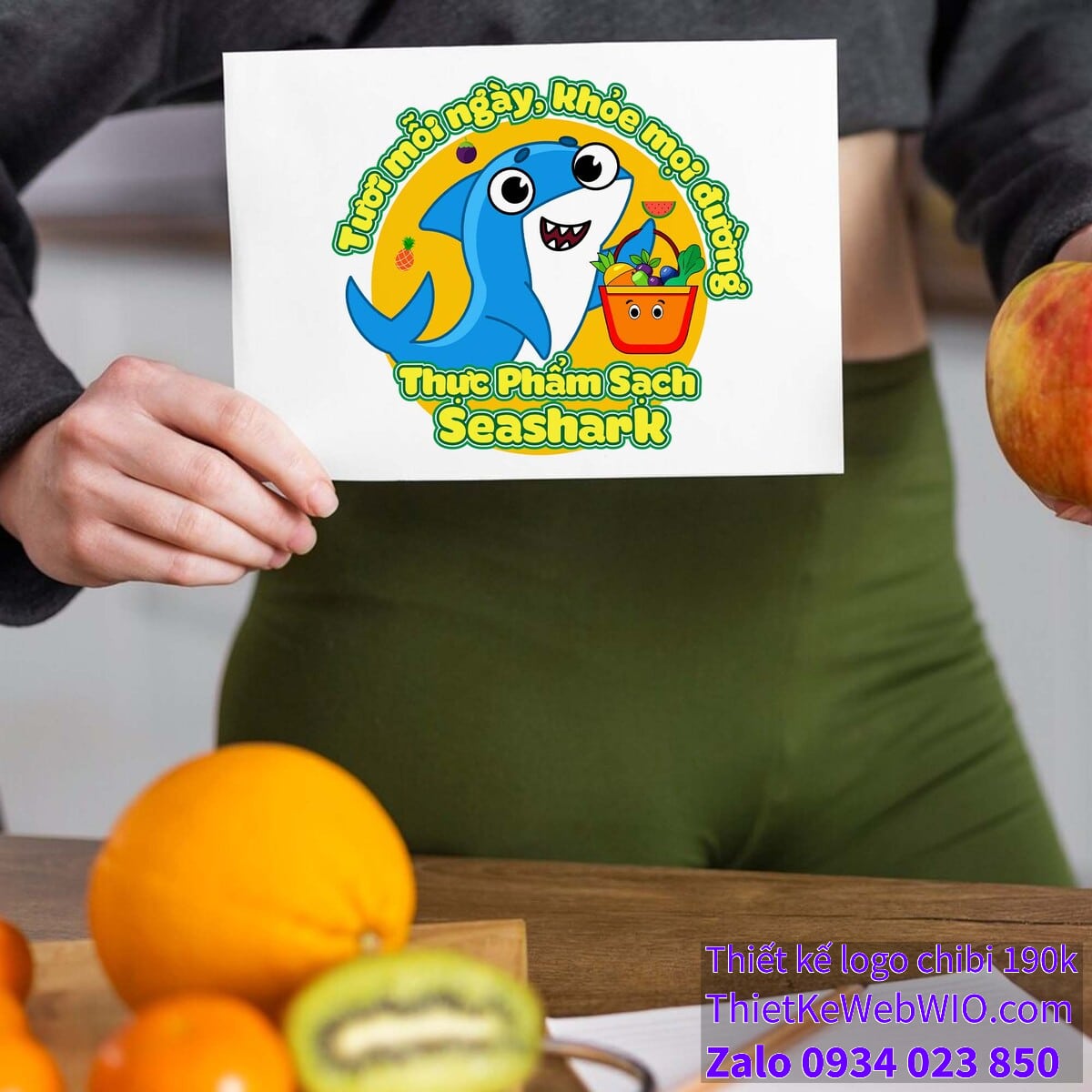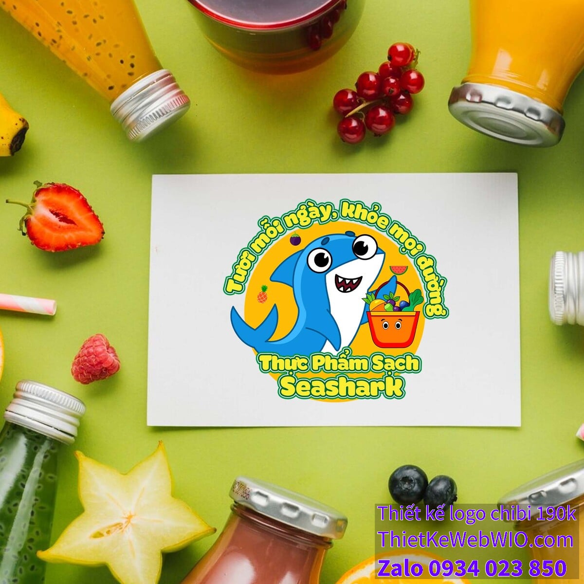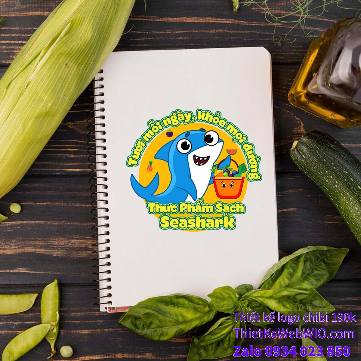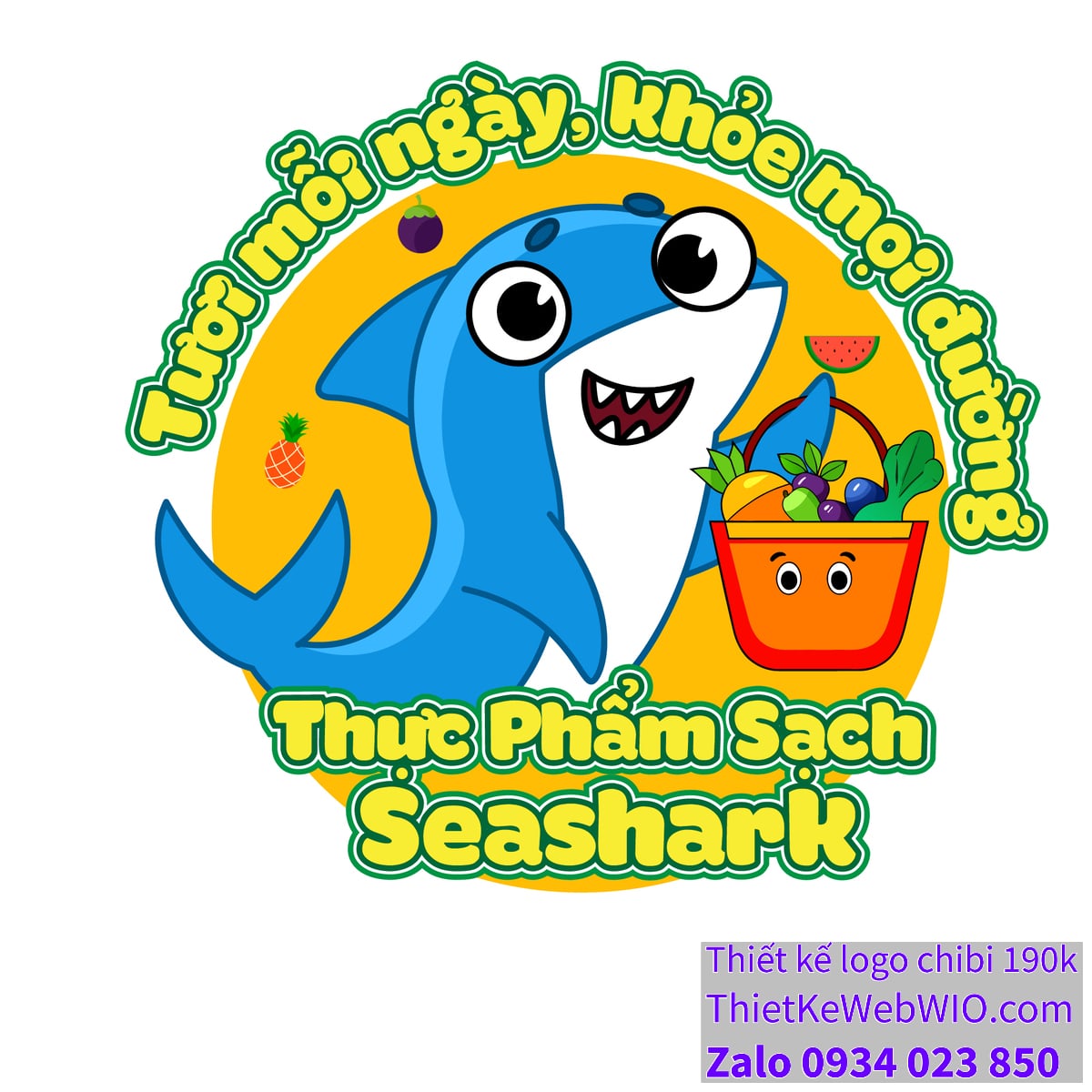 Hình ảnh này không chỉ thể hiện sự vui nhộn, thân thiện mà còn truyền tải thông điệp về sự tươi ngon và chất lượng của sản phẩm thực phẩm sạch từ SeaShark. Đây là một thiết kế chibi hiệu quả trong việc thu hút sự chú ý và tạo ấn tượng tốt đối với người xem.Vẽ chibi chú cá mập xanh đang cầm giỏ rau củ sạch để thiết kế logo
