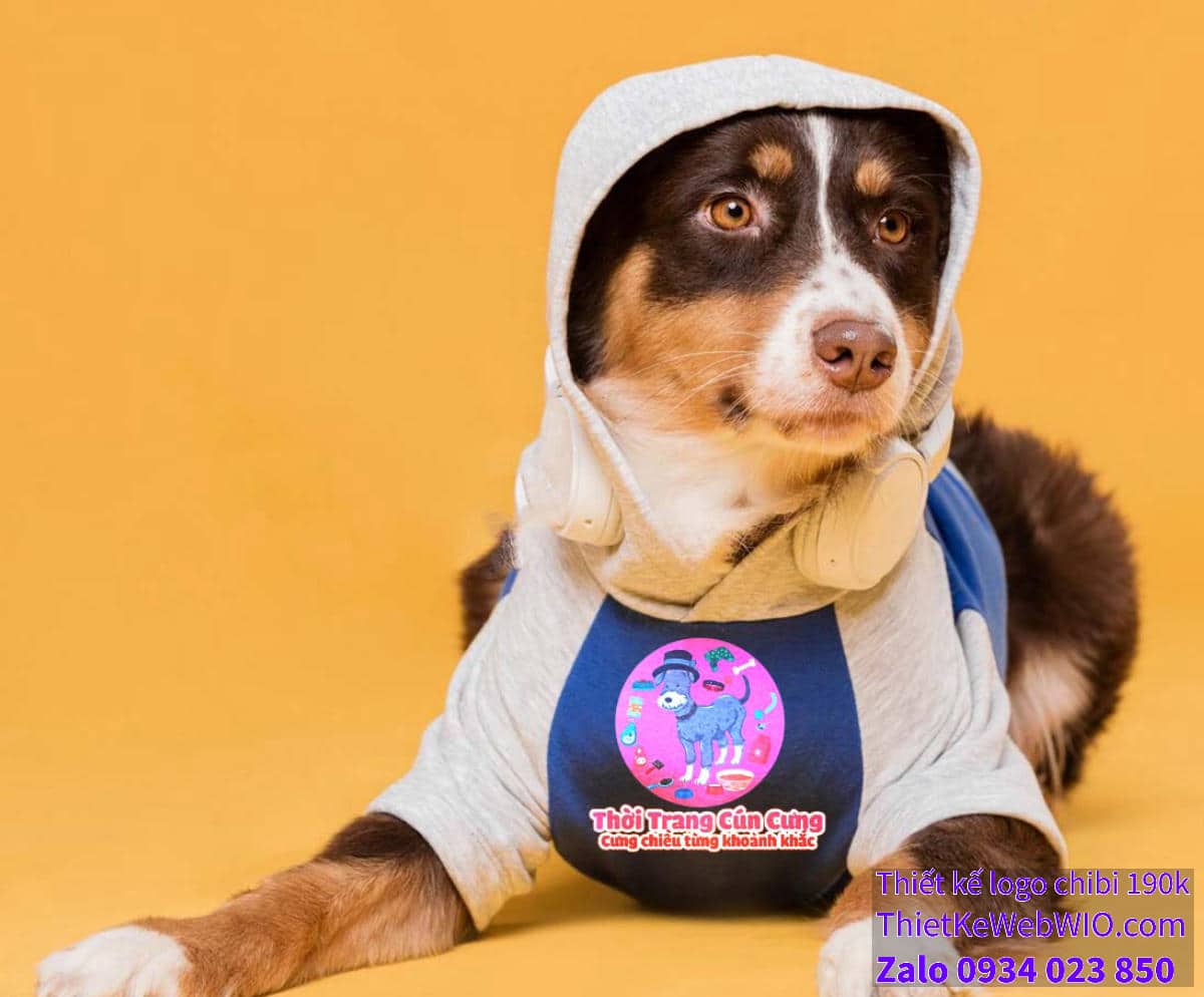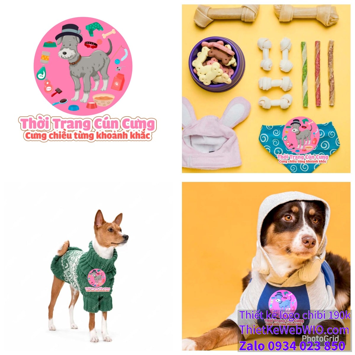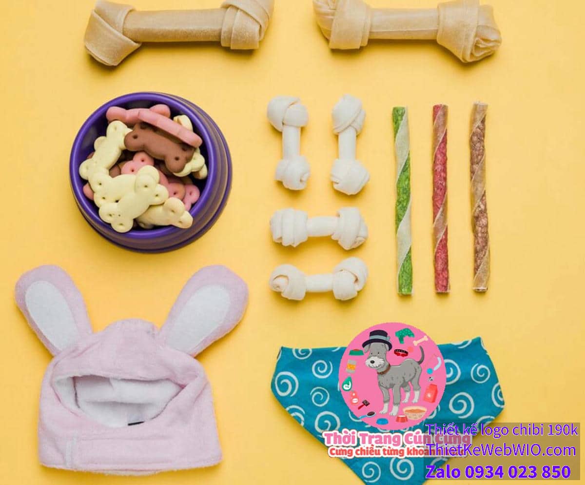 - Vật dụng chăm sóc: chibi chú chó xám cao to đội mũ đen bán thời trang thú cưng Có chai sữa tắm, bàn chải, và hộp dầu gội, thể hiện sự quan tâm đến vệ sinh và sức khỏe của chú chó.