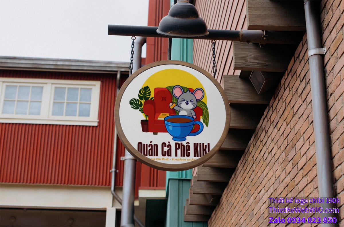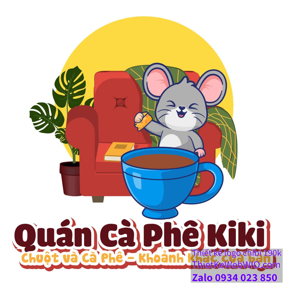 Phía dưới cùng của bức tranh là dòng chữ “Quán Cà Phê Kiki” được viết bằng font chữ đậm, màu nâu, cùng với slogan “Chuột và Cà Phê – Khoảnh Khắc Của Bạn” màu cam. Những dòng chữ này không chỉ thể hiện tên quán mà còn gợi lên một không gian thưởng thức cà phê ấm cúng và dễ chịu.