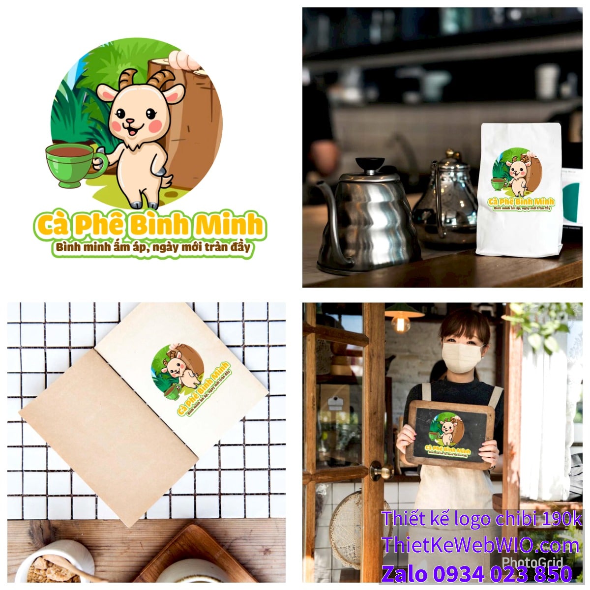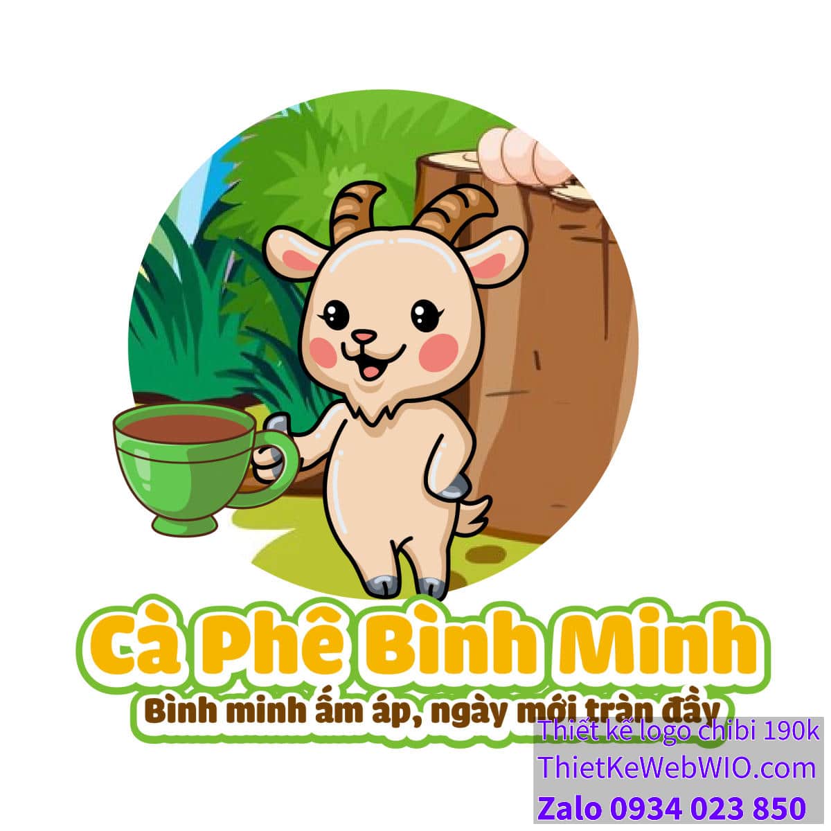 Tấm ảnh chibi chú dê con uống cà phê vui vẻ này thể hiện một hình ảnh rất dễ thương và vui tươi, với hình ảnh một chú dê nhỏ đang cầm tách cà phê. Cảnh vật xung quanh làm nổi bật không gian quán cà phê ngoài trời, tạo cảm giác ấm áp và gần gũi. Logo “Cà Phê Bình Minh” ở dưới với slogan “Bình minh ấm áp, ngày mới tràn đầy” rất ấn tượng và dễ nhớ.