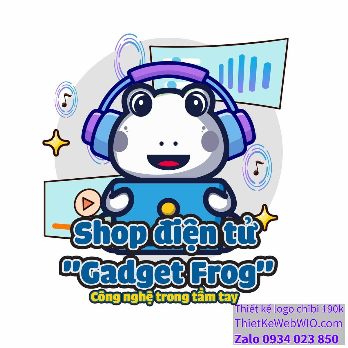 Tấm ảnh chibi chú ếch trắng đang đeo tai nghe bán đồ điện tử là một hình minh họa đáng yêu và sinh động, sử dụng hình ảnh một chú ếch làm biểu tượng chính. Chú ếch này được vẽ với phong cách chibi, nổi bật với các đường nét mềm mại và dễ thương. Đây là một thiết kế dành cho shop điện tử “Gadget Frog”, với slogan “Công nghệ trong tầm tay”.
