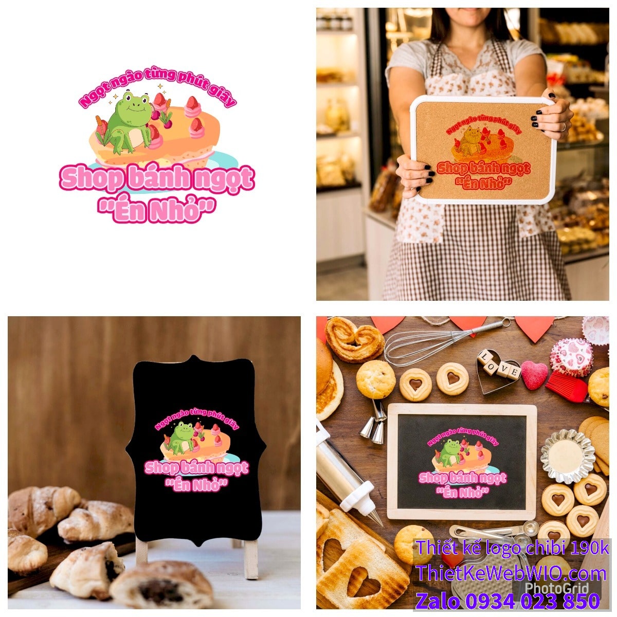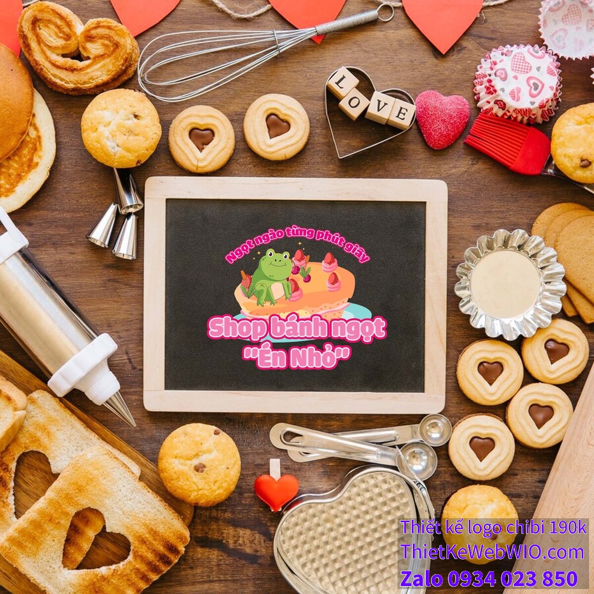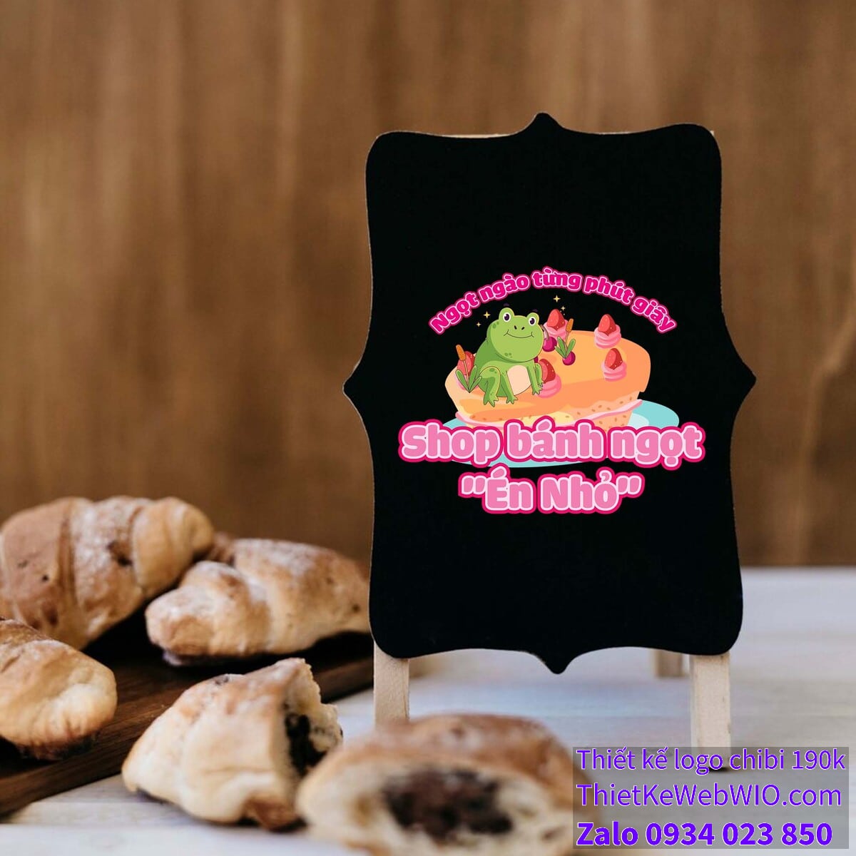 - Tên shop “Shop bánh ngọt ‘Én Nhỏ'”: Được đặt ở phần dưới của hình ảnh, với phông chữ lớn, màu hồng viền trắng. Tên shop được nhấn mạnh, dễ dàng thu hút sự chú ý của khách hàng.