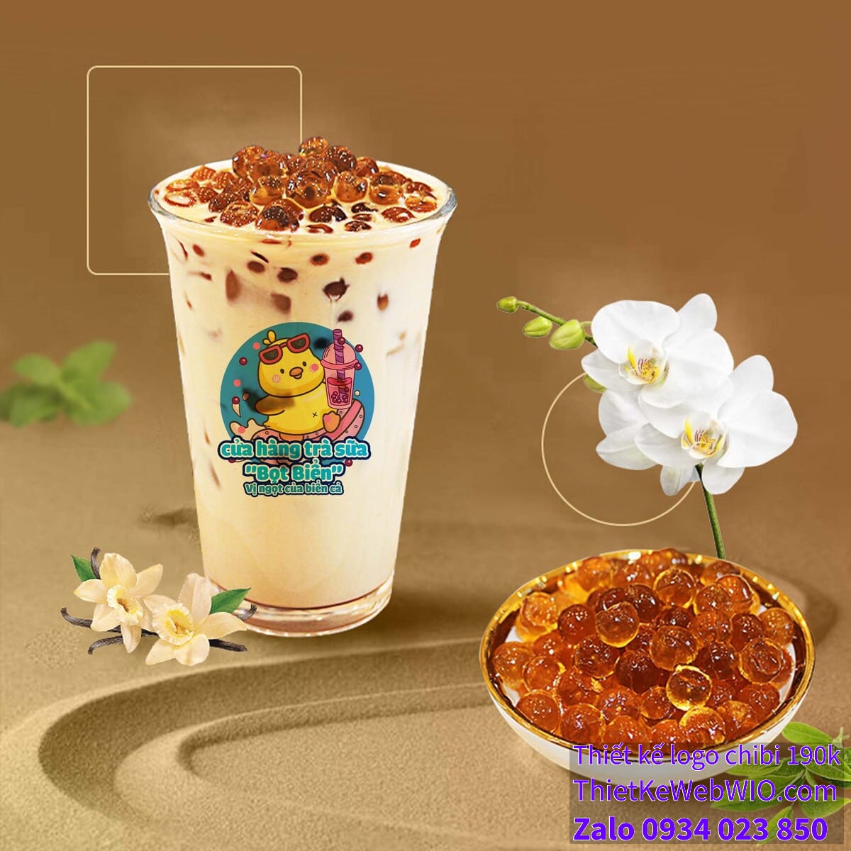 Tấm ảnh chibi chú gà con màu vàng đang lướt sóng uống trà sữa là một minh họa chibi đáng yêu, được thiết kế dành cho cửa hàng trà sữa “Bọt Biển”. Đặc điểm nổi bật của tấm ảnh là hình ảnh chú gà con đang cầm ly trà sữa, với phong cách hoạt hình ngộ nghĩnh và màu sắc tươi sáng.