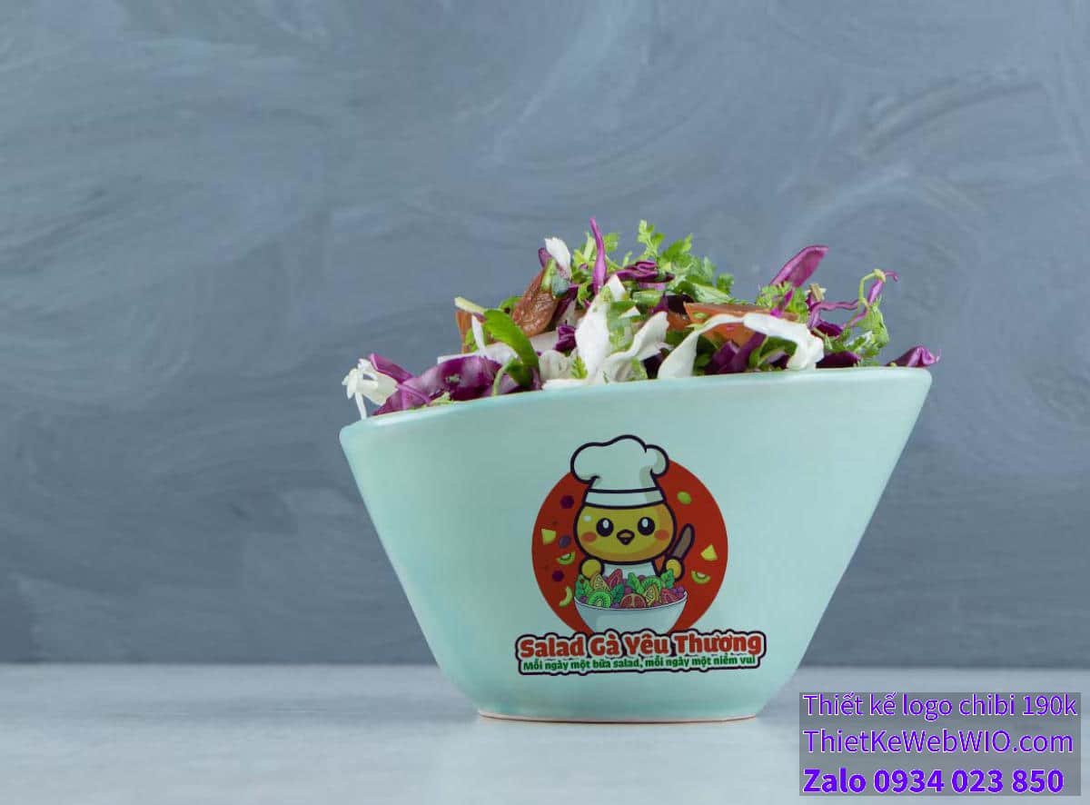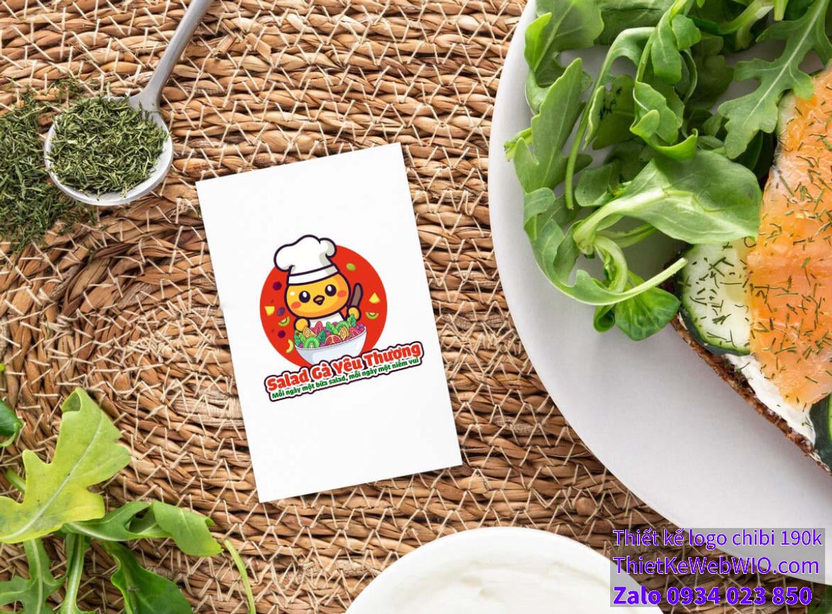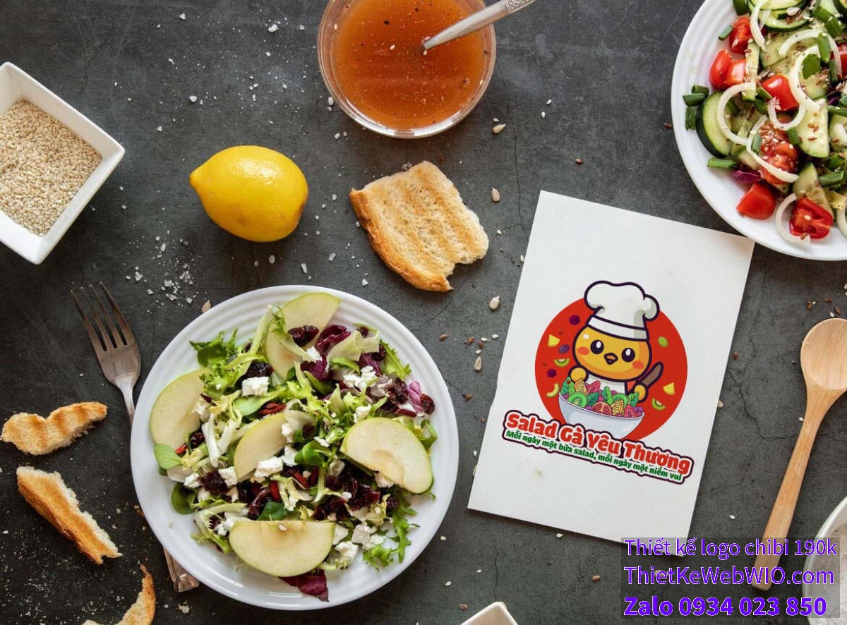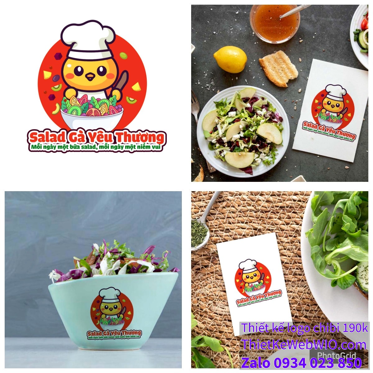 - Chữ Viết- Dưới cùng của bức ảnh chibi chú gà đầu bếp đang làm salad hoa quả thơm ngon là dòng chữ “Salad Gà Yêu Thương” với font chữ lớn, đậm và màu sắc nổi bật.