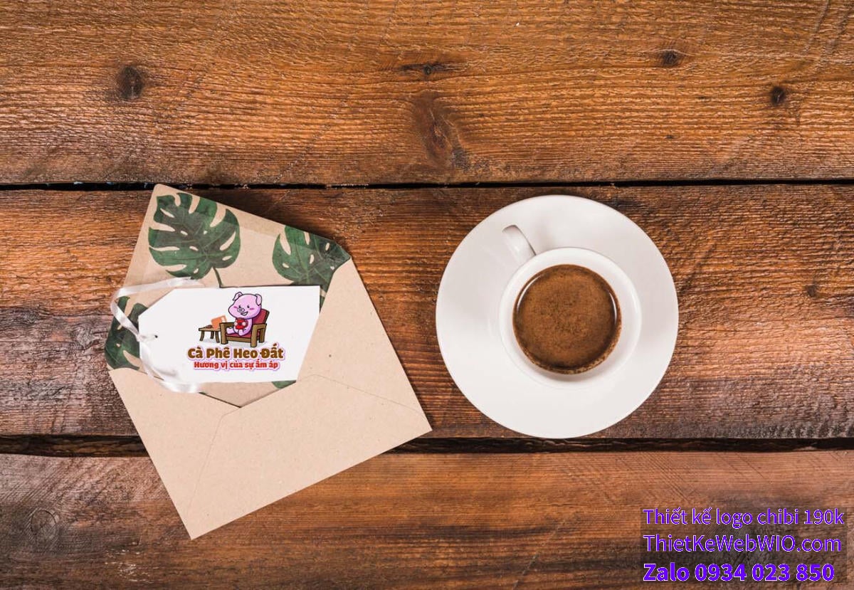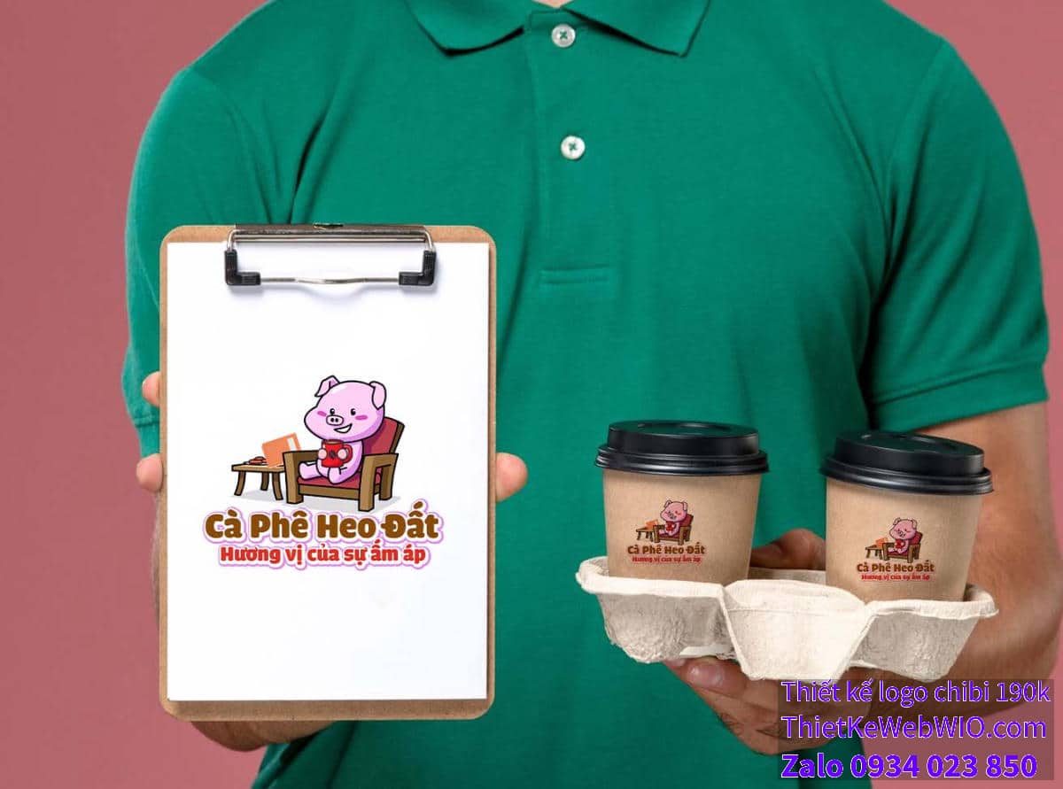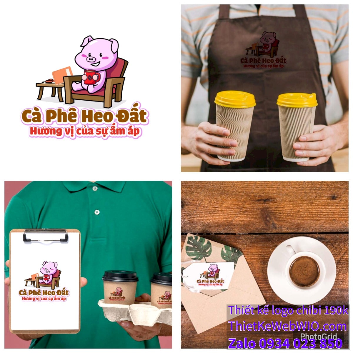 Tên quán: “Cà Phê Heo Đất” được viết bằng chữ màu nâu đậm, viền trắng và hồng, dễ nhìn và nổi bật.
