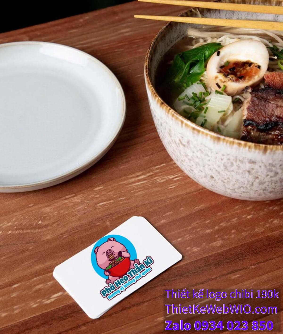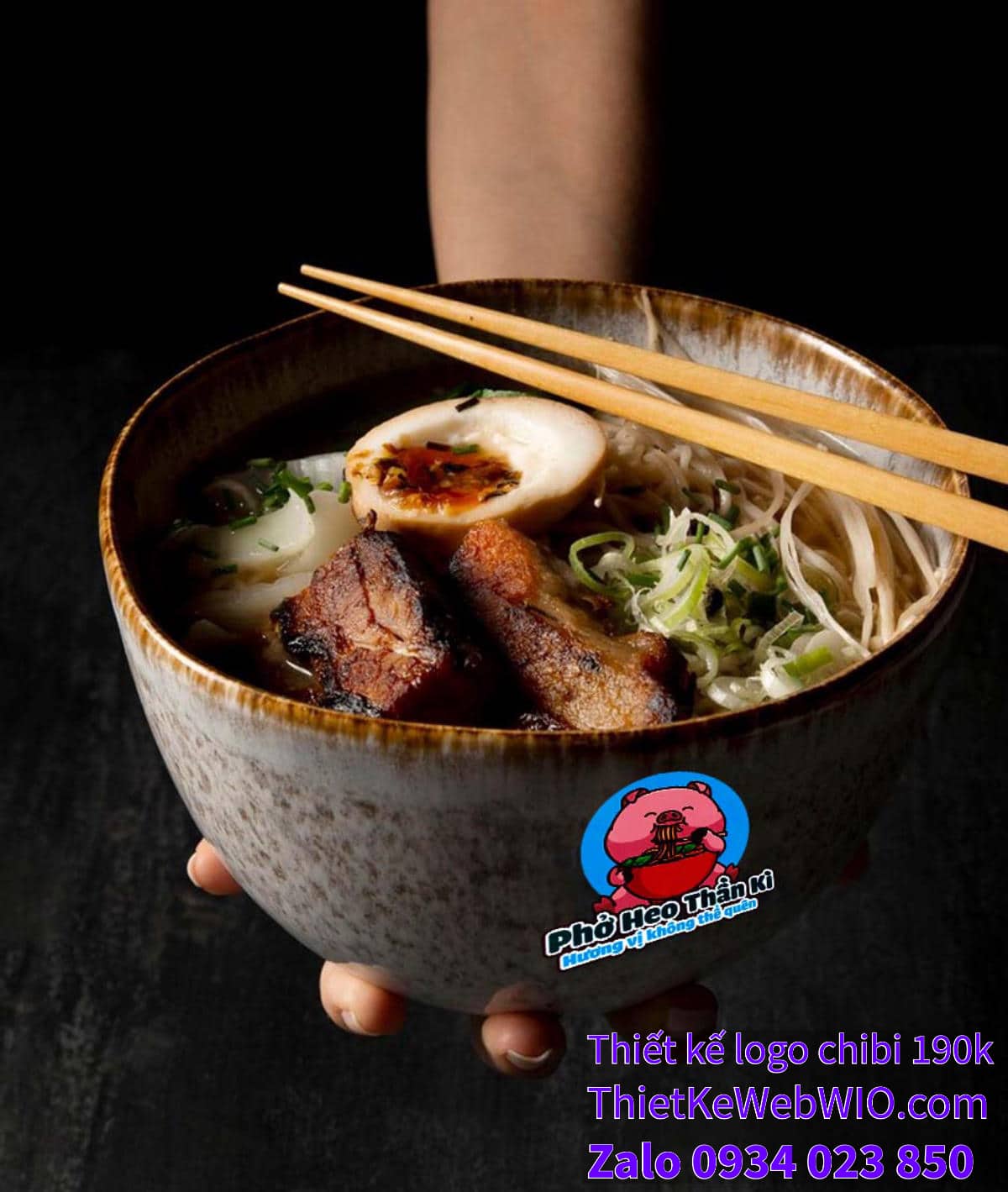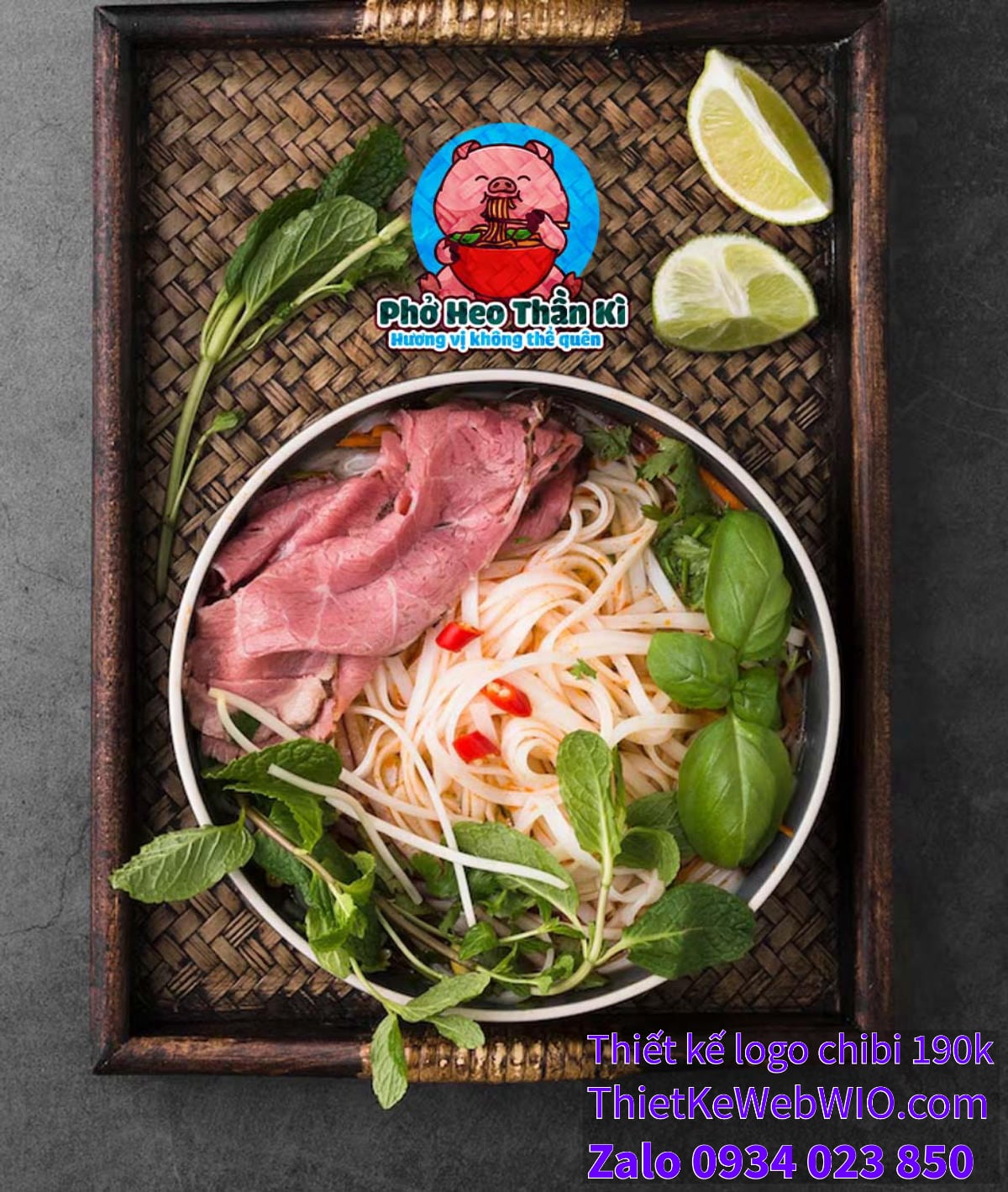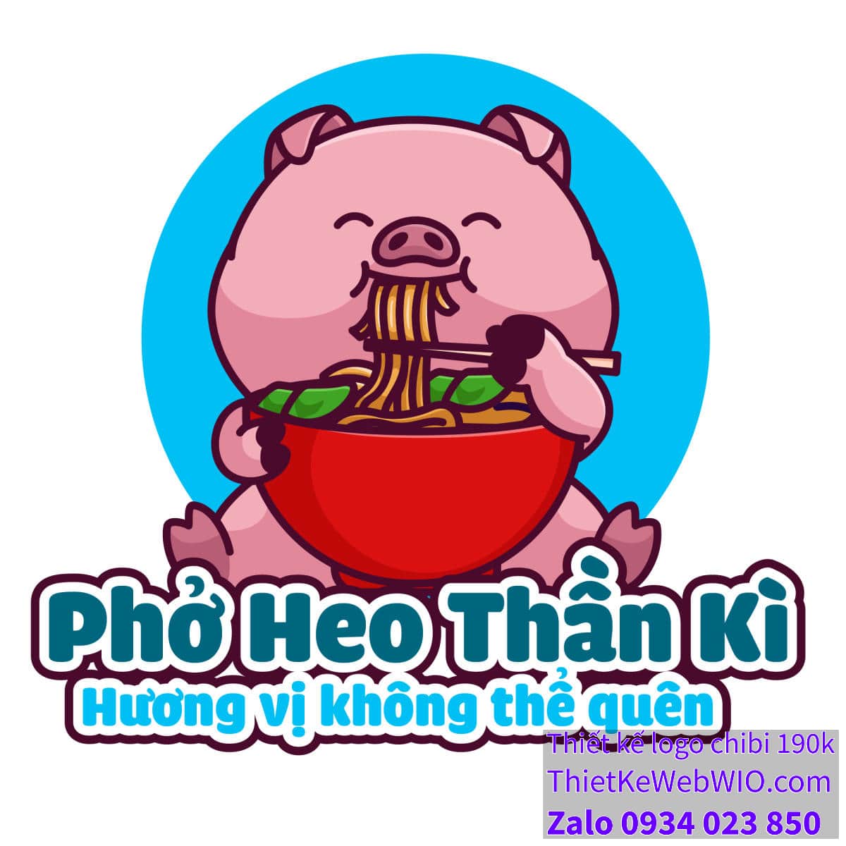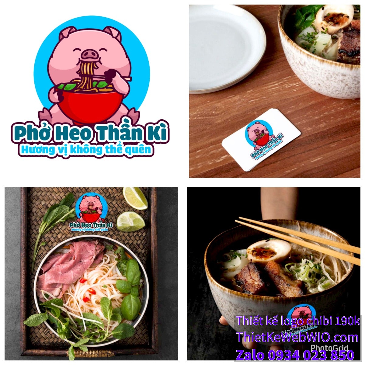 - Tên thương hiệu: “Phở Heo Thần Kì” được viết ở phần dưới của hình ảnh, với font chữ dễ đọc, màu xanh đậm.