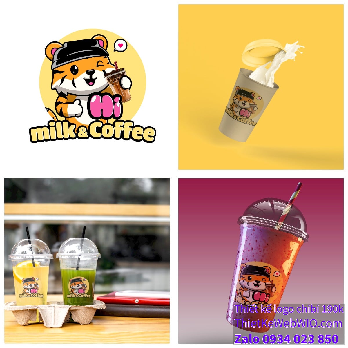 Phía dưới chibi chú hổ vàng đeo mũ đen bán trà sữa là tên quán “Hi milk & Coffee” với chữ “Hi” màu hồng đậm nổi bật, và chữ “milk & Coffee” màu vàng nhạt, được viền đen để làm rõ nét. Phông chữ được chọn mềm mại, dễ đọc và phù hợp với phong cách chibi của hình ảnh.