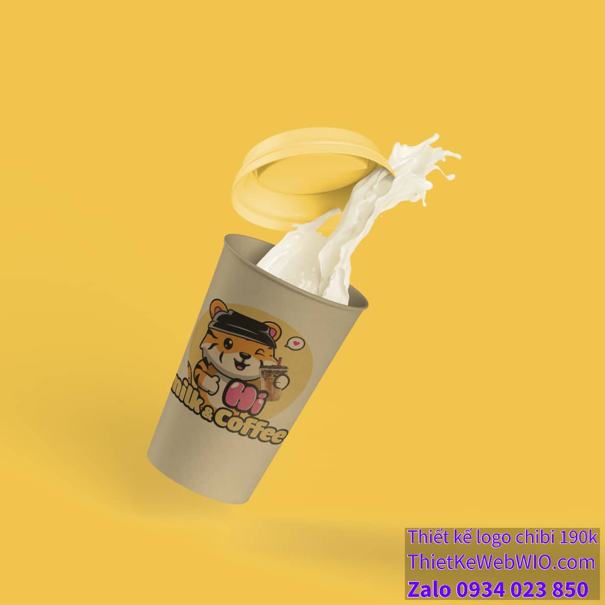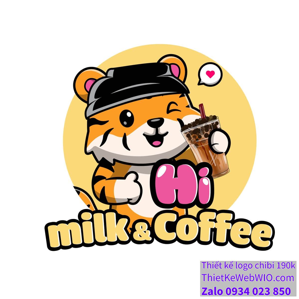 Phía dưới chibi chú hổ vàng đeo mũ đen bán trà sữa là tên quán “Hi milk & Coffee” với chữ “Hi” màu hồng đậm nổi bật, và chữ “milk & Coffee” màu vàng nhạt, được viền đen để làm rõ nét. Phông chữ được chọn mềm mại, dễ đọc và phù hợp với phong cách chibi của hình ảnh.