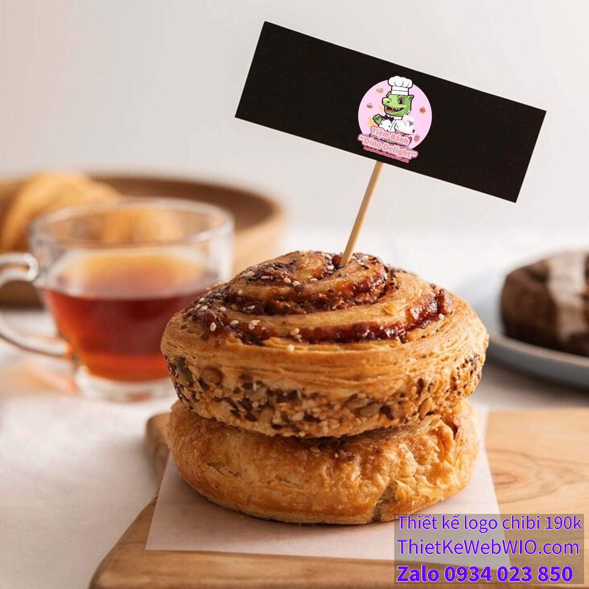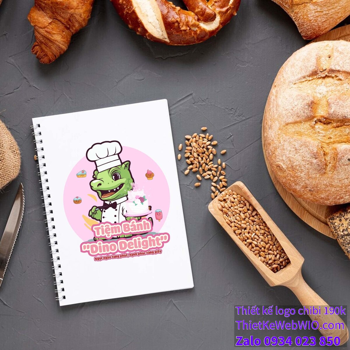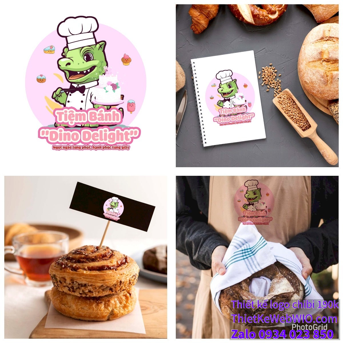 - Logo và slogan: Phía dưới cùng của bức tranh chibi chú khủng long đội mũ đầu bếp đang cầm bánh sinh nhật là tên tiệm bánh “Tiệm Bánh Dino Delight” được viết bằng font chữ mềm mại, dễ thương với màu hồng nổi bật. Bên dưới tên tiệm là slogan “Ngọt ngào từng phút, hạnh phúc từng giây”, thể hiện thông điệp về sự ngọt ngào và hạnh phúc mà tiệm bánh muốn mang đến cho khách hàng.