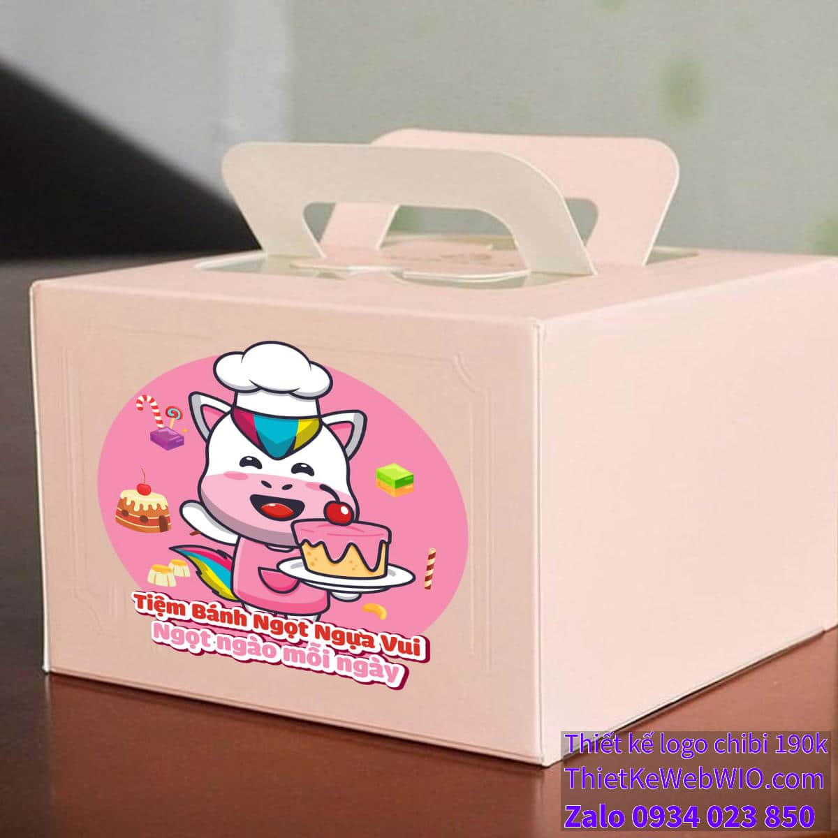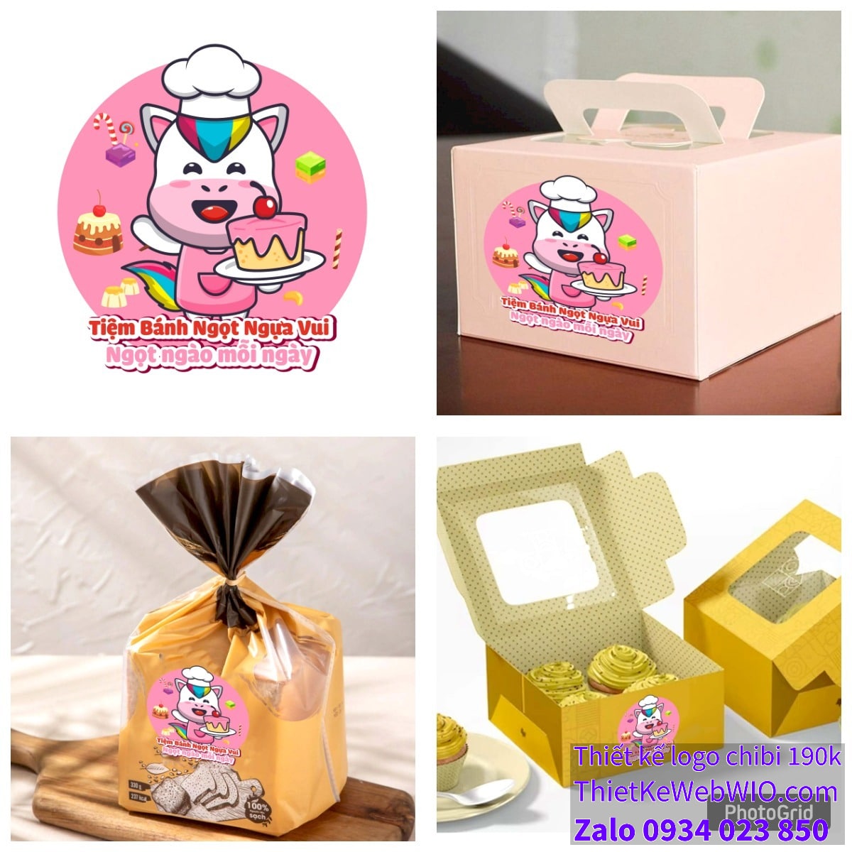 - Tên tiệm bánh: Dòng chữ “Tiệm Bánh Ngọt Ngựa Vui” và “Ngọt ngào mỗi ngày” được đặt ở phần dưới của hình ảnh, với màu đỏ và trắng nổi bật, dễ đọc.