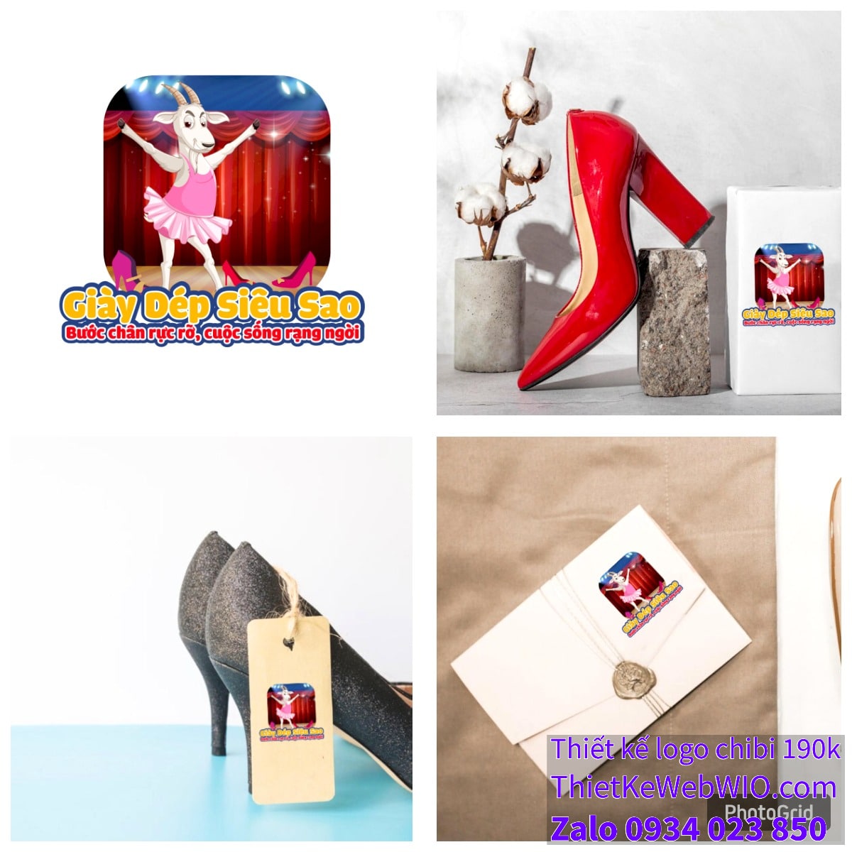 - Dòng chữ: Phía dưới chibi chú ngựa mặc váy hồng bán giày dép đang biểu diễn trên sân khấu là tên cửa hàng “Giày Dép Siêu Sao” được thiết kế nổi bật với màu vàng và xanh dương, kèm theo slogan “Bước chân rực rỡ, cuộc sống rạng ngời”.