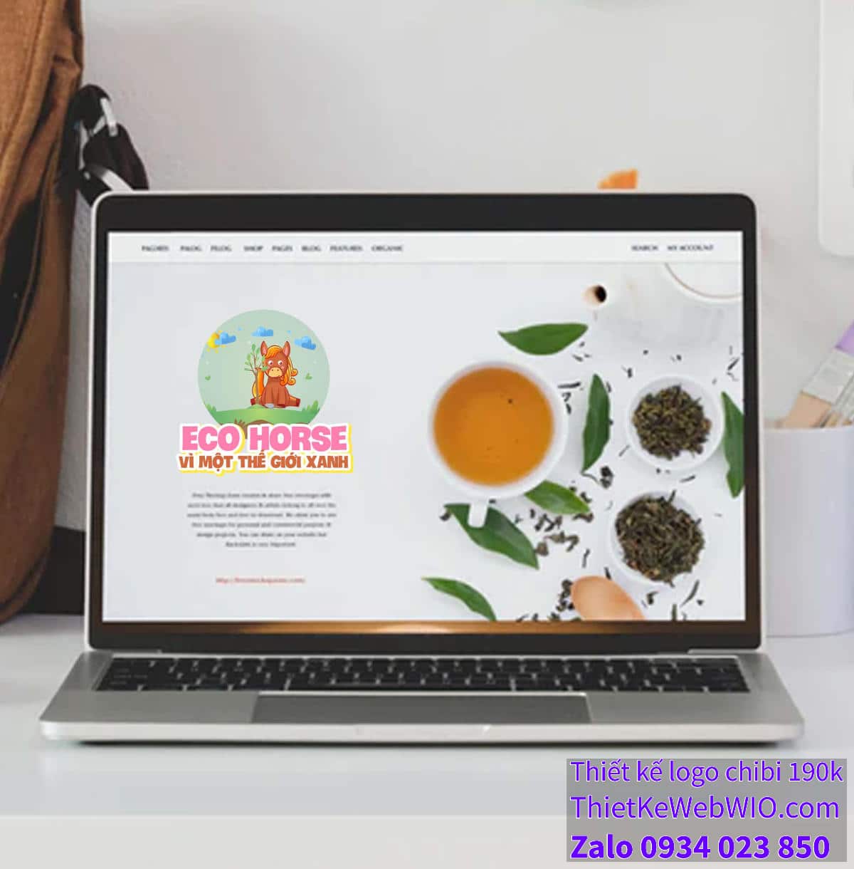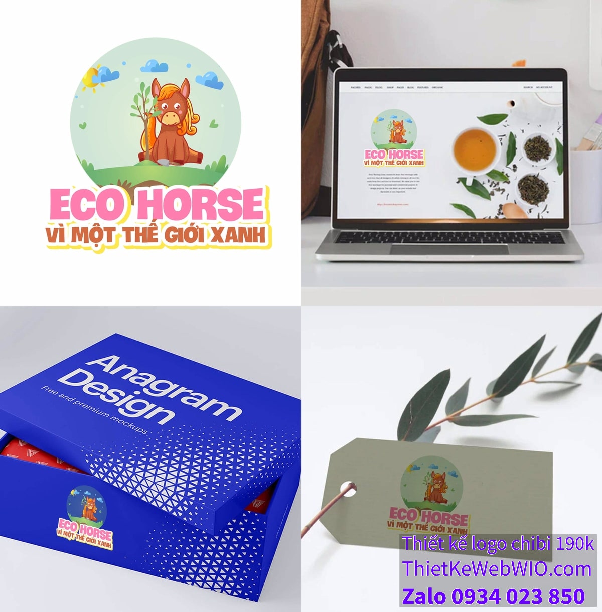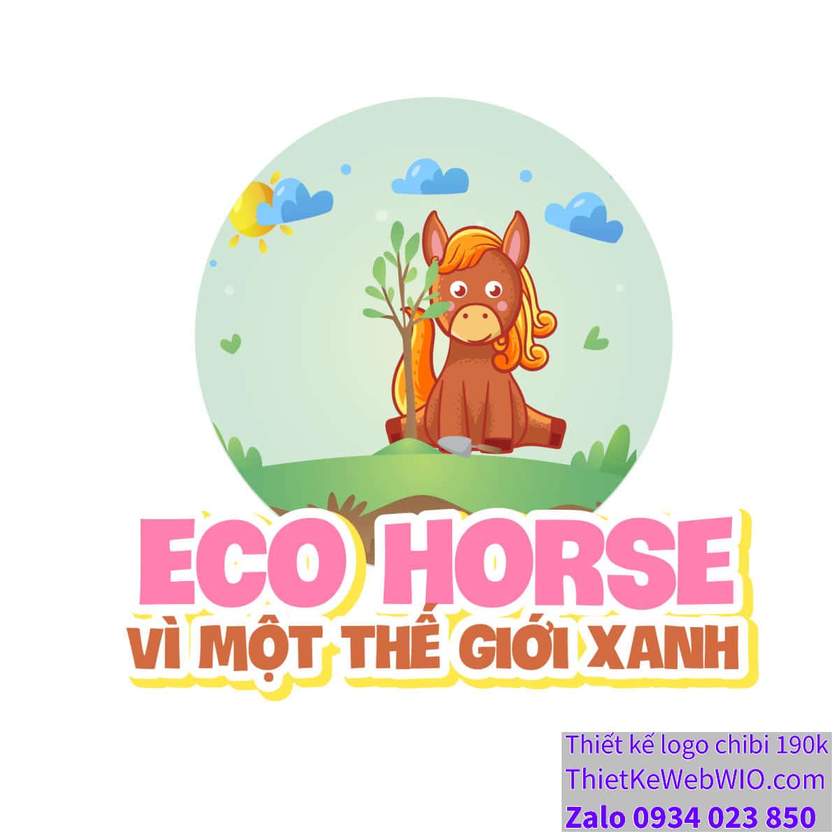 - Chữ viết: Phía dưới hình ảnh chibi chú ngựa nâu đang ngồi trên bãi cỏ, có dòng chữ “ECO HORSE” màu hồng nổi bật và dòng chữ “Vì một thế giới xanh” màu nâu đất. Các dòng chữ này được thiết kế theo phong cách vui nhộn, dễ thương, làm tăng thêm sức hấp dẫn của bức tranh.
