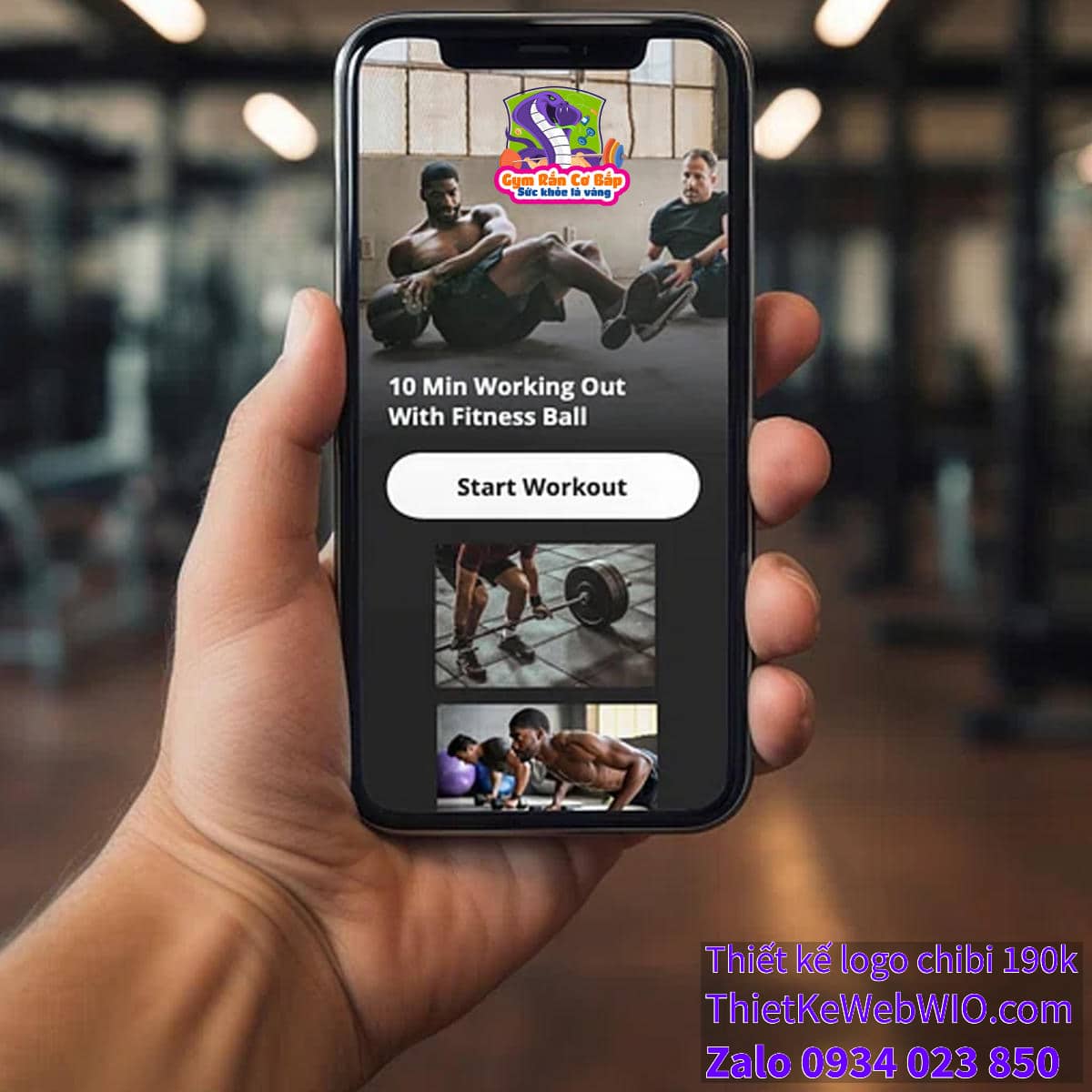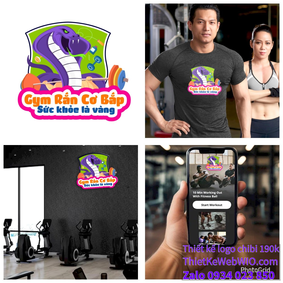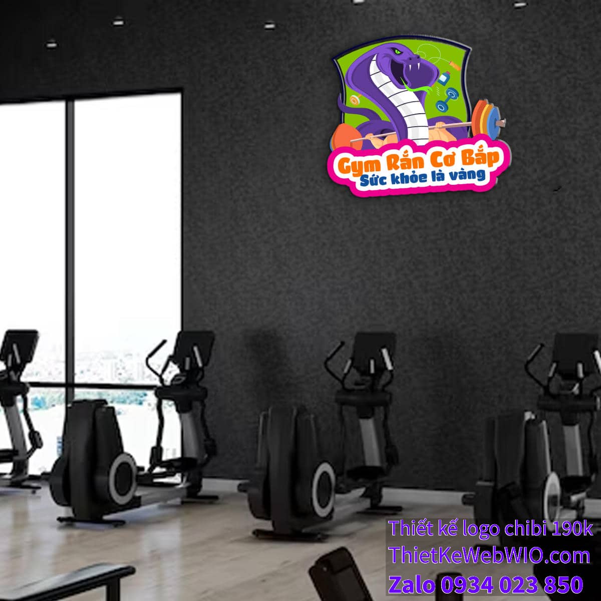 - Tên Gym: Phía dưới hình ảnh chibi chú rắn cơ bắp đang tập gym là dòng chữ “Gym Rắn Cơ Bắp” được thiết kế với màu cam nổi bật, chữ đậm và to, dễ nhìn.