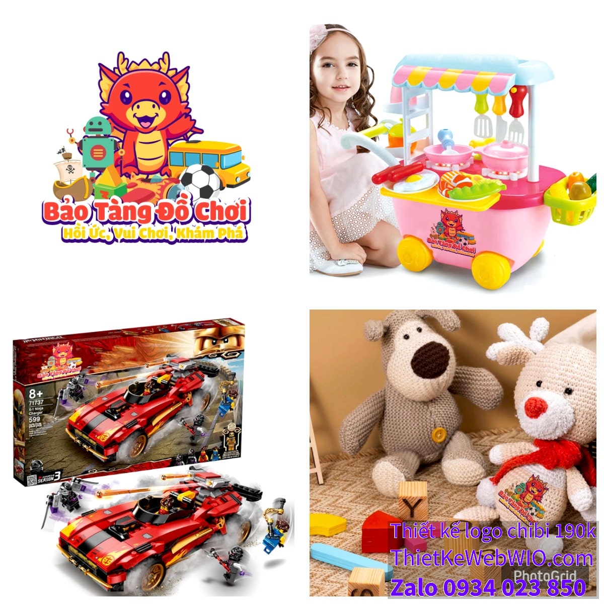 - Tiêu đề “Bảo Tàng Đồ Chơi”: chibi chú rồng con màu đỏ đang chơi vui vẻ bên nhiều đồ chơi Được viết bằng chữ to, màu đỏ đậm, viền tím, nổi bật ngay bên dưới các hình ảnh, dễ dàng thu hút ánh nhìn.
