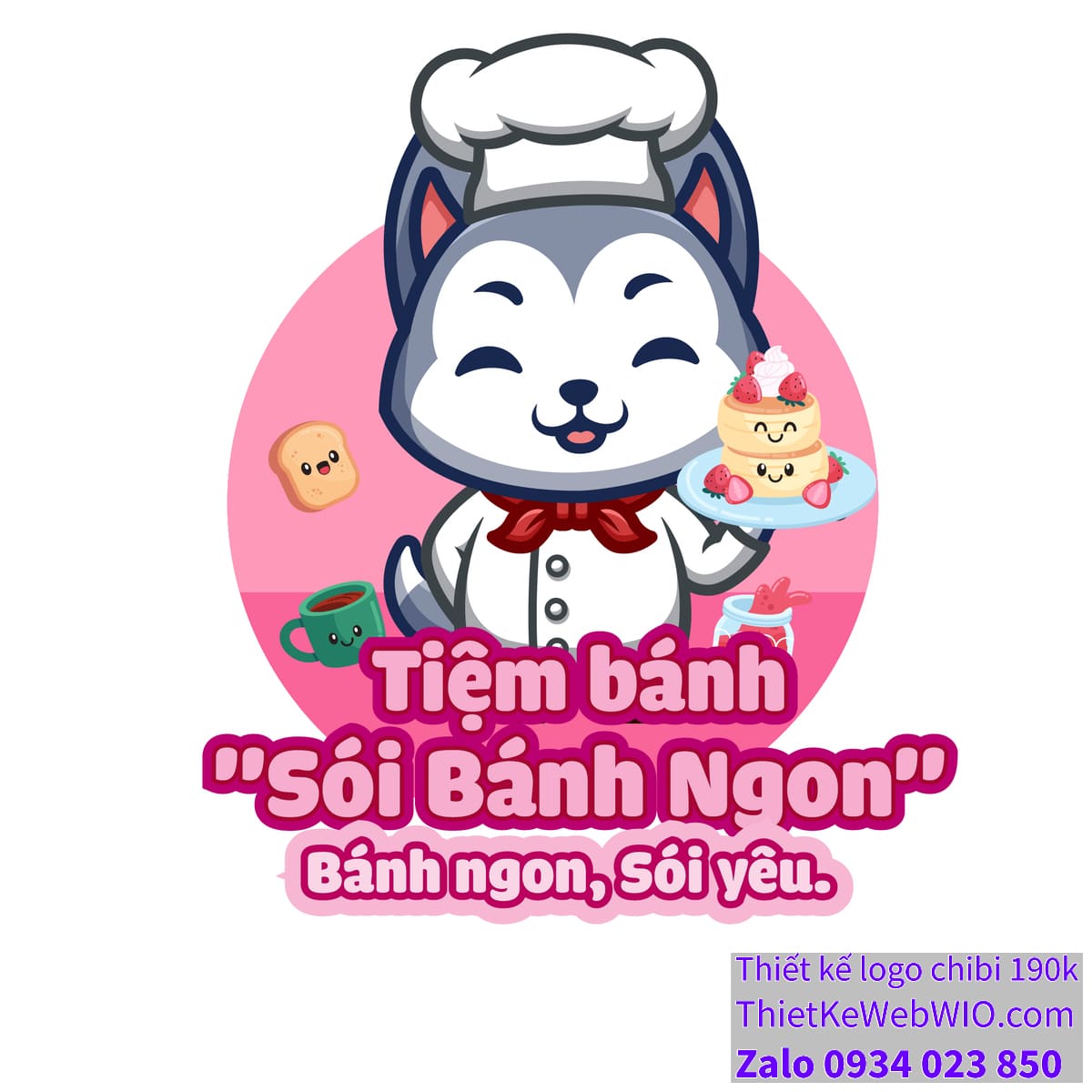 - Logo tiệm bánh: Phía dưới nhân vật là tên tiệm bánh “Sói Bánh Ngon” được viết bằng phông chữ đậm, dễ thương, kết hợp màu hồng và trắng tạo điểm nhấn.