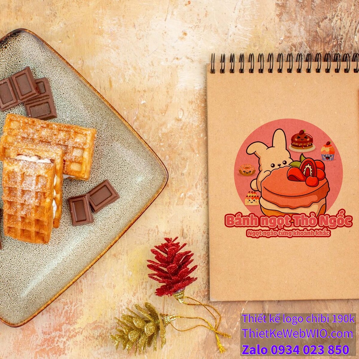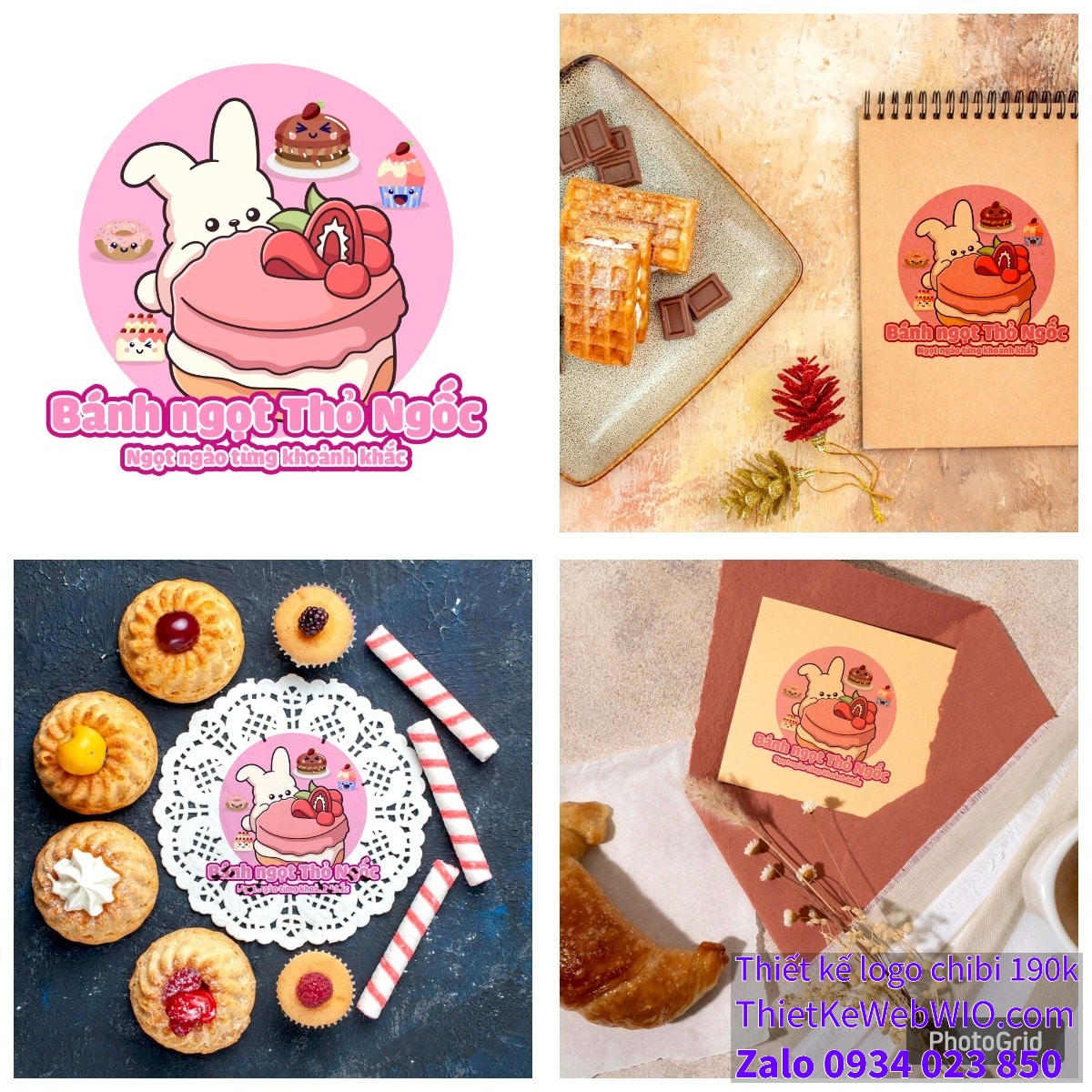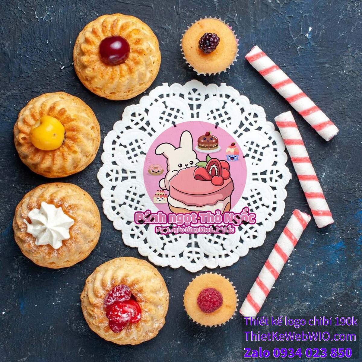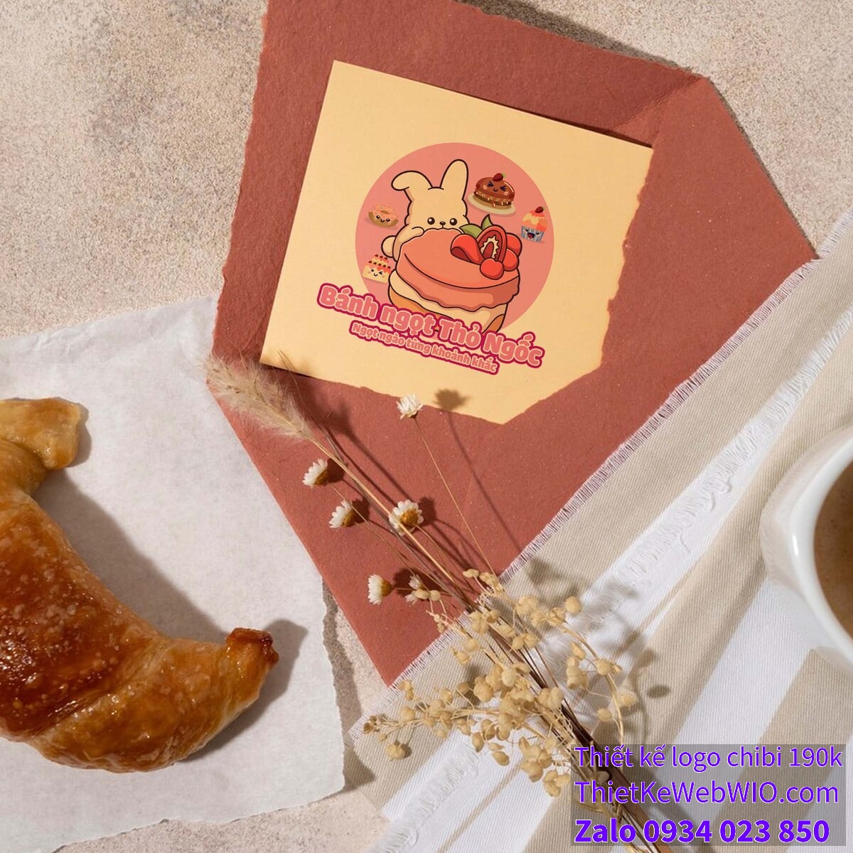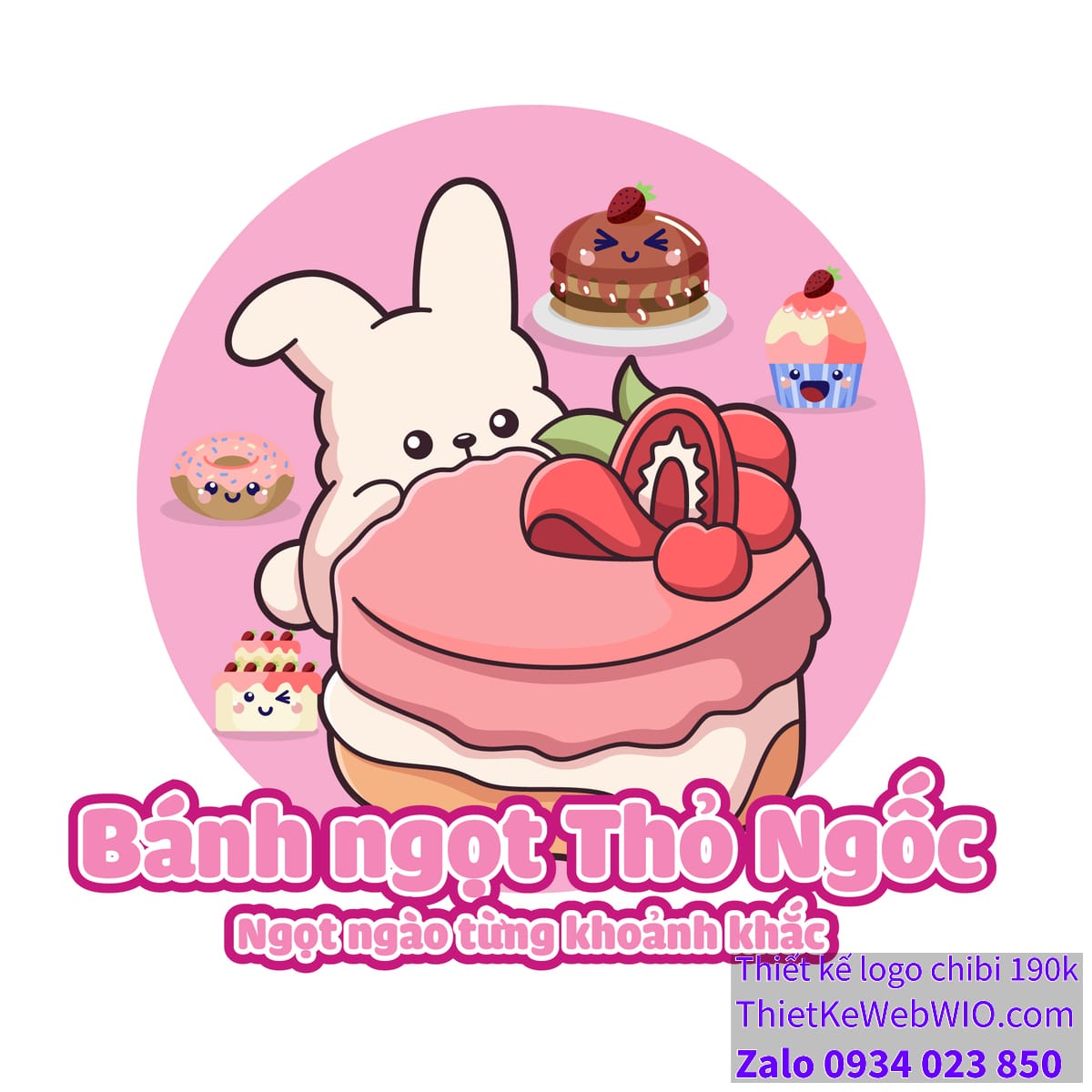 - Phía dưới bức ảnh chibi chú thỏ đáng yêu bán bánh ngọt là dòng chữ “Bánh ngọt Thỏ Ngốc” được viết bằng phông chữ mềm mại và màu hồng đậm, kèm theo slogan “Ngọt ngào từng khoảnh khắc”.