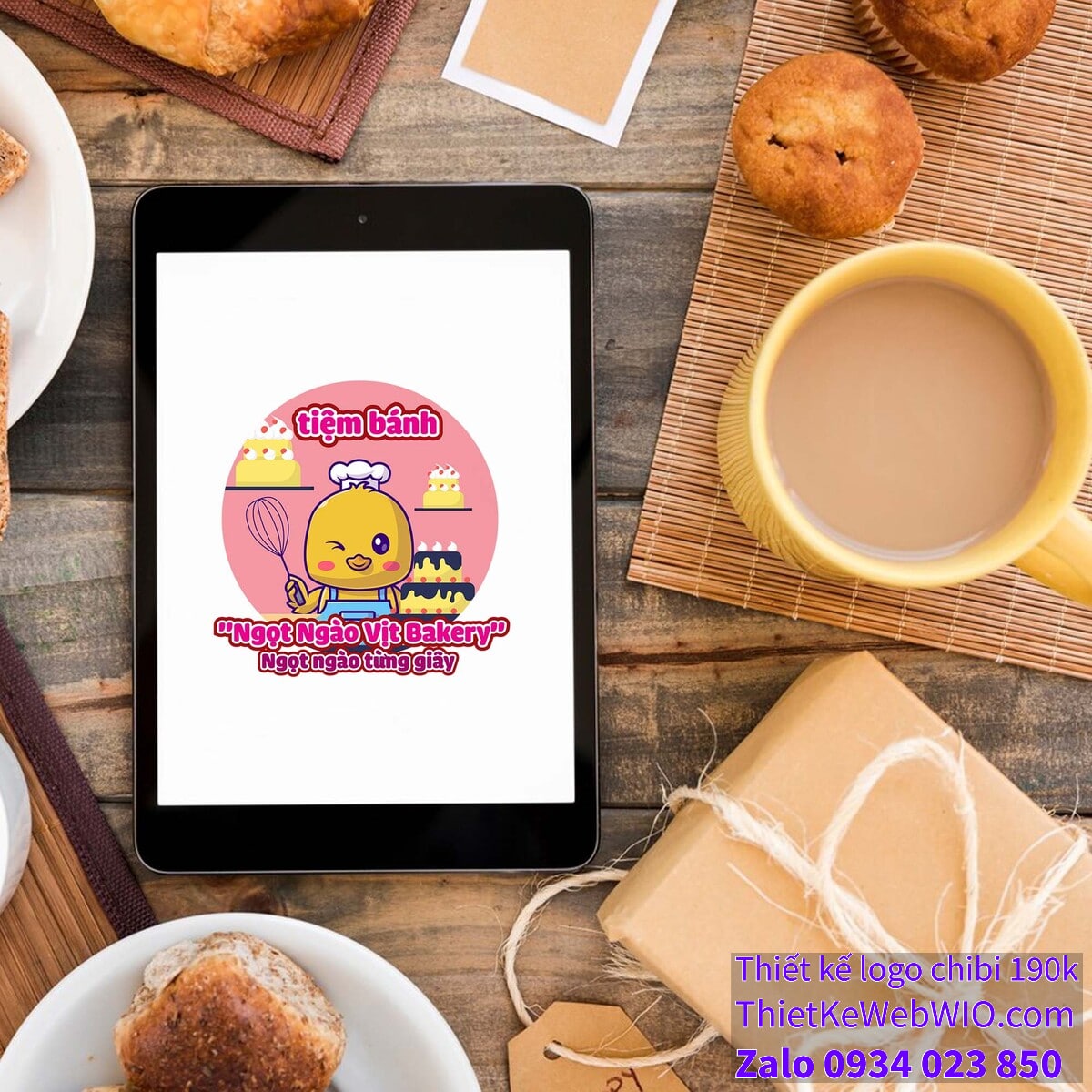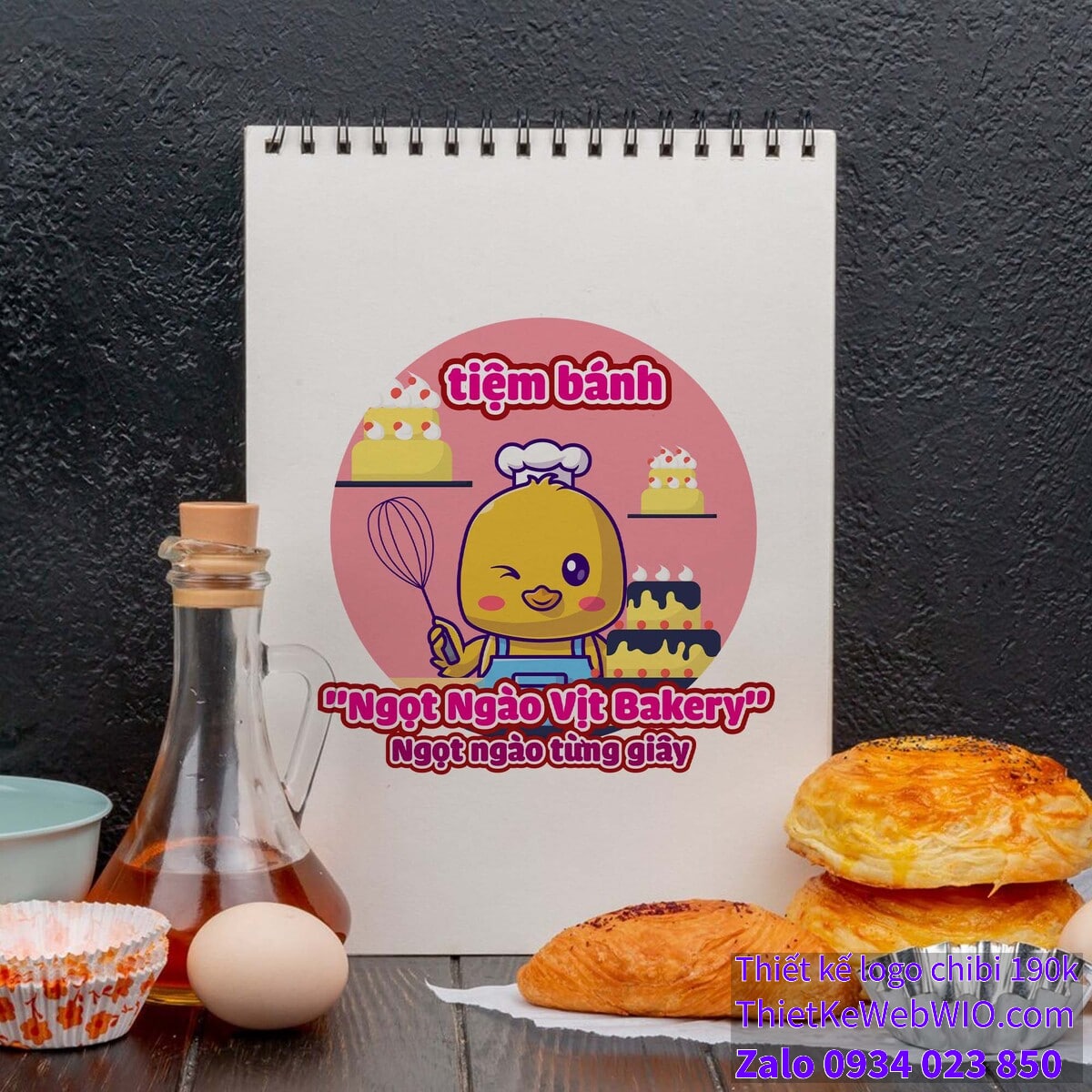 - Chú vịt đầu bếp: Nhân vật chính chibi chú vịt con đầu bếp đáng yêu đang làm bánh là chú vịt màu vàng, cánh hồng nhạt, má hồng, đang nháy mắt và cười tươi. Chú đội mũ đầu bếp màu trắng và mặc tạp dề màu xanh. Tay phải cầm một cây đánh trứng màu hồng, tay trái chống hông, tạo dáng tự tin và chuyên nghiệp.