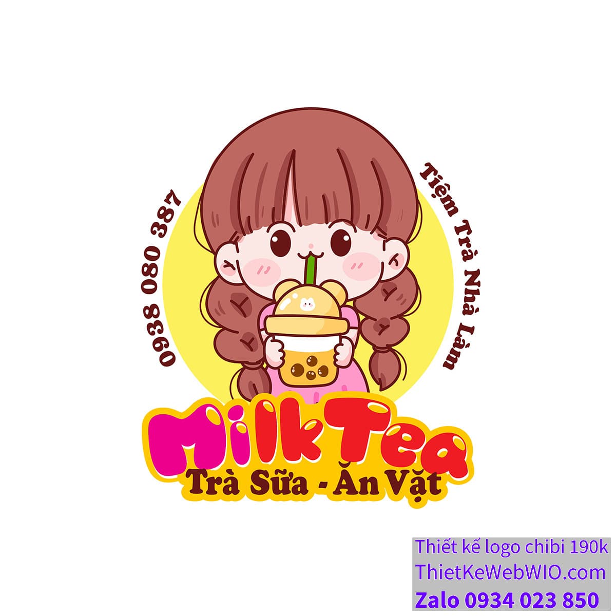 • Tên thương hiệu: Dưới hình ảnh chibi cô bé bím tóc dễ thương đang uống trà sữa là dòng chữ “Milk Tea” được thiết kế với phông chữ vui nhộn, bắt mắt, kết hợp với màu vàng và đỏ rực rỡ.