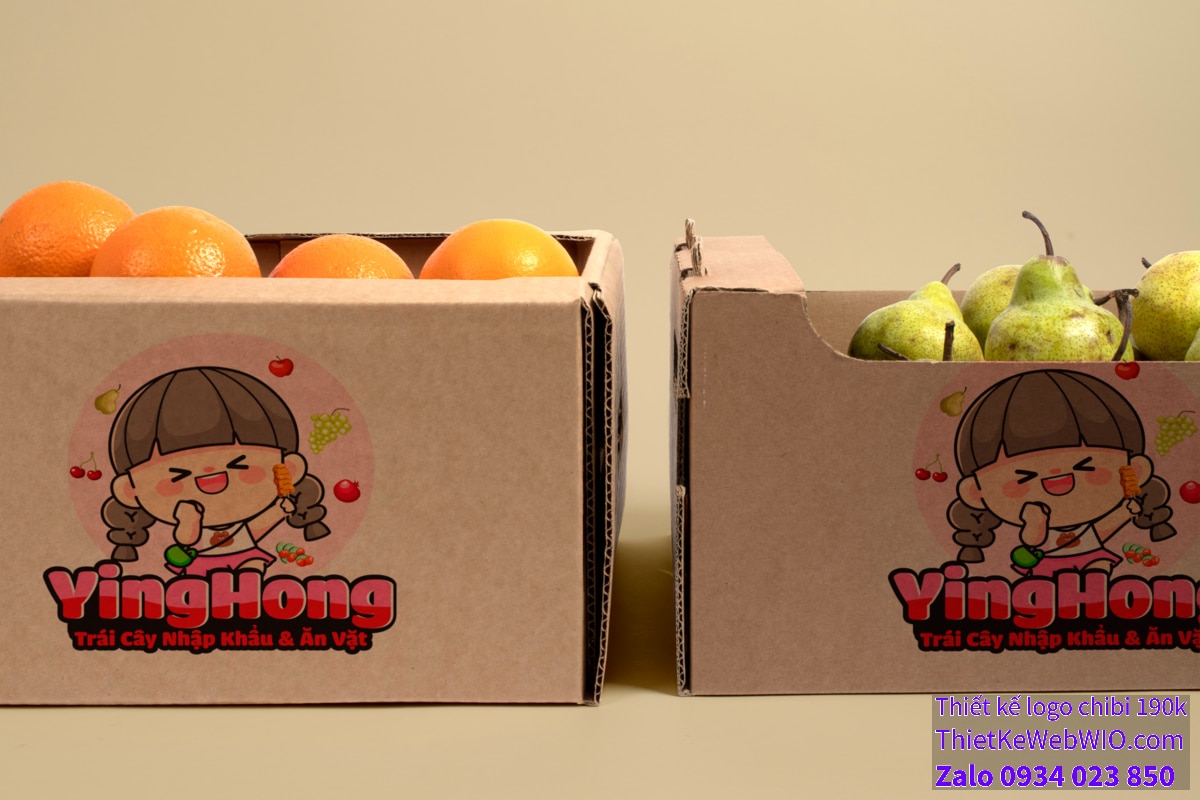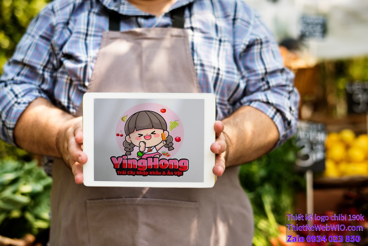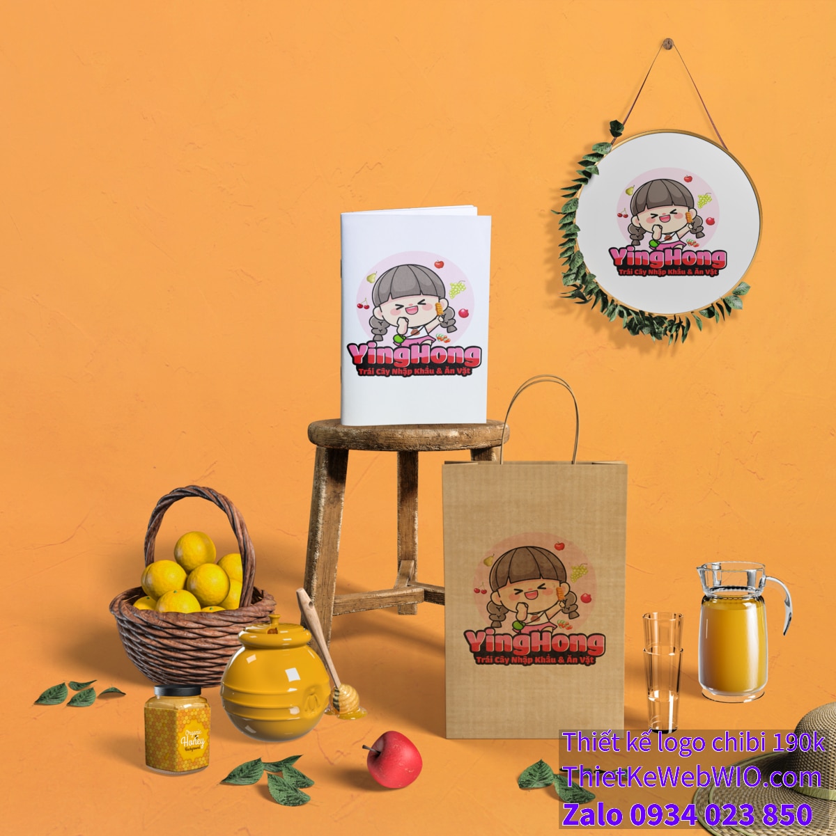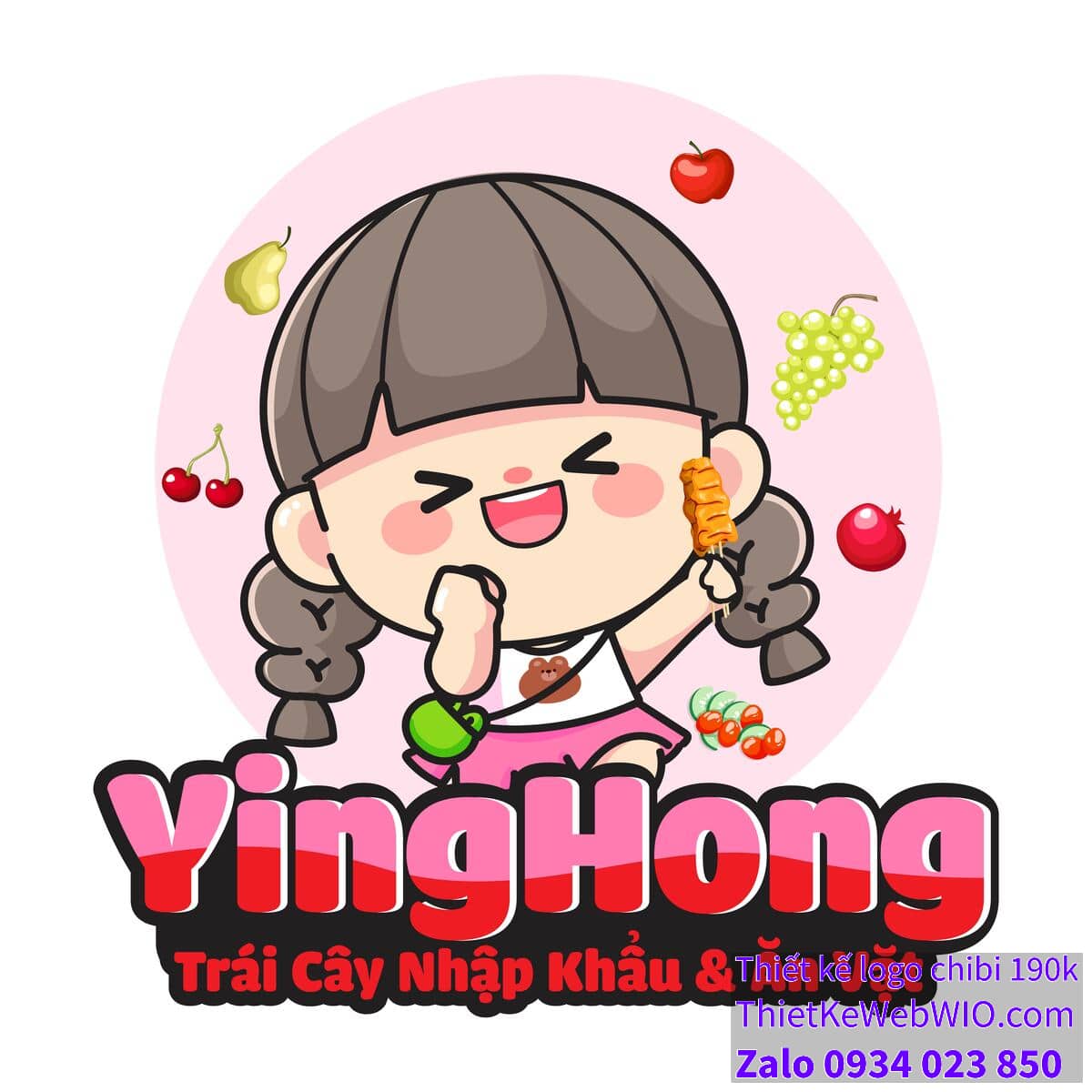 Tấm ảnh chibi cô gái dễ thương đang ăn vặt xung quanh là nhiều hoa quả là một tác phẩm thiết kế đáng yêu và sống động, mang đậm phong cách vẽ chibi. Tấm ảnh này được sử dụng để thiết kế logo cho một thương hiệu mang tên “YingHong” với thông điệp “Trái Cây Nhập Khẩu & Ăn Vặt.”