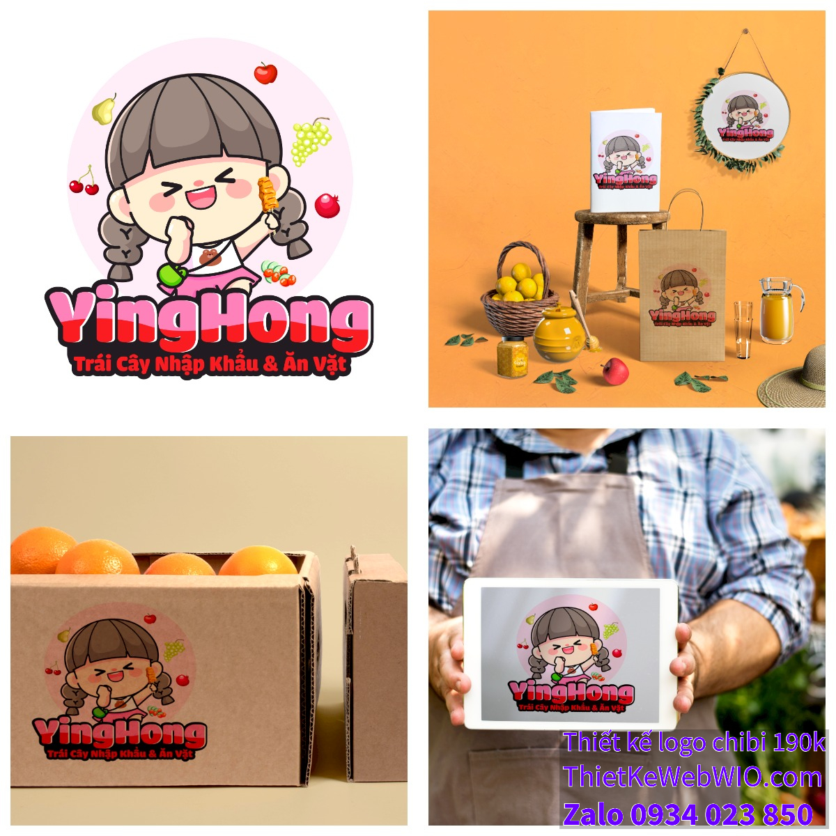 Tấm ảnh chibi cô gái dễ thương đang ăn vặt xung quanh là nhiều hoa quả là một tác phẩm thiết kế đáng yêu và sống động, mang đậm phong cách vẽ chibi. Tấm ảnh này được sử dụng để thiết kế logo cho một thương hiệu mang tên “YingHong” với thông điệp “Trái Cây Nhập Khẩu & Ăn Vặt.”