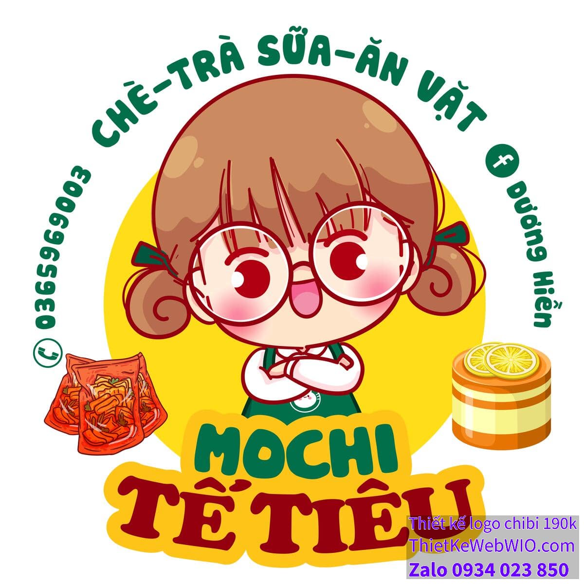 - Món ăn minh họa: Hình ảnh chibi cô gái đeo mắt kính to tròn bán đồ ăn vặt một đĩa đồ ăn vặt và một ly chè/trà sữa được đặt ở hai bên cô bé, gợi nhớ đến các món đặc trưng của quán.
