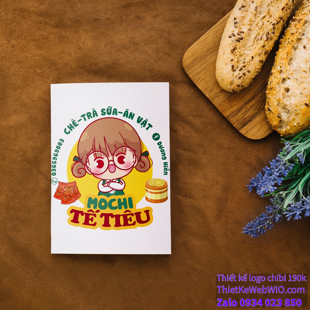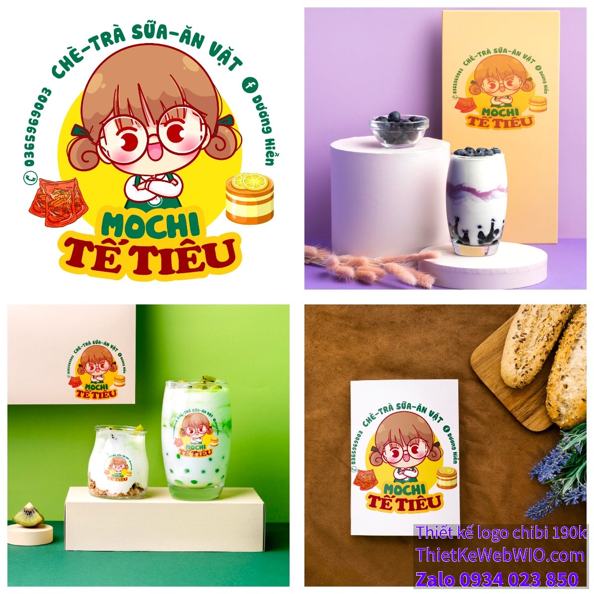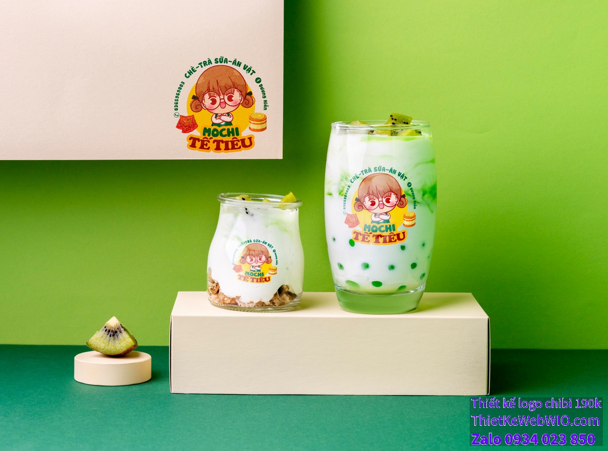 - Logo và tên cửa hàng: Ở phía trên đầu của cô bé là dòng chữ “CHÈ-TRÀ SỮA-ĂN VẶT” và tên “MOCHI TÊ TIÊU”. Đây là tên của quán, cho thấy nơi này chuyên phục vụ các loại chè, trà sữa và đồ ăn vặt.