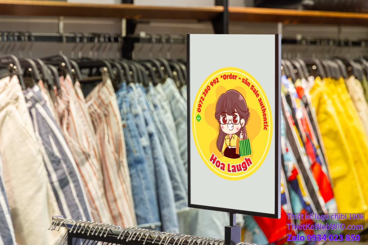 - Phía dưới hình ảnh chibi là dòng chữ “Hoa Laugh” được viết in đậm màu đỏ, vừa dễ đọc vừa nổi bật trên nền vàng.