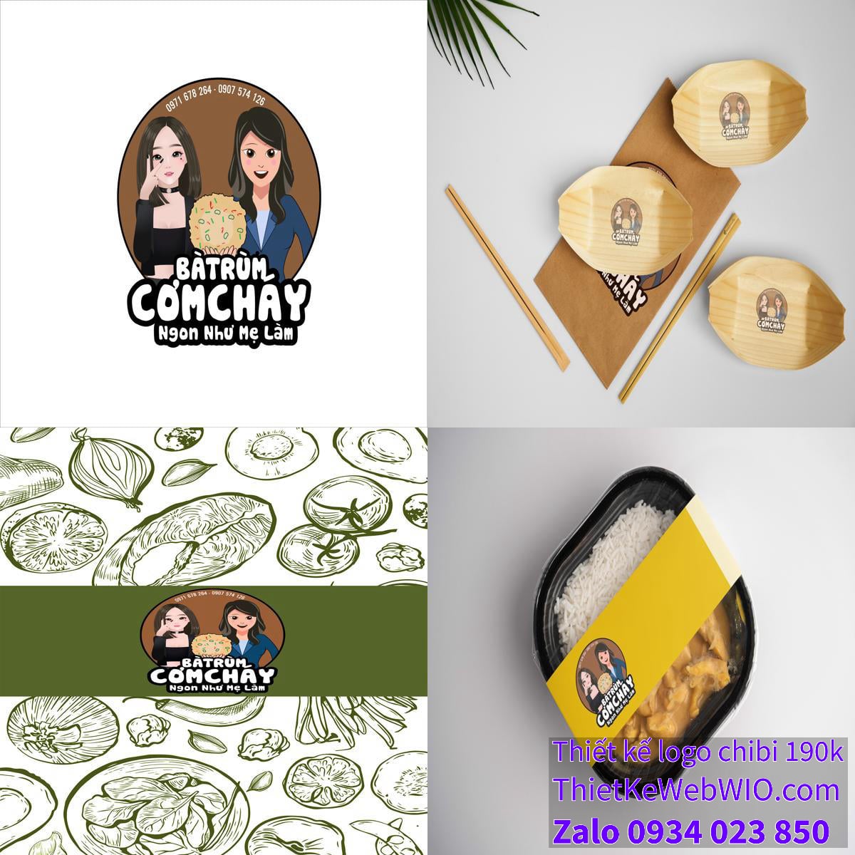 - Tên thương hiệu: Dưới hình ảnh chibi là dòng chữ “Bà Trùm Cơm Cháy – Ngon Như Mẹ Làm” được viết bằng font chữ tròn, dễ đọc, nổi bật trên nền trắng.