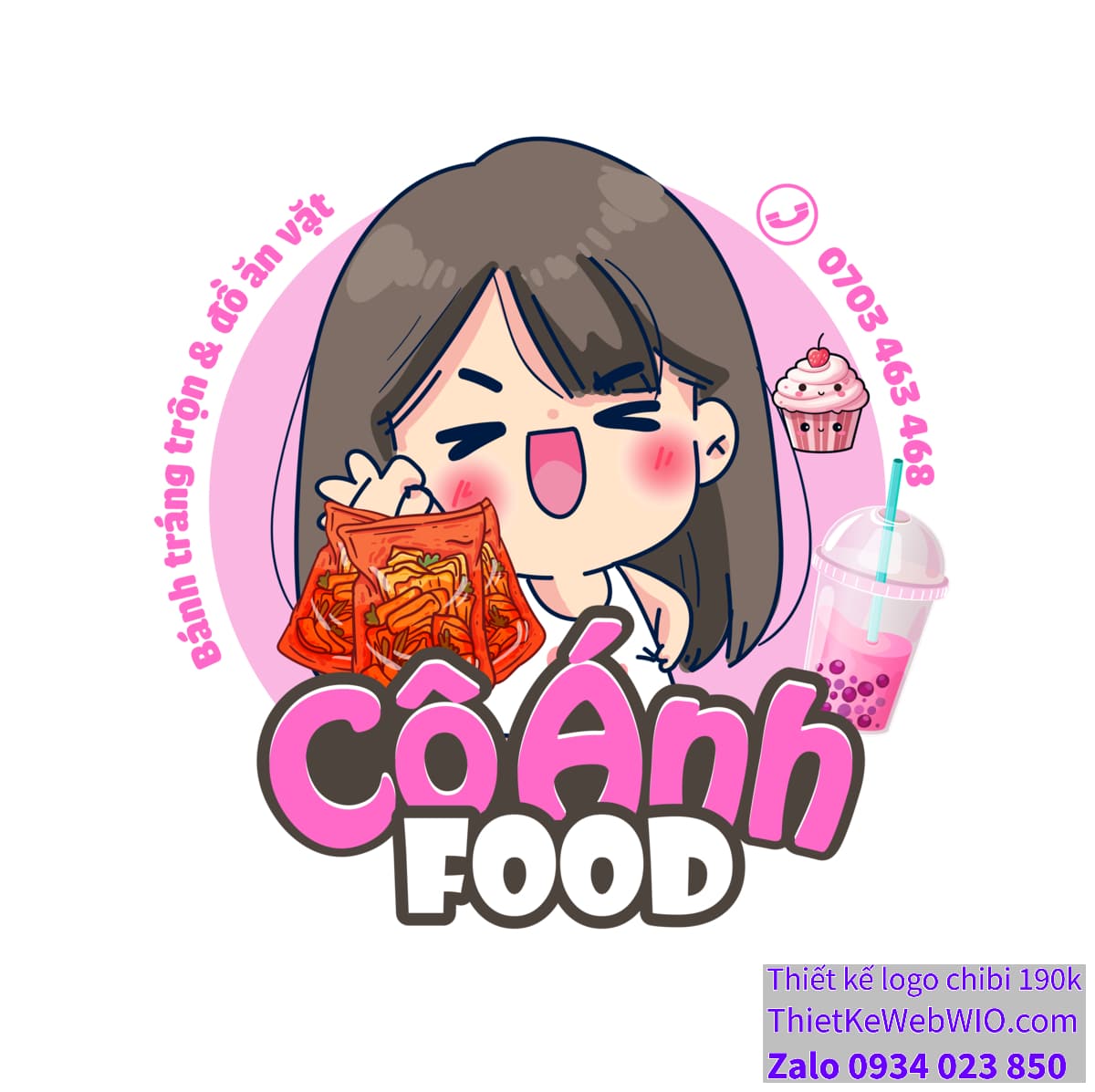 - Vòng tròn bao quanh: Nhân vật chibi cô gái tóc ngắn dễ thương bán đồ ăn vặt được bao quanh bởi một vòng tròn hồng, tạo khung nền vững chắc và nổi bật cho cô bé. Trong vòng tròn này, chúng ta thấy dòng chữ “Bánh tráng trộn & đồ ăn vặt” được viết bằng tiếng Việt, biểu thị rõ ràng lĩnh vực kinh doanh của thương hiệu.