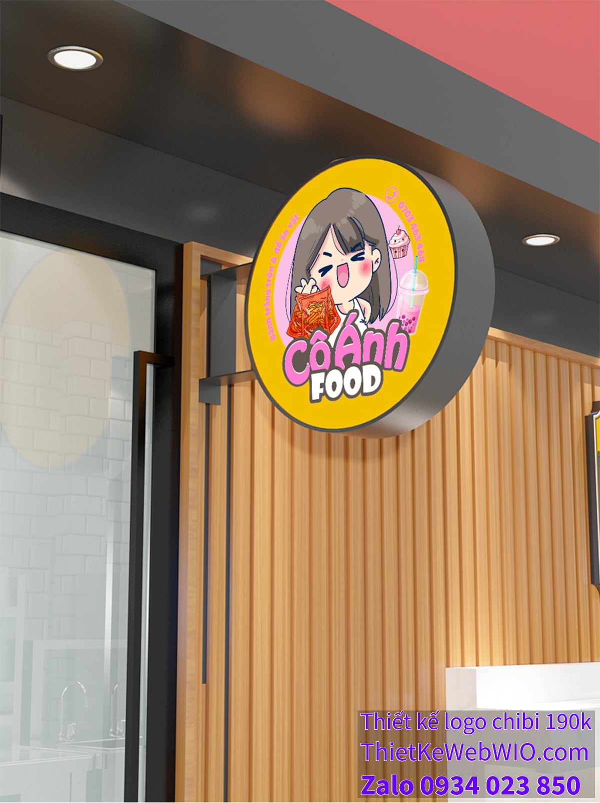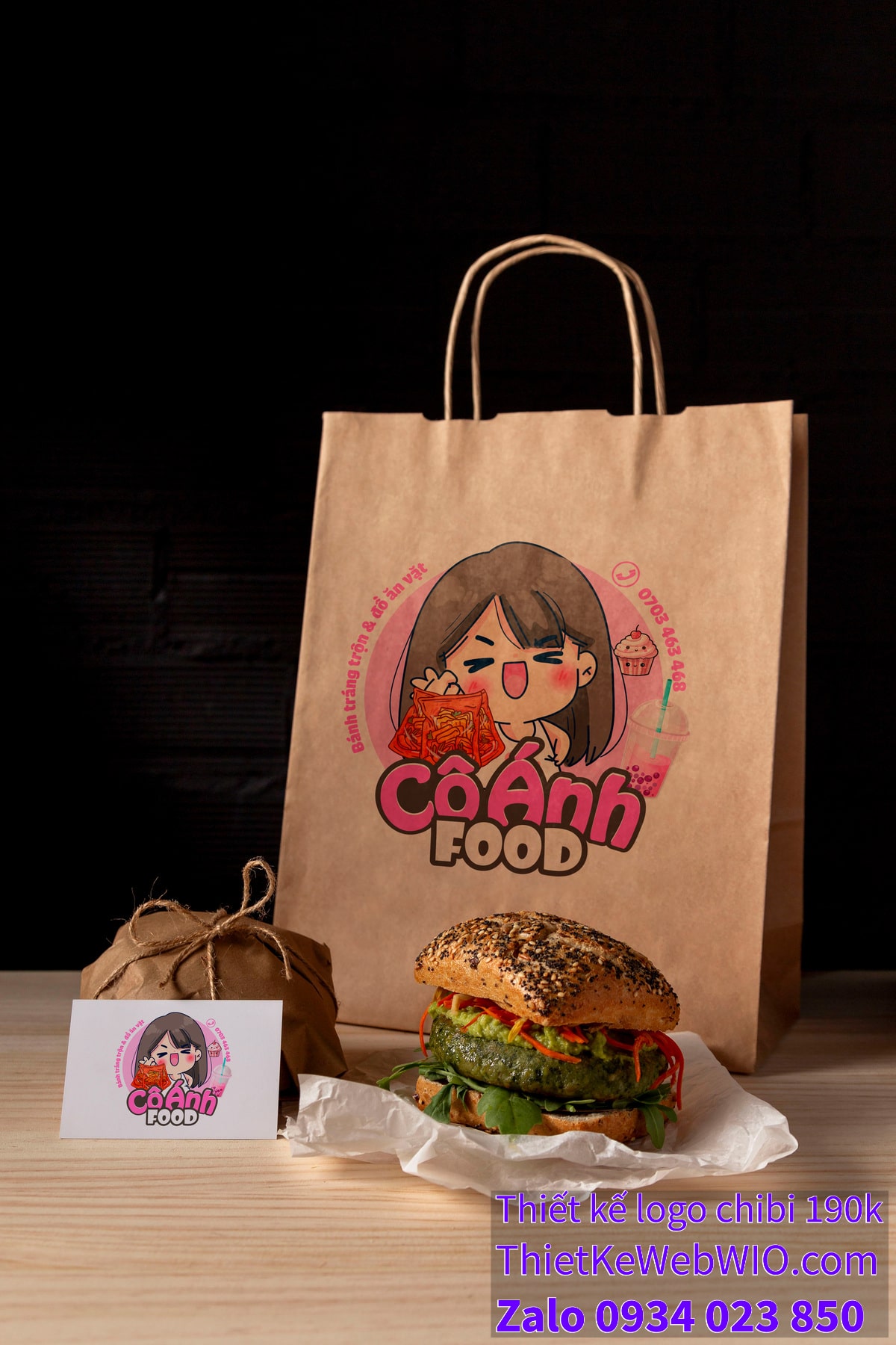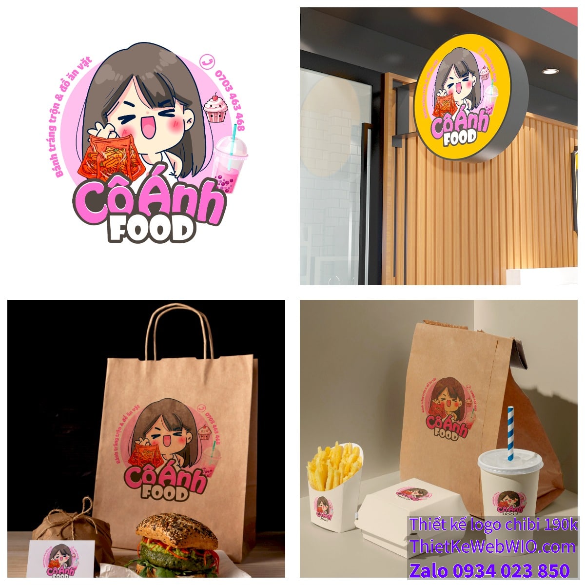 - Tên thương hiệu: Dưới hình ảnh cô bé chibi là tên thương hiệu “Cô Ánh Food” được viết bằng chữ lớn, đậm nét và dễ đọc. Màu sắc của chữ kết hợp giữa hồng và trắng, tạo cảm giác ngọt ngào và dễ thương.