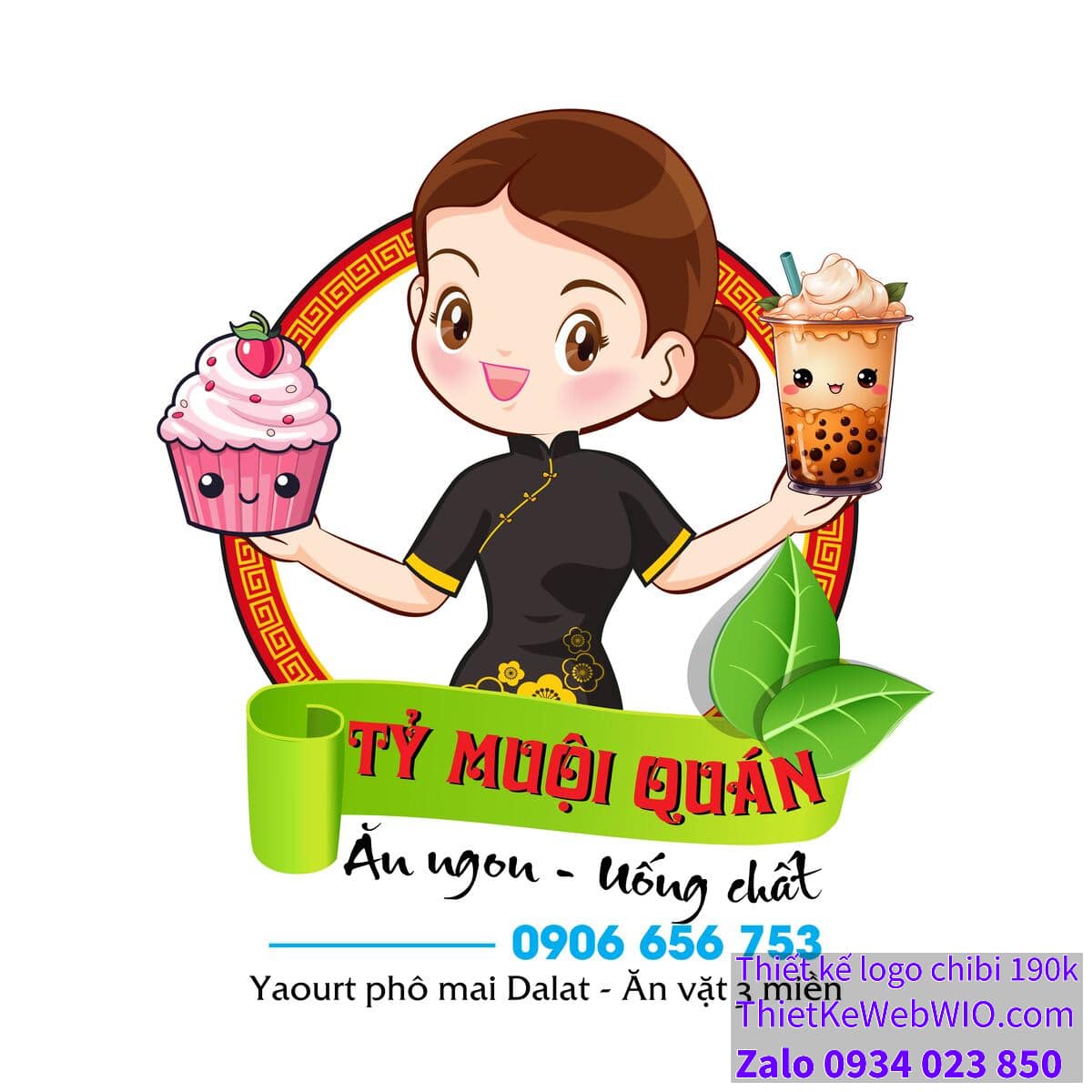 Vẽ chibi cô gái truyền thống Việt Nam mặc tân thời bán trà sữa và kem để thiết kế logo