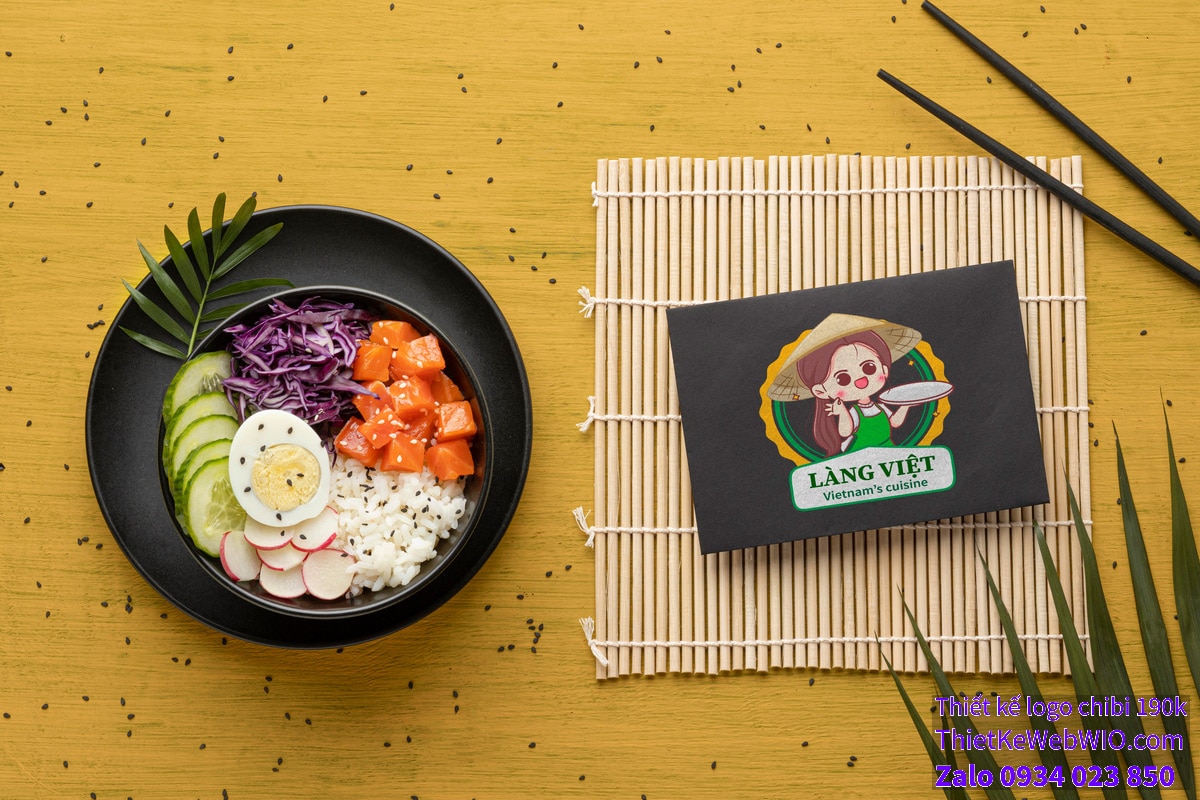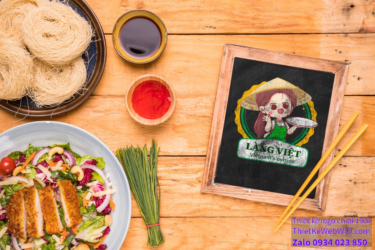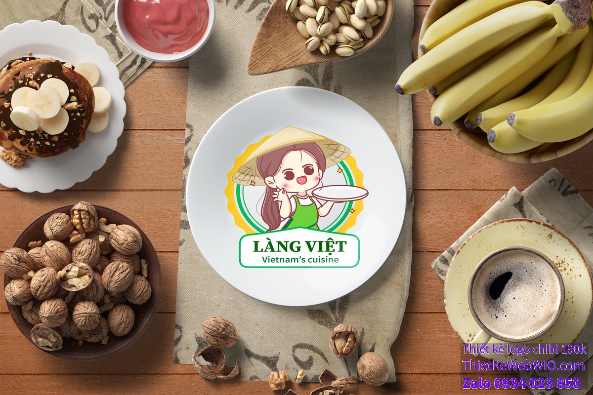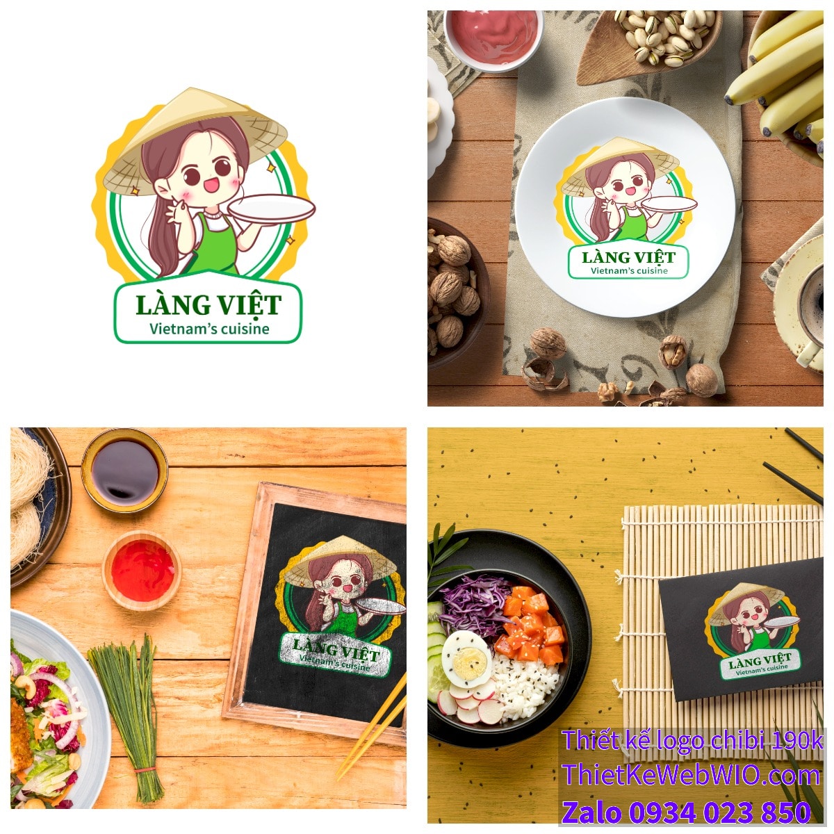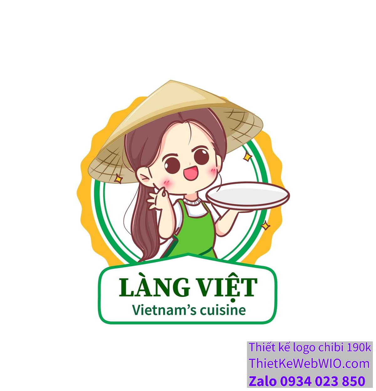 Bức ảnh chibi cô gái Việt Nam dễ thương, đội nón lá và cầm đĩa, được sử dụng để thiết kế logo cho thương hiệu “Làng Việt – Vietnam’s cuisine”.