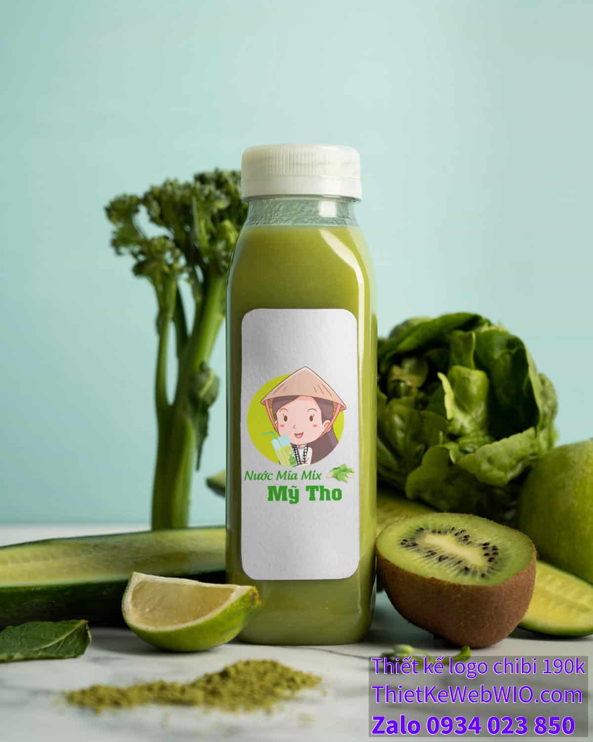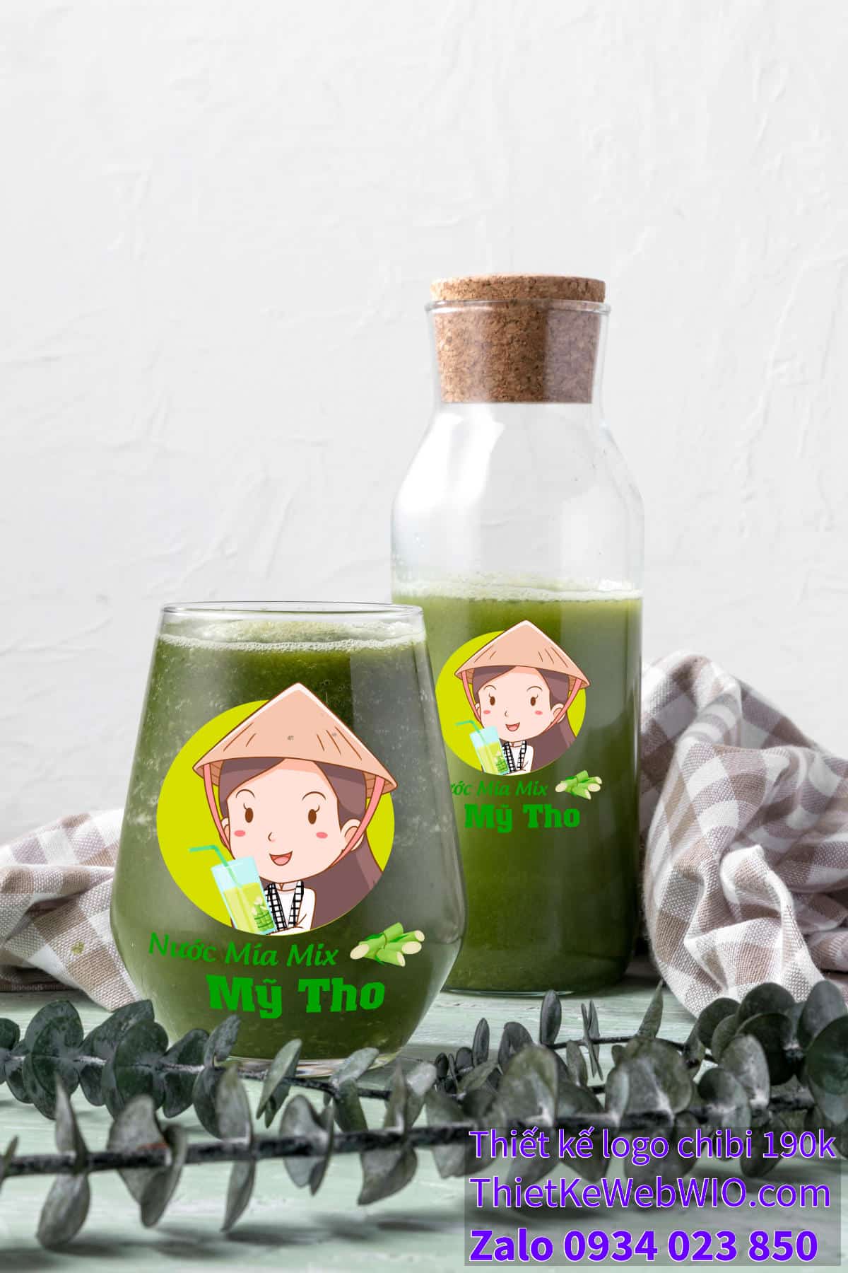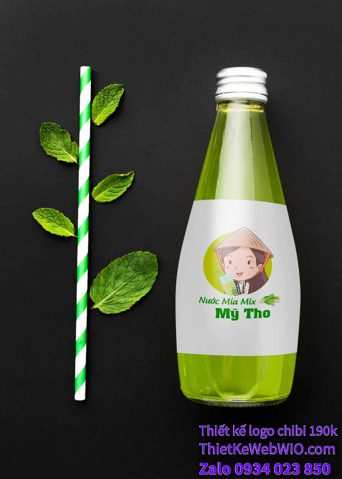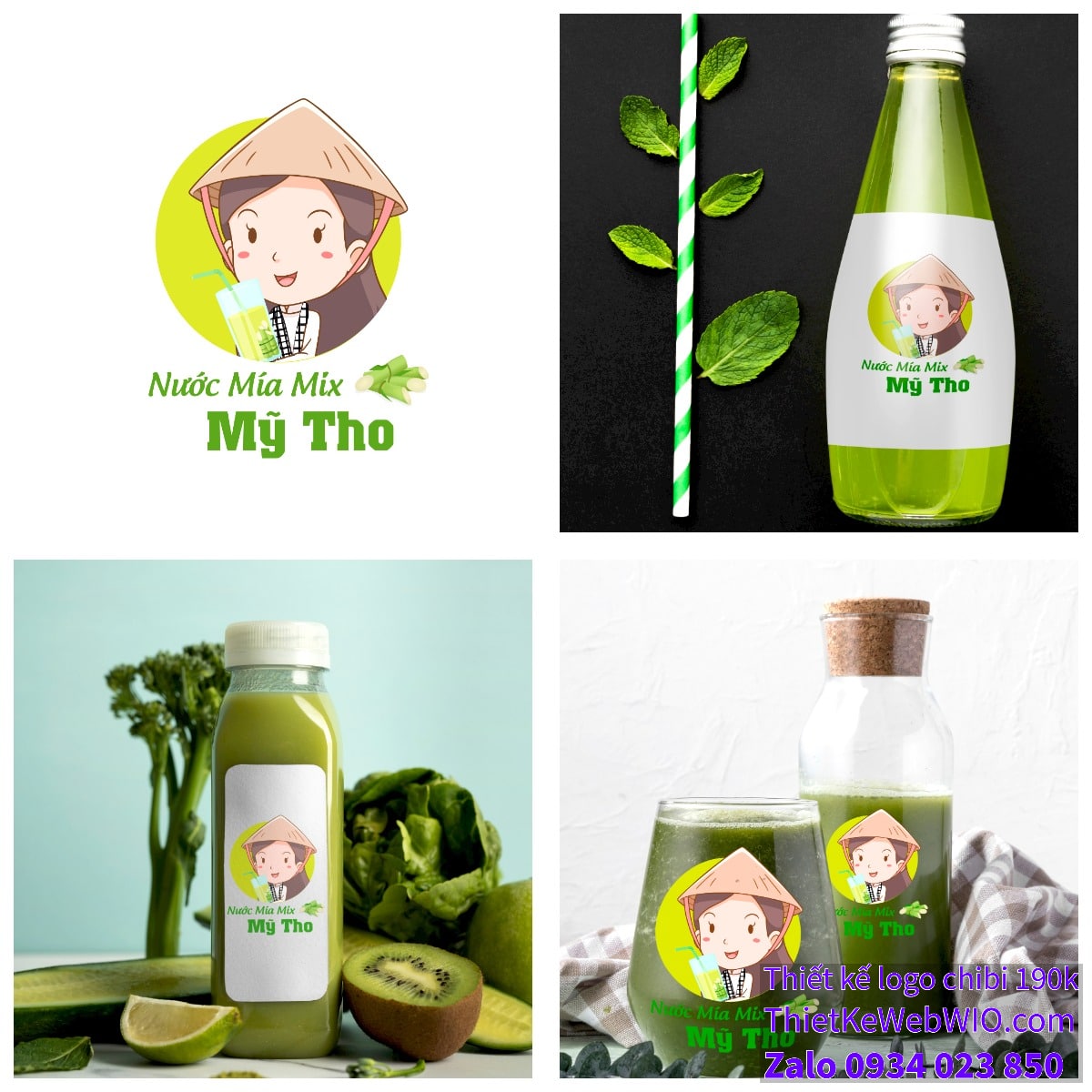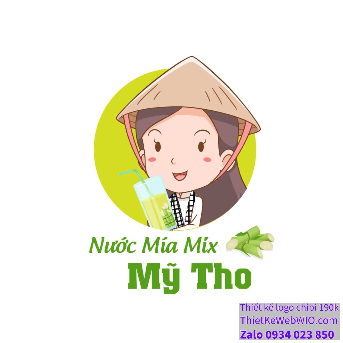 - Phía dưới hình ảnh chibi cô gái Việt Nam đội nón lá uống nước mía là dòng chữ “Nước Mía Mix Mỹ Tho”, được viết bằng font chữ rõ ràng và nổi bật. Màu xanh của chữ hài hòa với tổng thể bức ảnh, tạo nên sự nhất quán và dễ nhận diện.