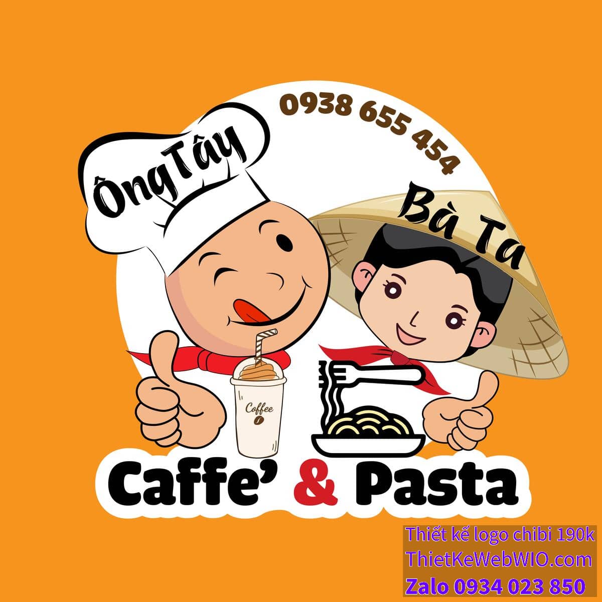 Vẽ chibi đầu bếp nam và cô nông dân đội nón lá bán cà phê và mì ý để thiết kế logo