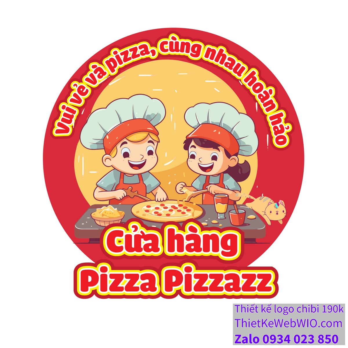 Bức ảnh chibi đầu bếp nam và đầu bếp nữ đang cùng làm pizza này là một hình ảnh minh họa sống động và dễ thương, thể hiện hai đứa trẻ đang làm pizza trong một tiệm pizza tên là “Pizza Pizzazz”. Tông màu chủ đạo của bức ảnh là đỏ và vàng, tạo cảm giác ấm áp và vui tươi.