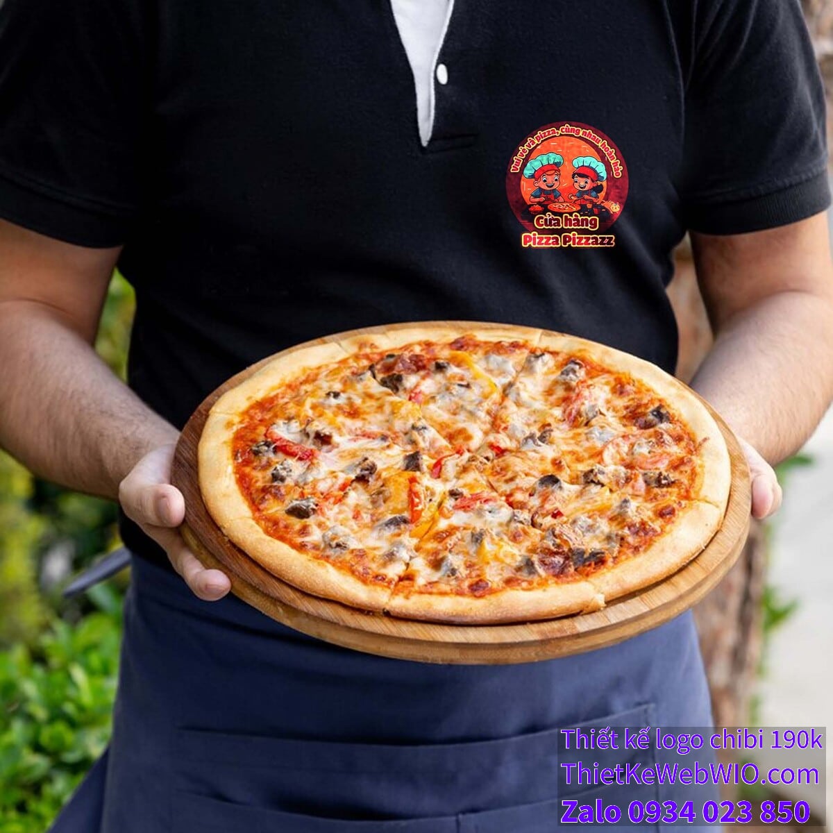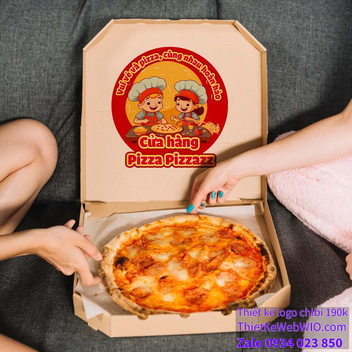- Phía trên cùng của hình ảnh chibi đầu bếp nam và đầu bếp nữ đang cùng làm pizza là dòng chữ “Vui vẻ và pizza, cùng nhau hoàn hảo” được viết bằng chữ đỏ đậm, viền vàng, nổi bật trên nền đỏ.