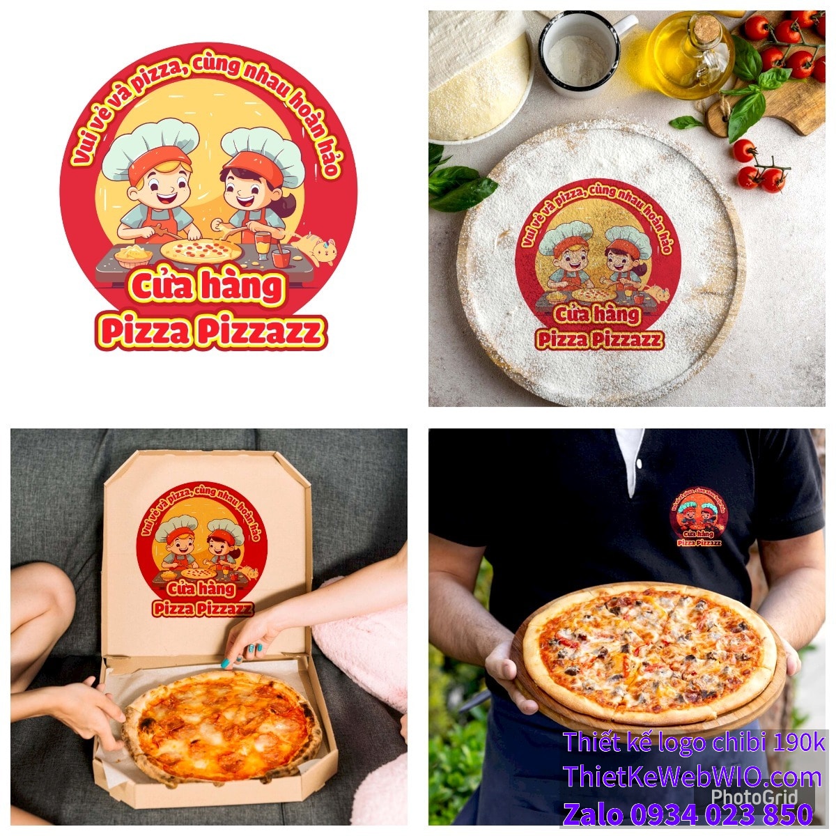 - Ở phía dưới hình ảnh là tên cửa hàng “Cửa hàng Pizza Pizzazz”, cũng được viết bằng chữ đỏ đậm, viền vàng, dễ dàng thu hút sự chú ý.