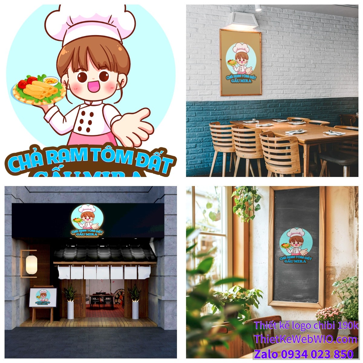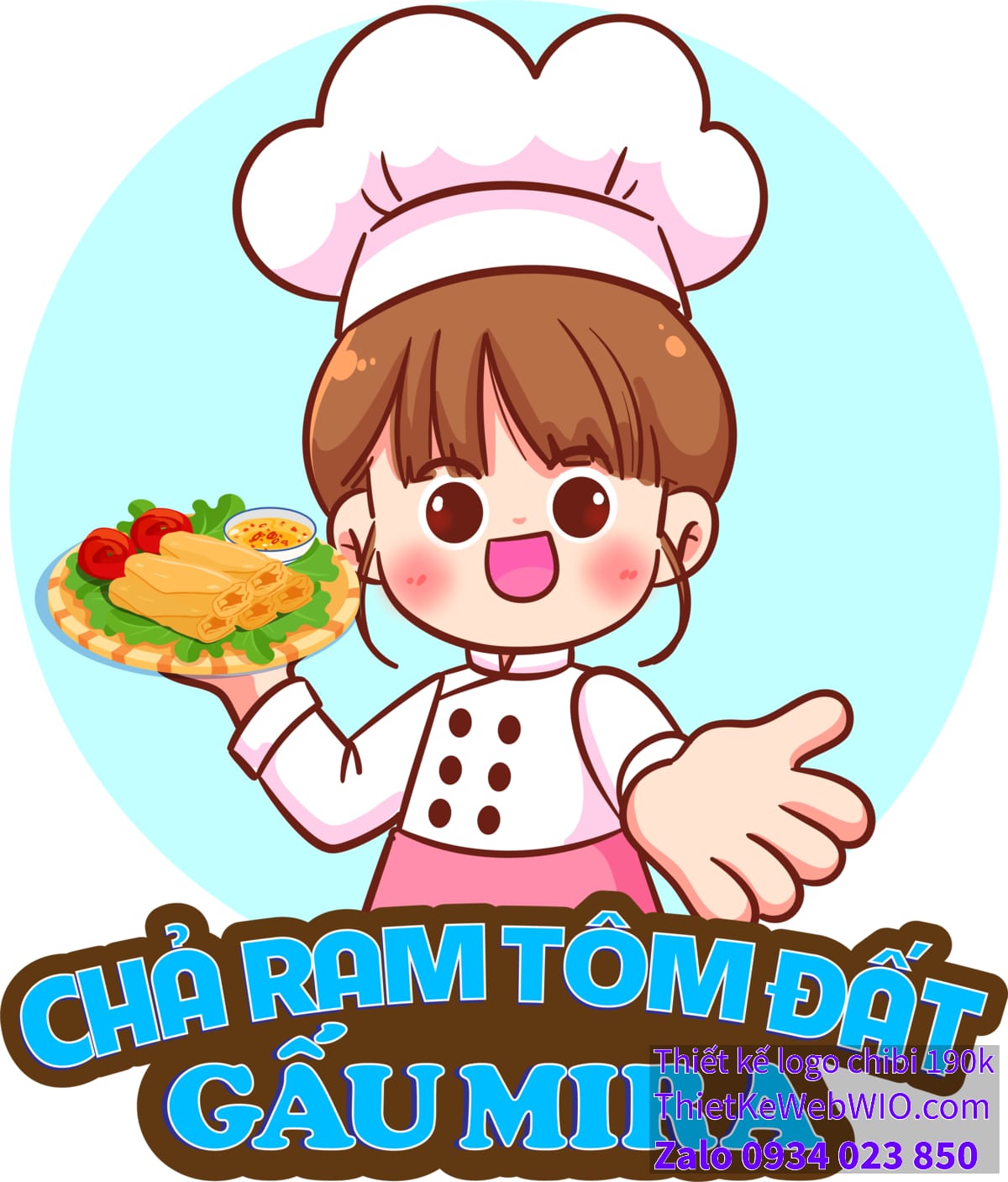 Vẽ chibi đầu bếp nữ đang giới thiệu món chả ram tôm đất để thiết kế logo