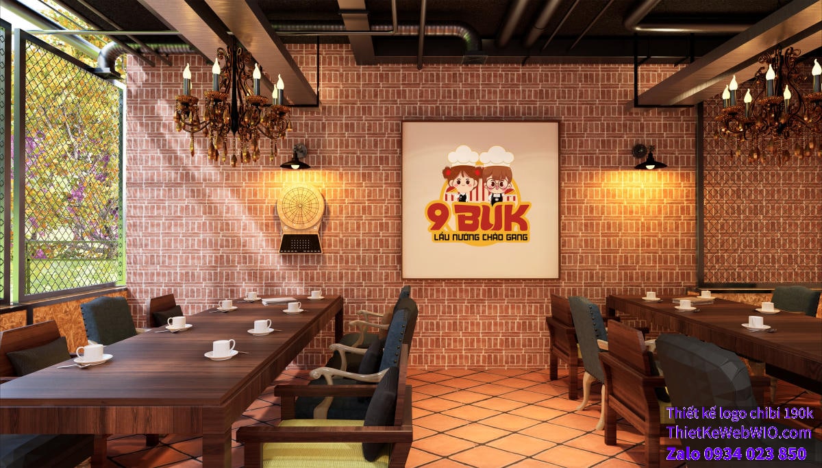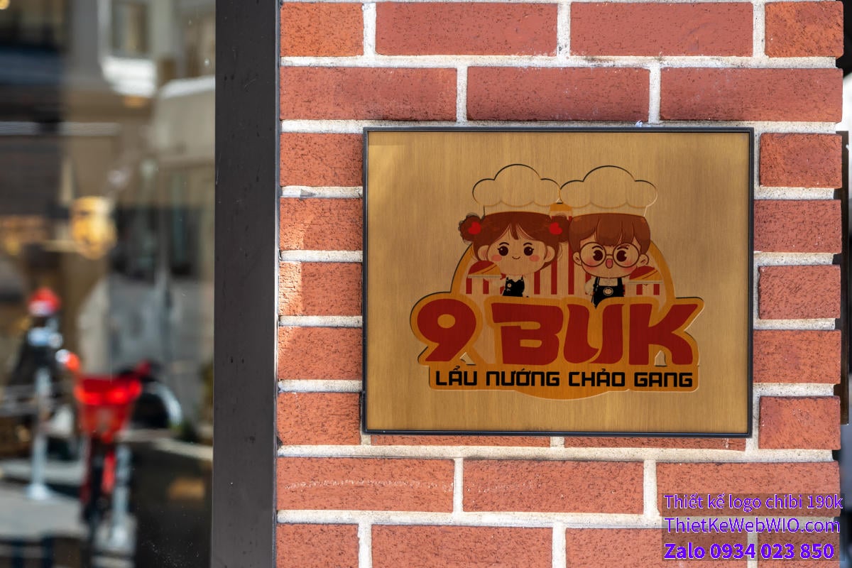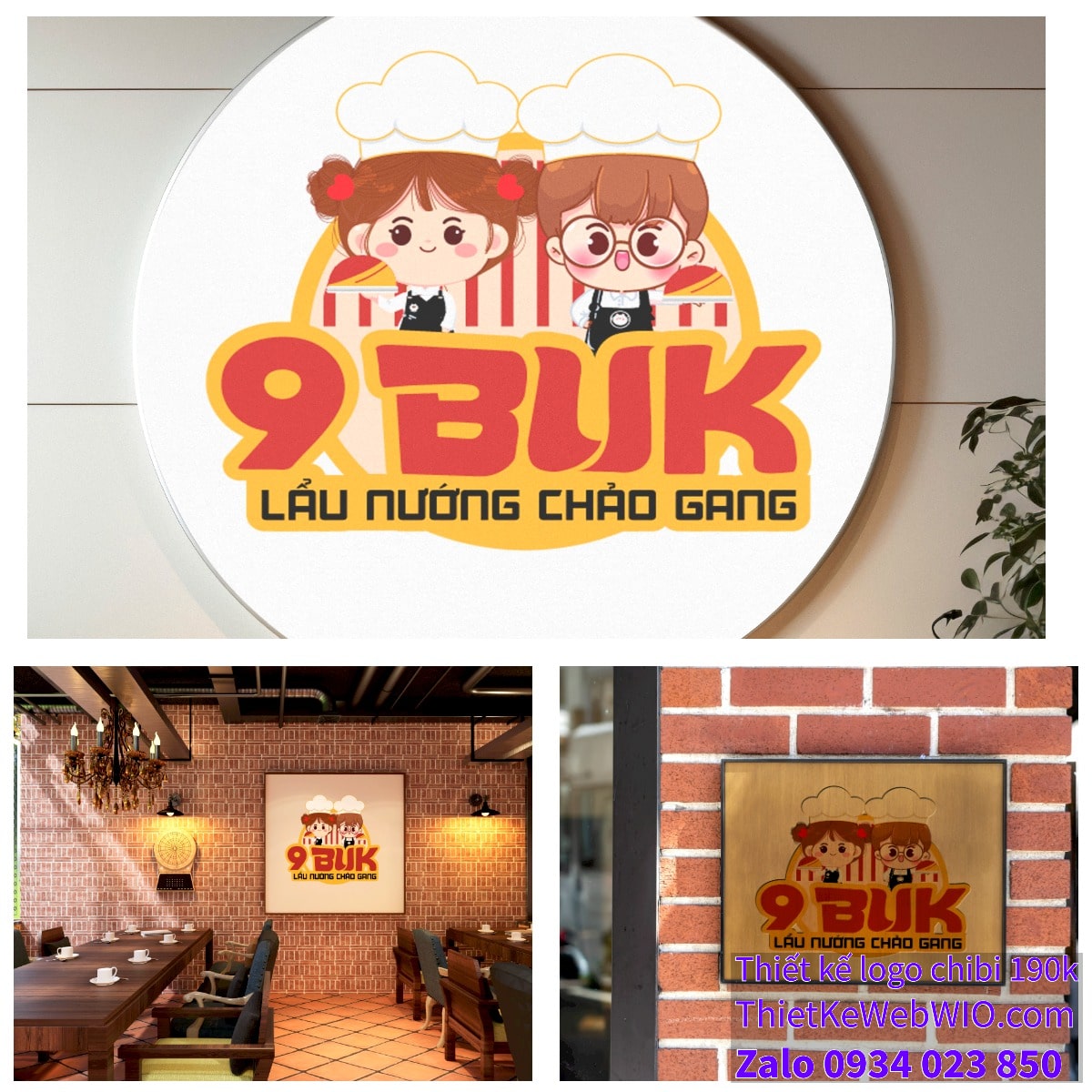 - Tên cửa hàng: Phía dưới hai nhân vật là dòng chữ “9 BUK” được viết bằng font chữ to, rõ ràng, màu đỏ. Bên dưới đó là dòng chữ “Lẩu Nướng Chảo Gang” viết bằng tiếng Việt, thể hiện tên và loại hình dịch vụ của cửa hàng.