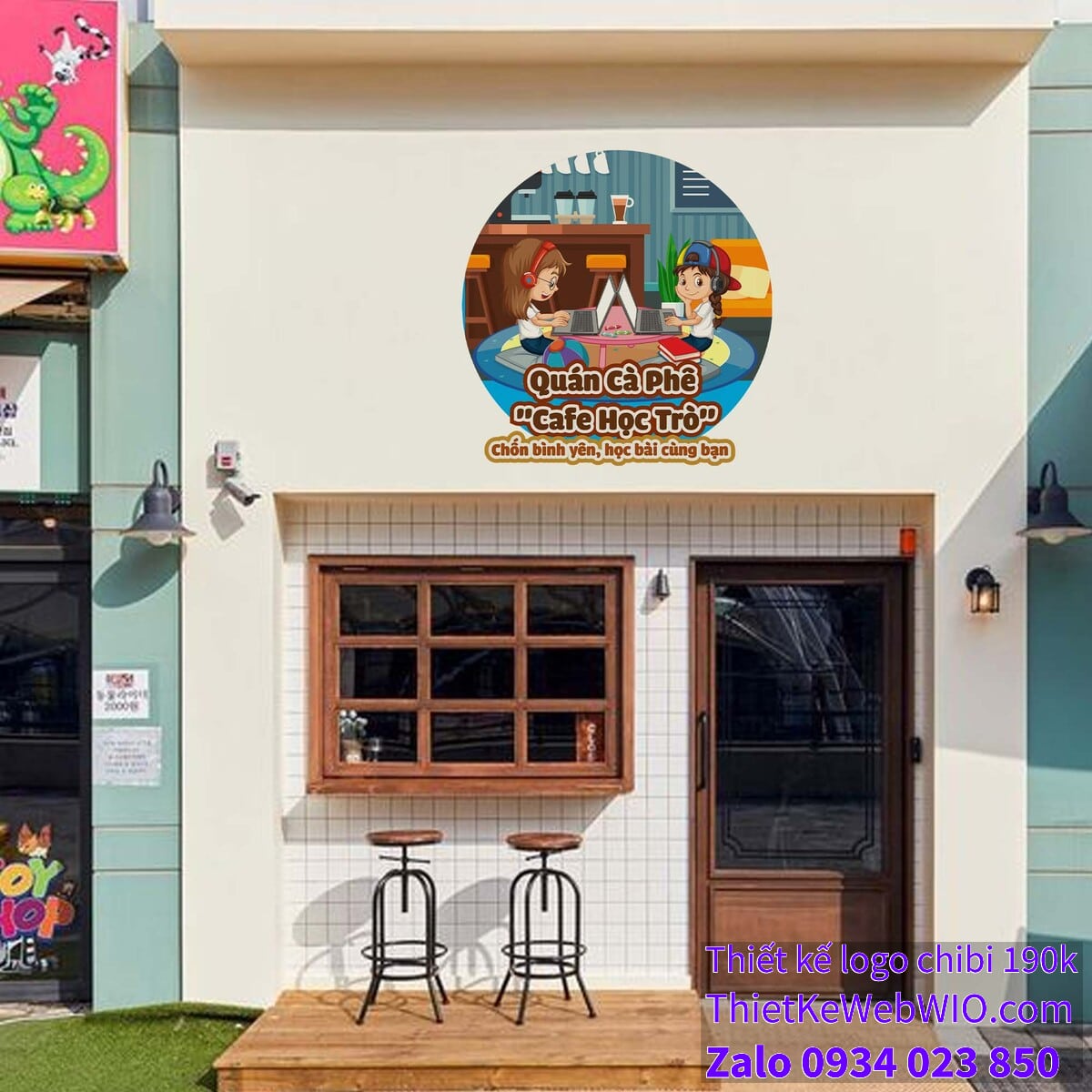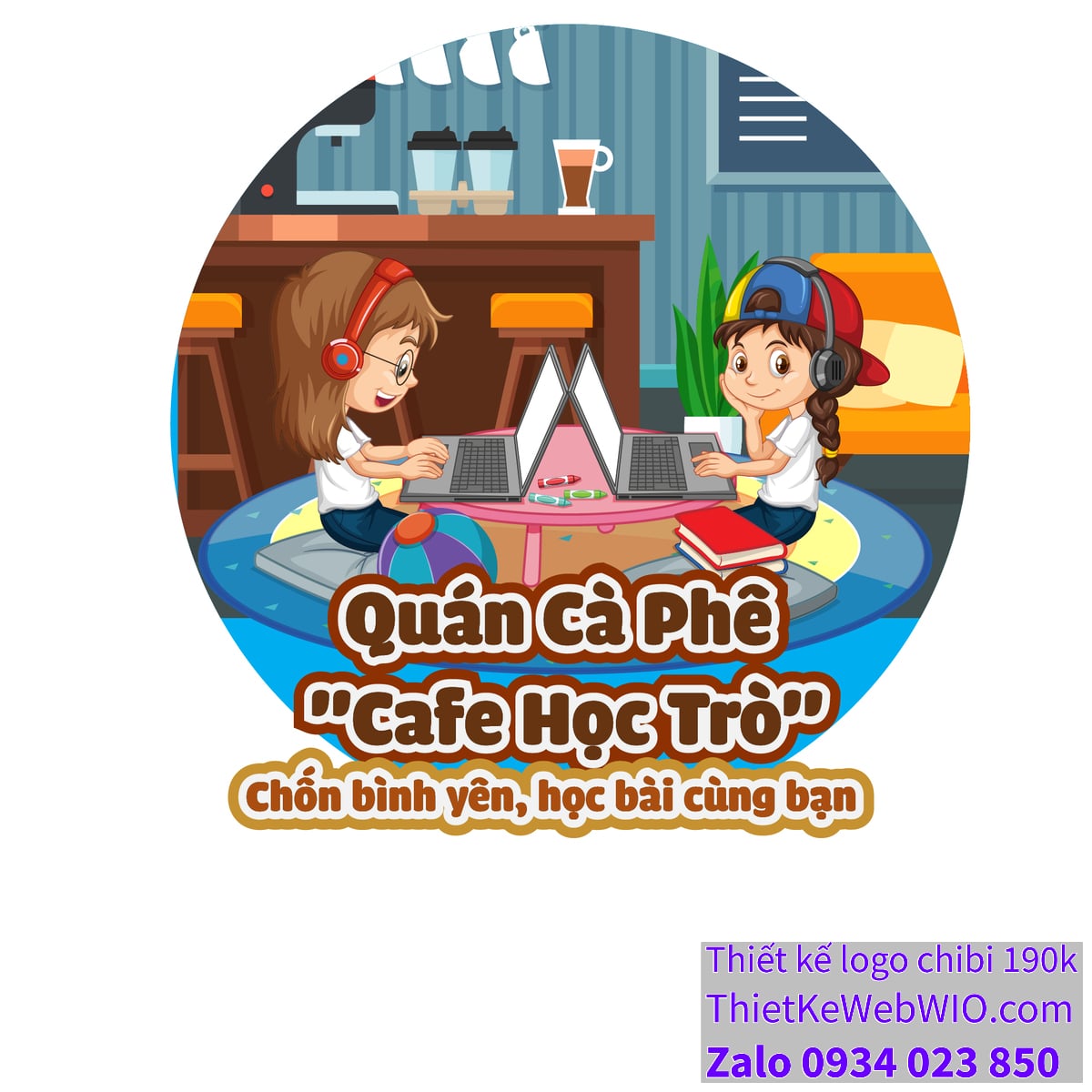 - Dưới cùng của ảnh chibi hai cô gái đang cùng nhau học tập qua laptop trong quán cà phê có dòng chữ “Quán Cà Phê ‘Cafe Học Trò'” với font chữ dễ đọc, màu nâu đậm và đường viền trắng, tạo sự nổi bật trên nền xanh.
