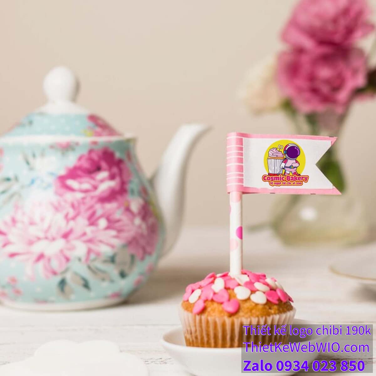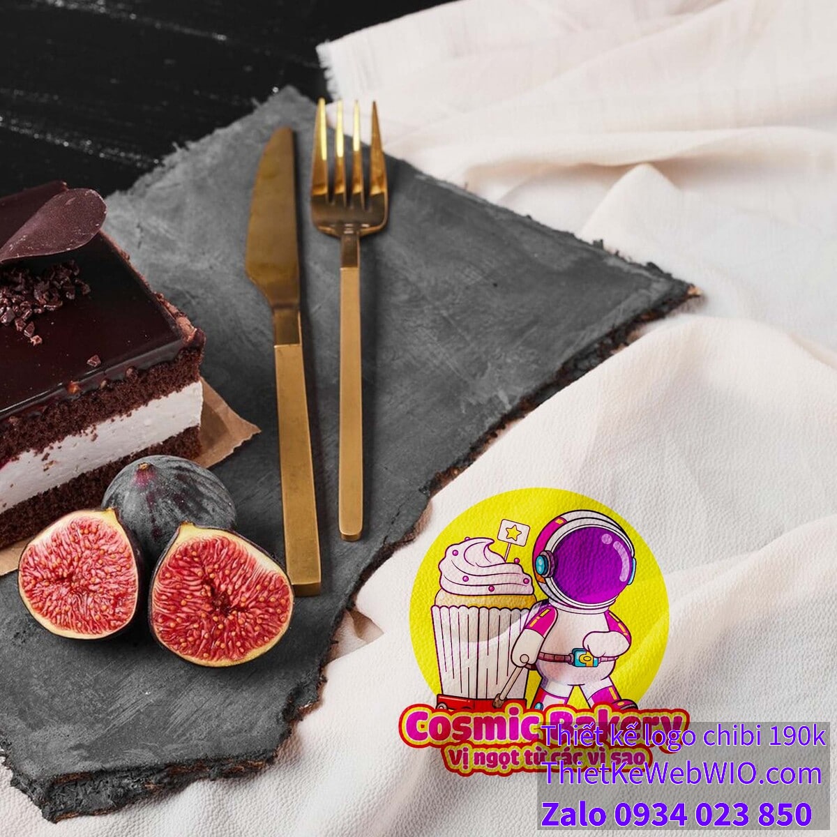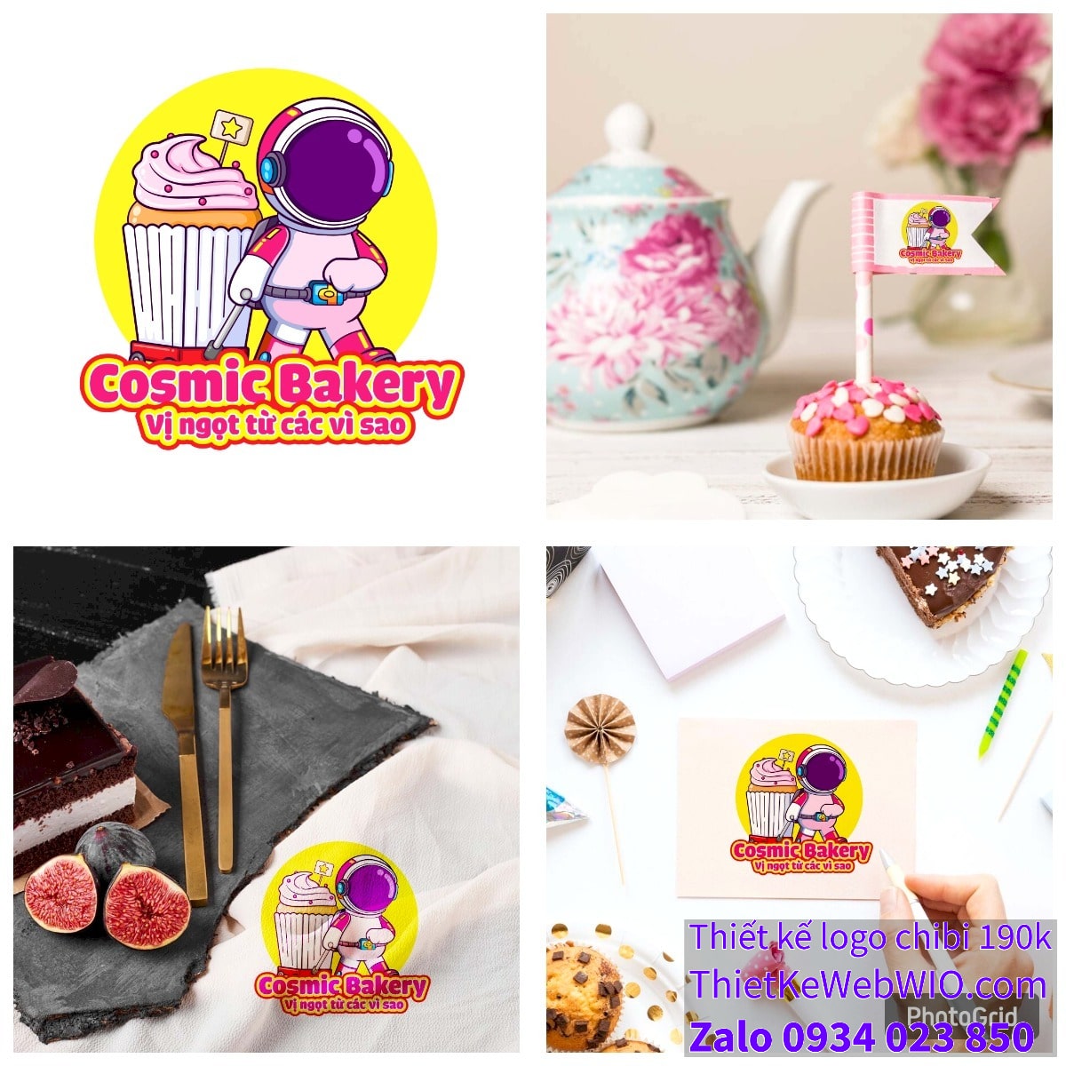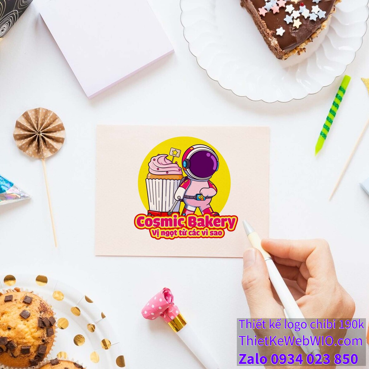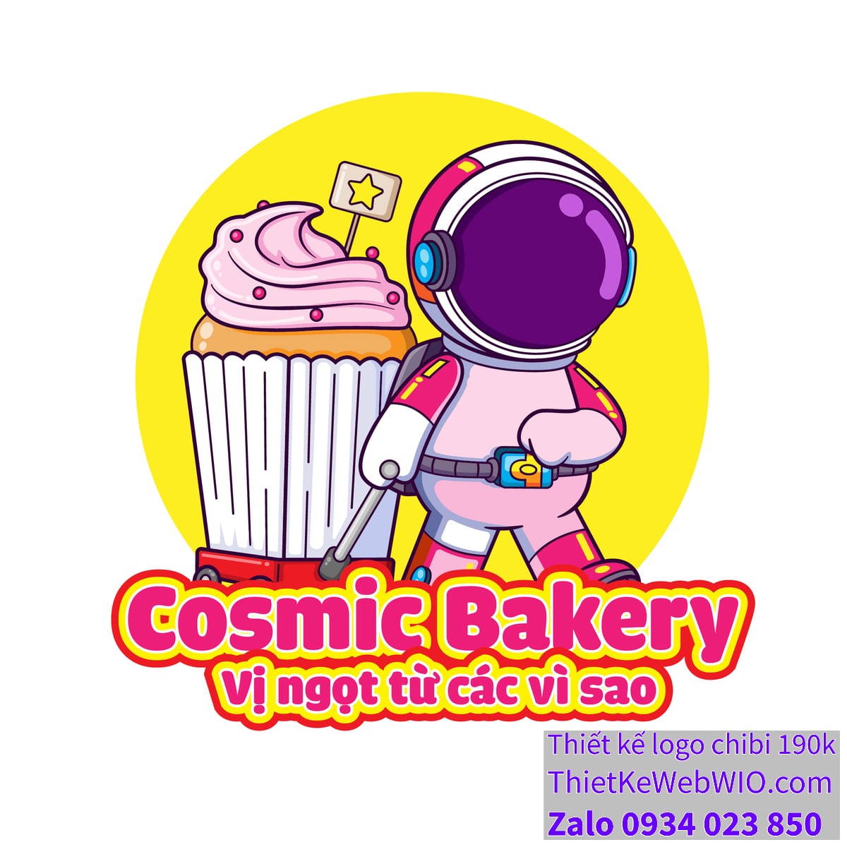 Bức ảnh chibi phi hành gia bán bánh ngọt  mô tả một nhân vật phi hành gia dễ thương cùng một chiếc bánh cupcake khổng lồ, tạo nên một phong cách tươi sáng và đầy màu sắc. Tấm ảnh này là biểu tượng của “Cosmic Bakery” với slogan “Vị ngọt từ các vì sao”.