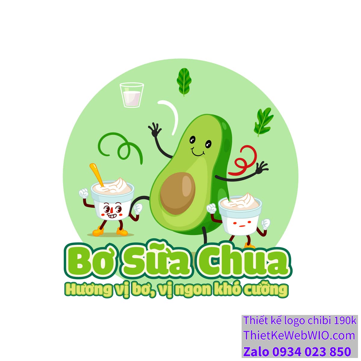 - Nhân vật chibi đáng yêu: Các nhân vật chibi gồm một trái bơ lớn, hai cốc sữa chua và các phụ kiện xung quanh như lá bơ, ly sữa, và các đường cong trang trí. Các nhân vật đều có khuôn mặt tươi cười, đáng yêu, mang lại cảm giác vui vẻ và thân thiện.