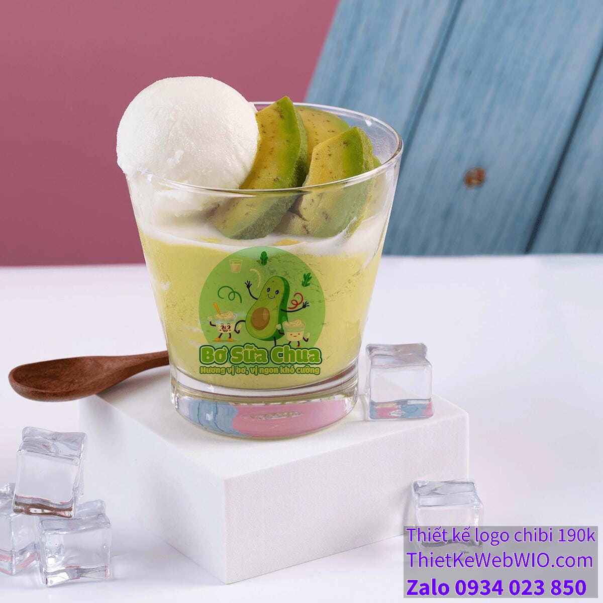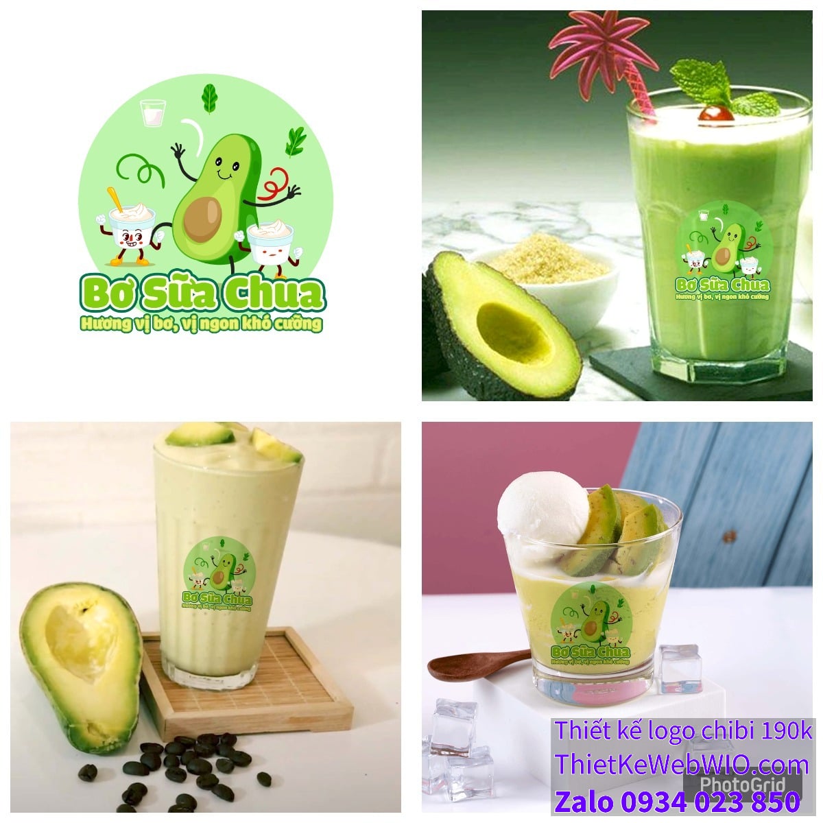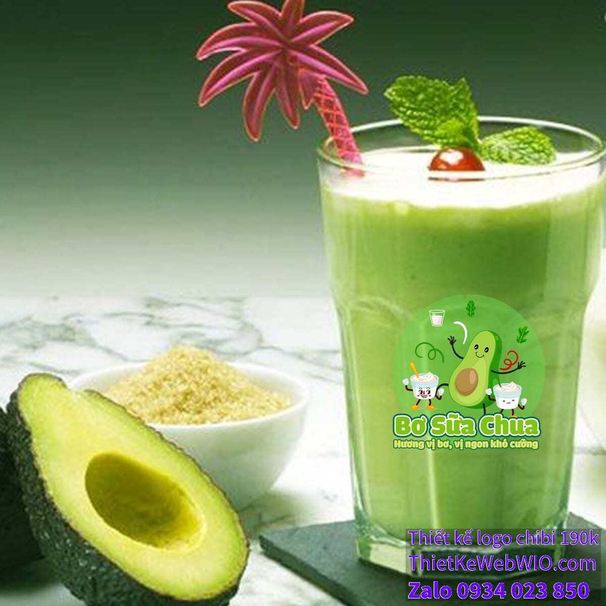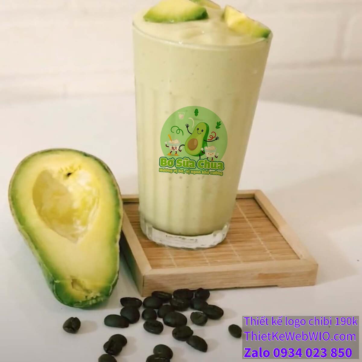- Slogan hấp dẫn: Phía dưới bức tranh chibi quả bơ đang cười vui vẻ bên ly sữa chua có dòng chữ “Bơ Sữa Chua” cùng với slogan “Hương vị bơ, vị ngon khó cưỡng”, được thiết kế bằng font chữ mềm mại, dễ đọc, kết hợp giữa màu xanh lá cây và vàng, tạo sự nổi bật và dễ nhớ.