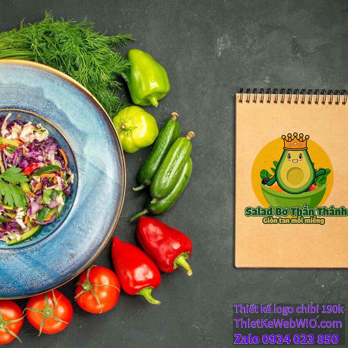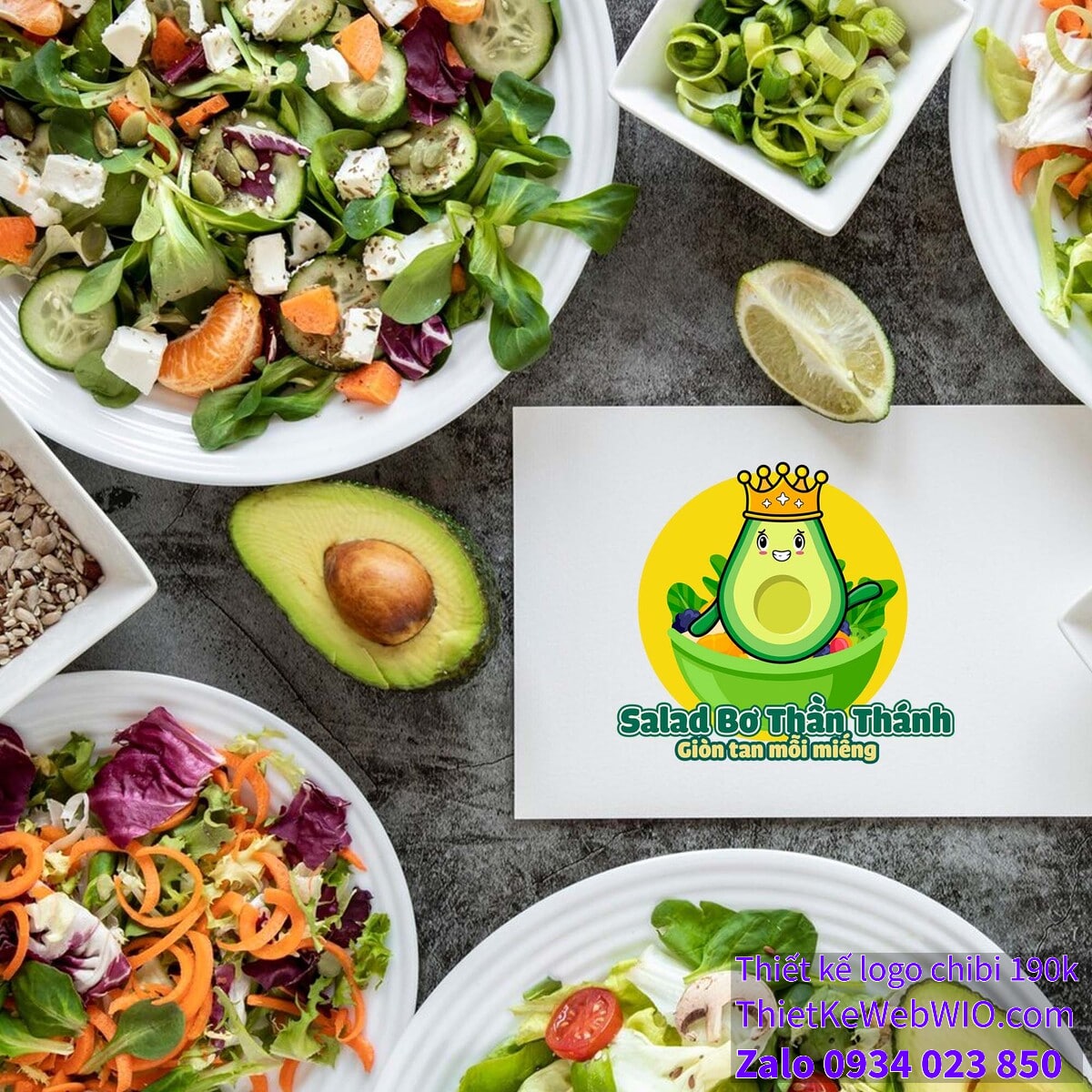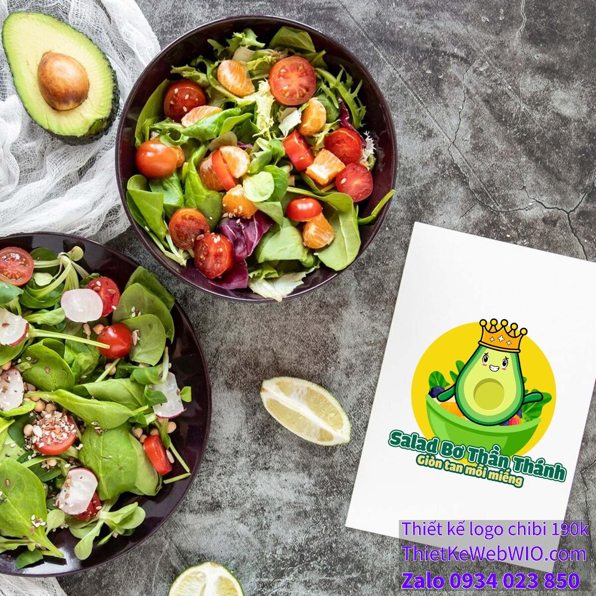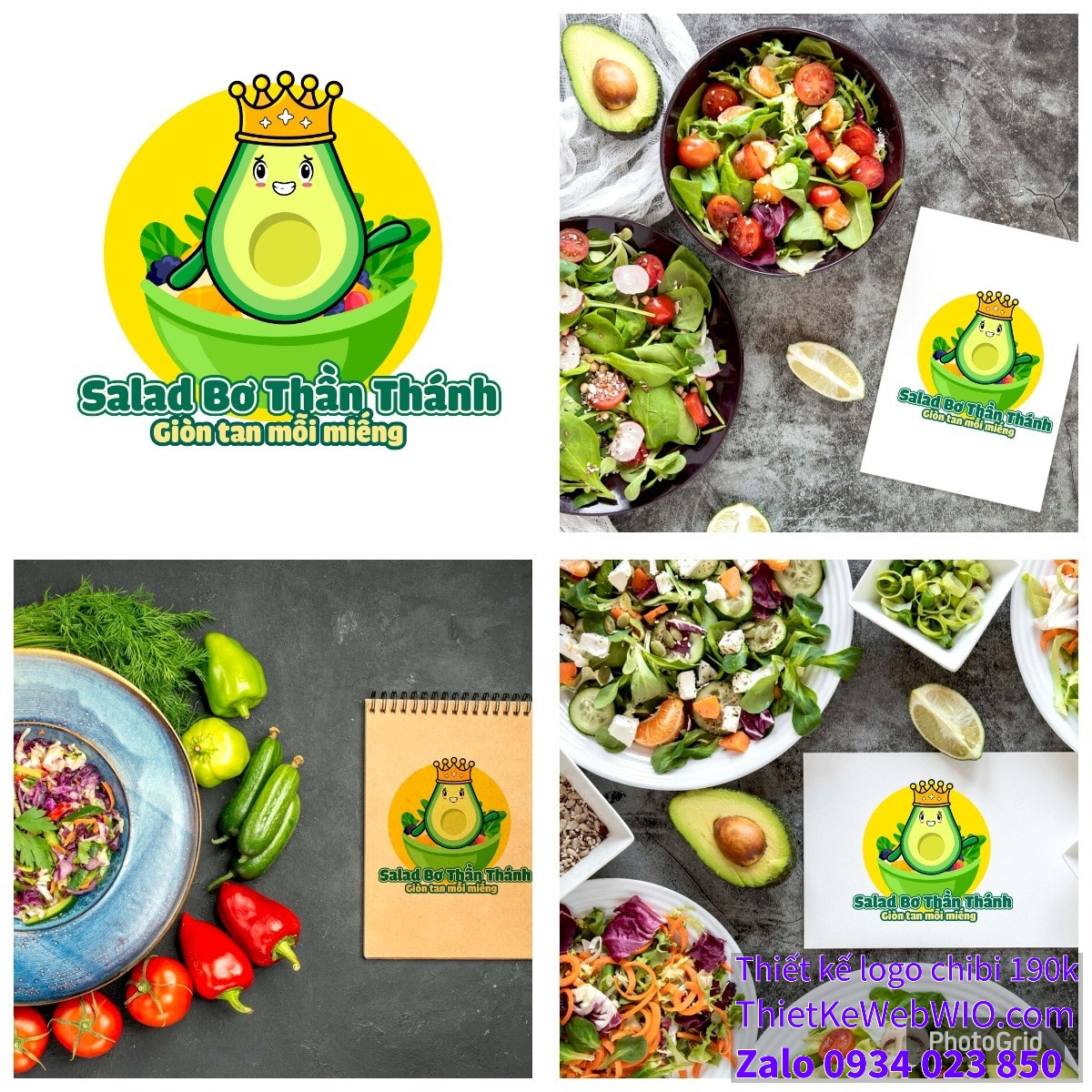 - Văn bản: Dưới hình ảnh chibi quả bơ đội vương miện đang ngồi trên đĩa salad là dòng chữ “Salad Bơ Thần Thánh” với kiểu chữ lớn, đậm và màu xanh lá cây. Phía dưới đó là câu slogan “Giòn tan mỗi miếng” với phông chữ nhỏ hơn, màu vàng, tạo điểm nhấn và làm nổi bật thông điệp của sản phẩm.